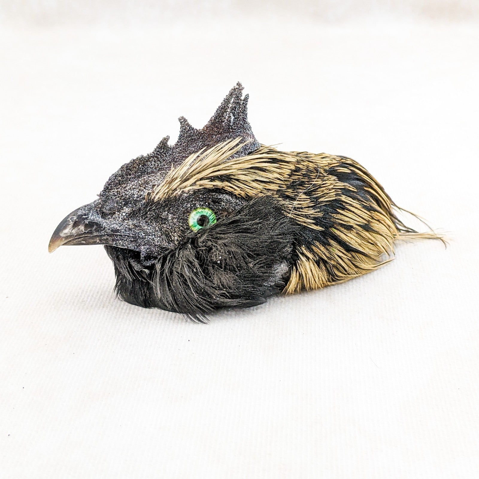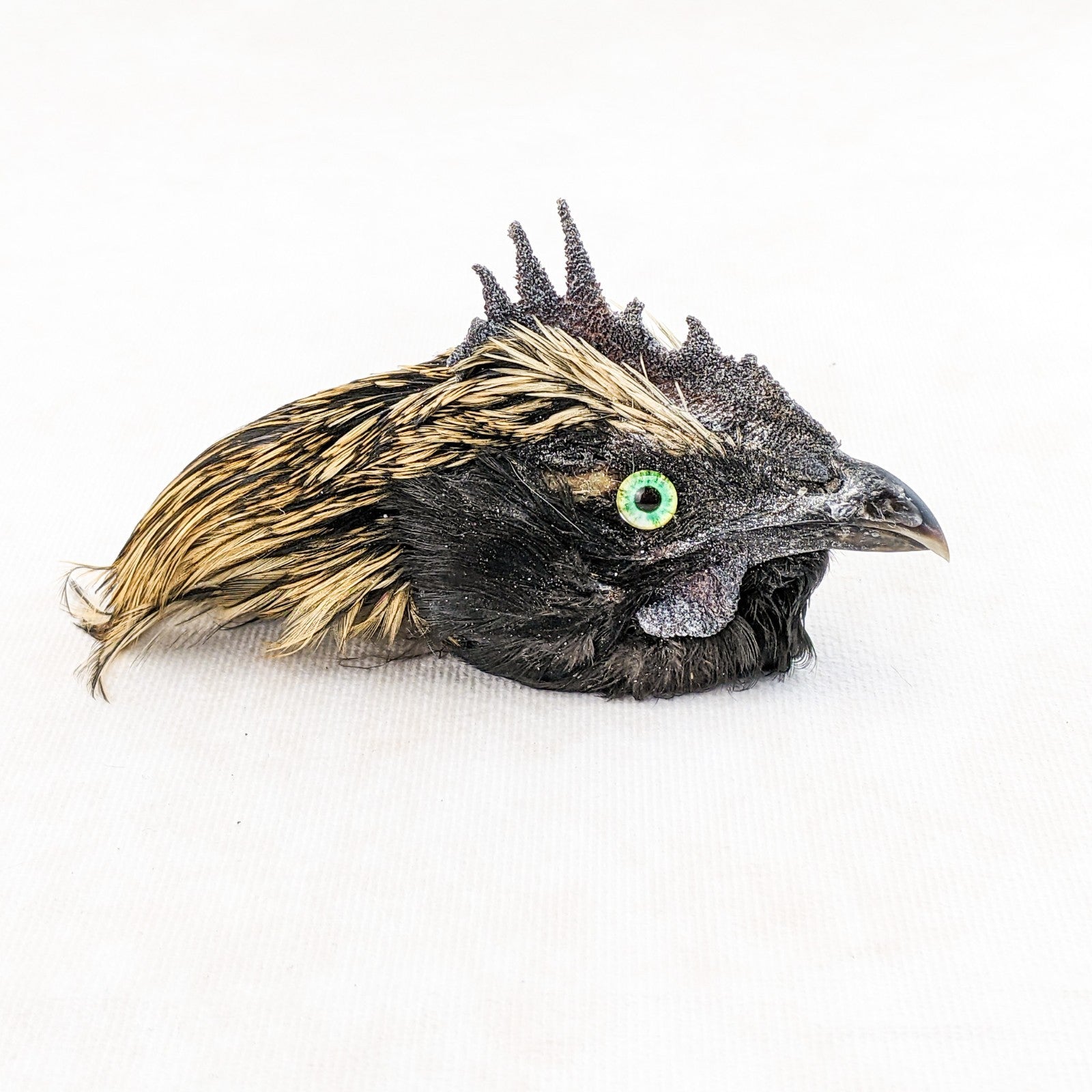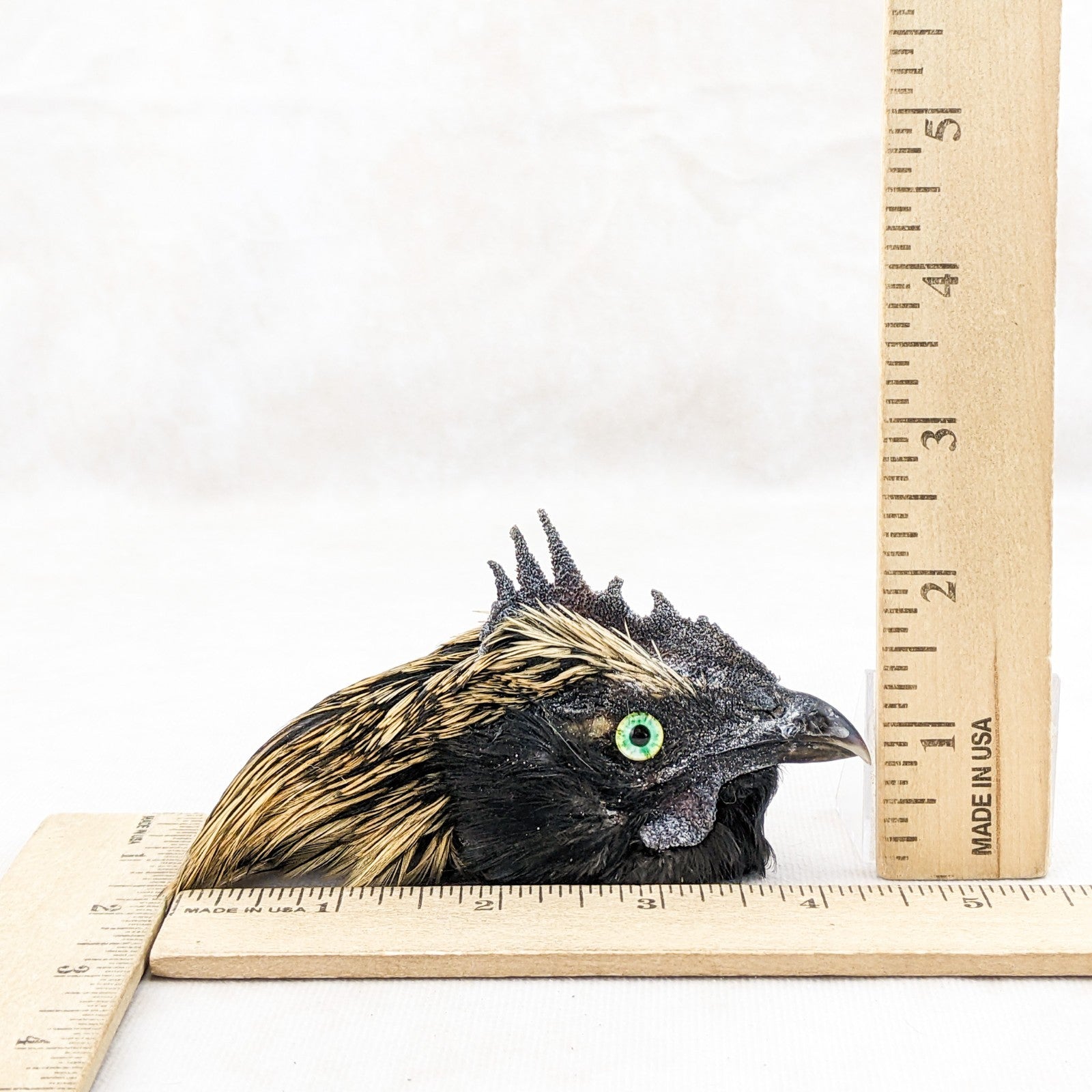 P44g #4  This is a taxidermy Chicken Rooster head Mount that can be used for crafting or just display on its own. This display is approx. 4 1/2 x 1 1/2  x 2 1/2" with feathers and shows nicely with beautiful feathers!  Would be great for any collection. This is the exact one you receive so please check out pictures for further description!