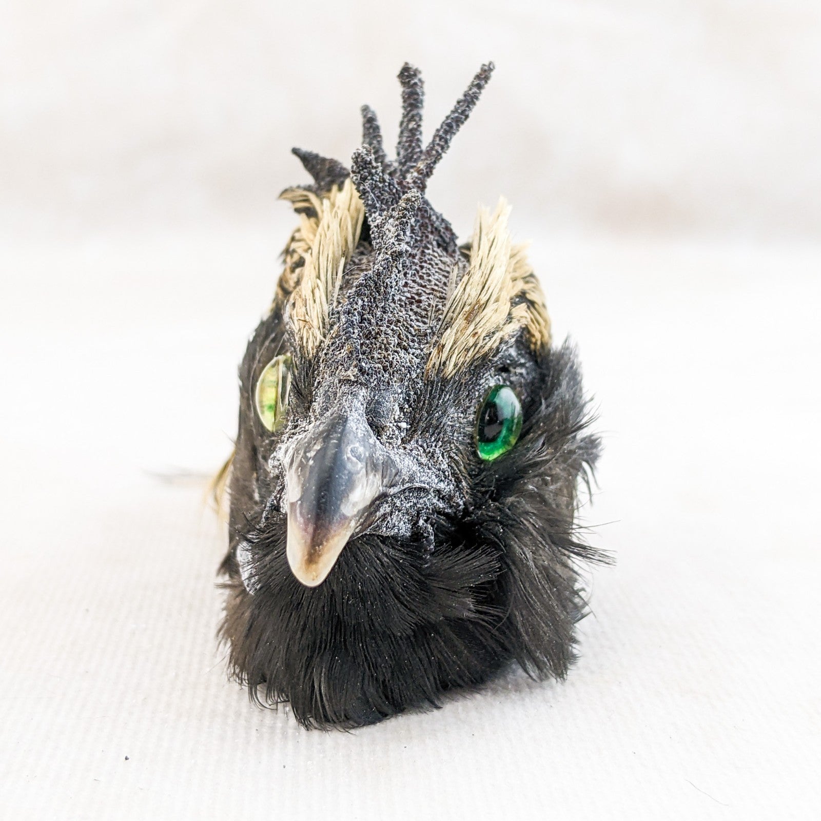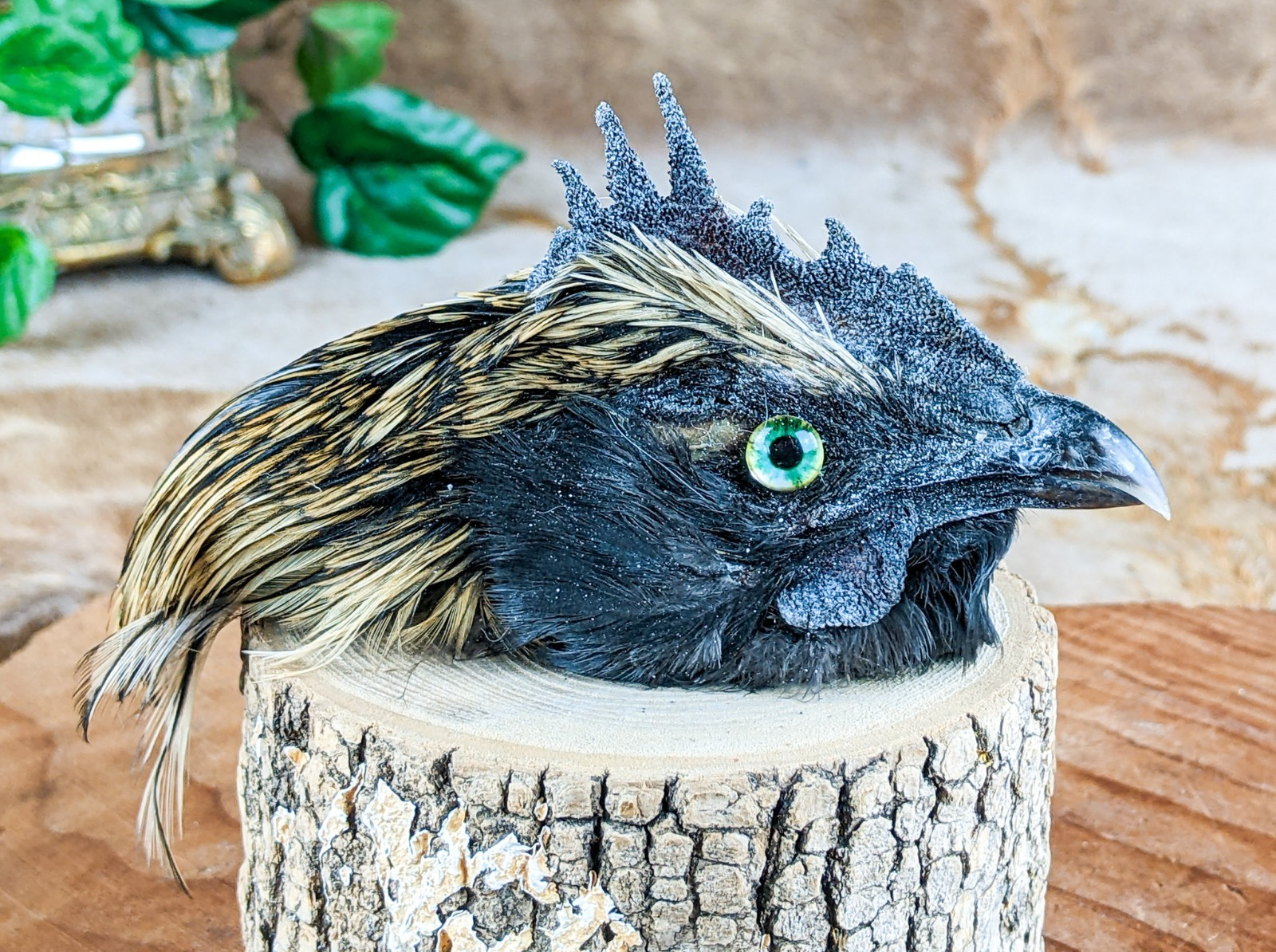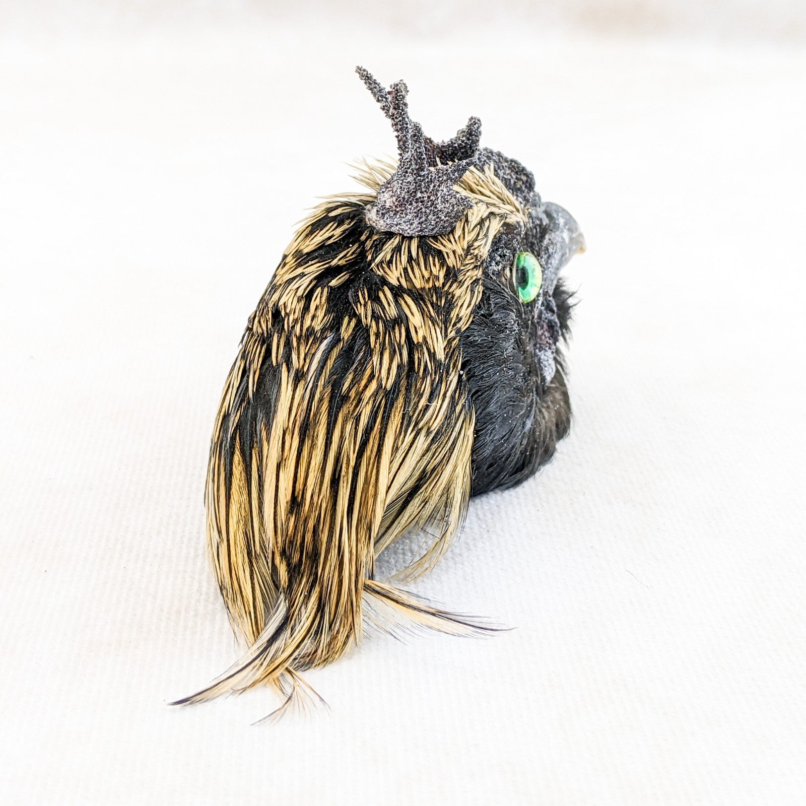 P44g #4  This is a taxidermy Chicken Rooster head Mount that can be used for crafting or just display on its own. This display is approx. 4 1/2 x 1 1/2  x 2 1/2" with feathers and shows nicely with beautiful feathers!  Would be great for any collection. This is the exact one you receive so please check out pictures for further description!