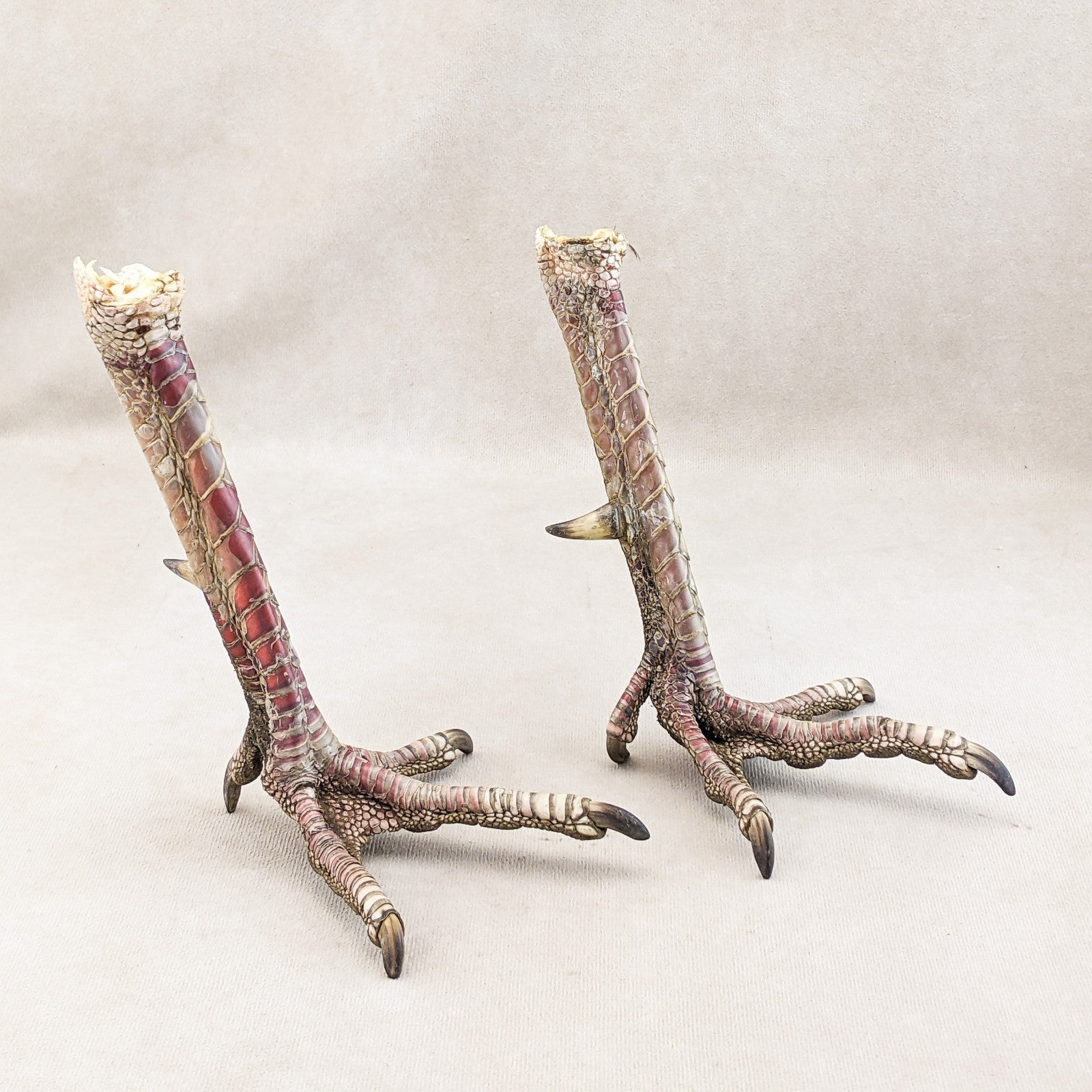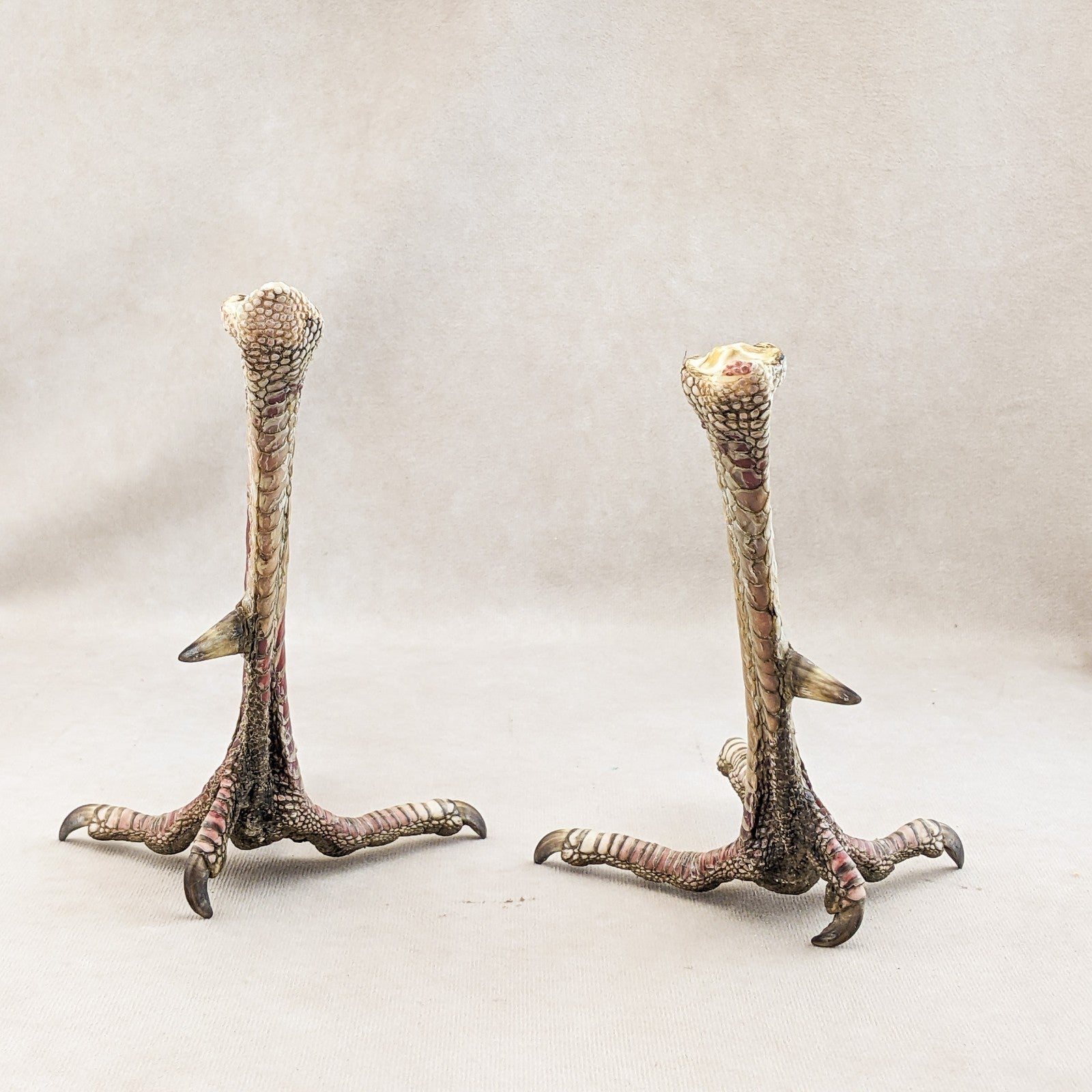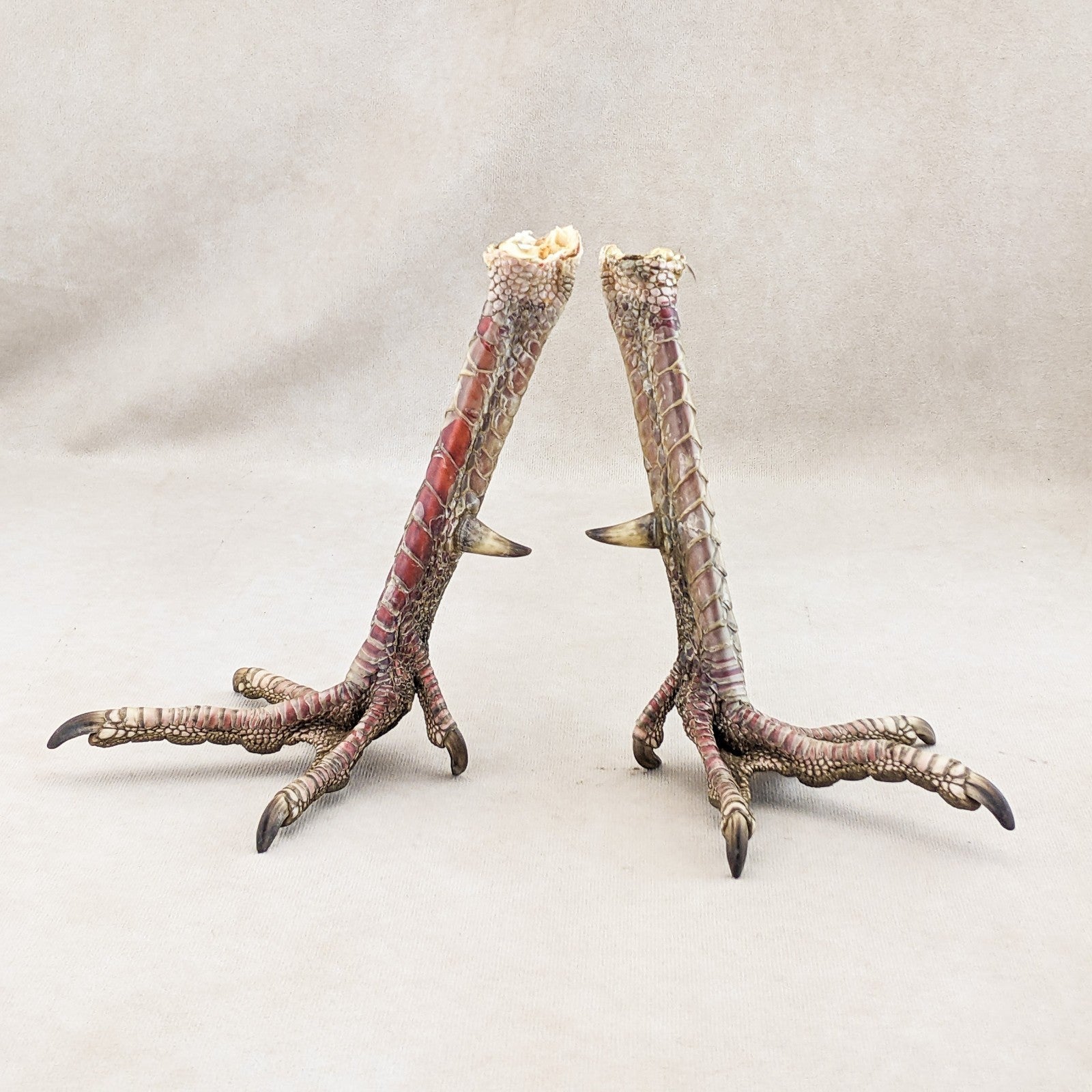 U37d #8 Matching spurred pair (1") of spread preserved turkey legs for crafts, taxidermy, spells, education, collection, display, Dog training/treats or whatever you would like to use them for. They are approx. 9 1/2 tall overall 8" leaning x 5 1/4 x 5" and 1 to 1" spurs.