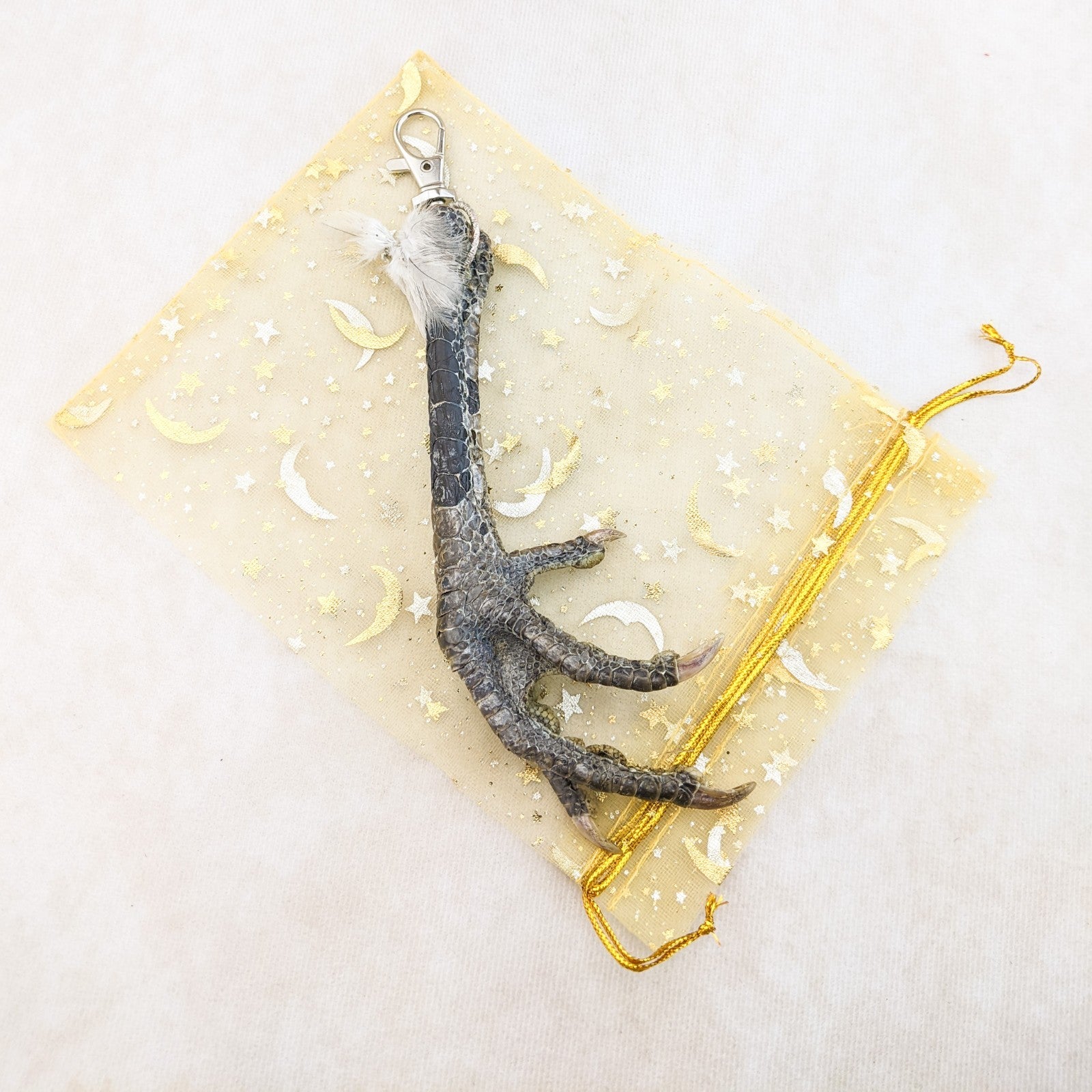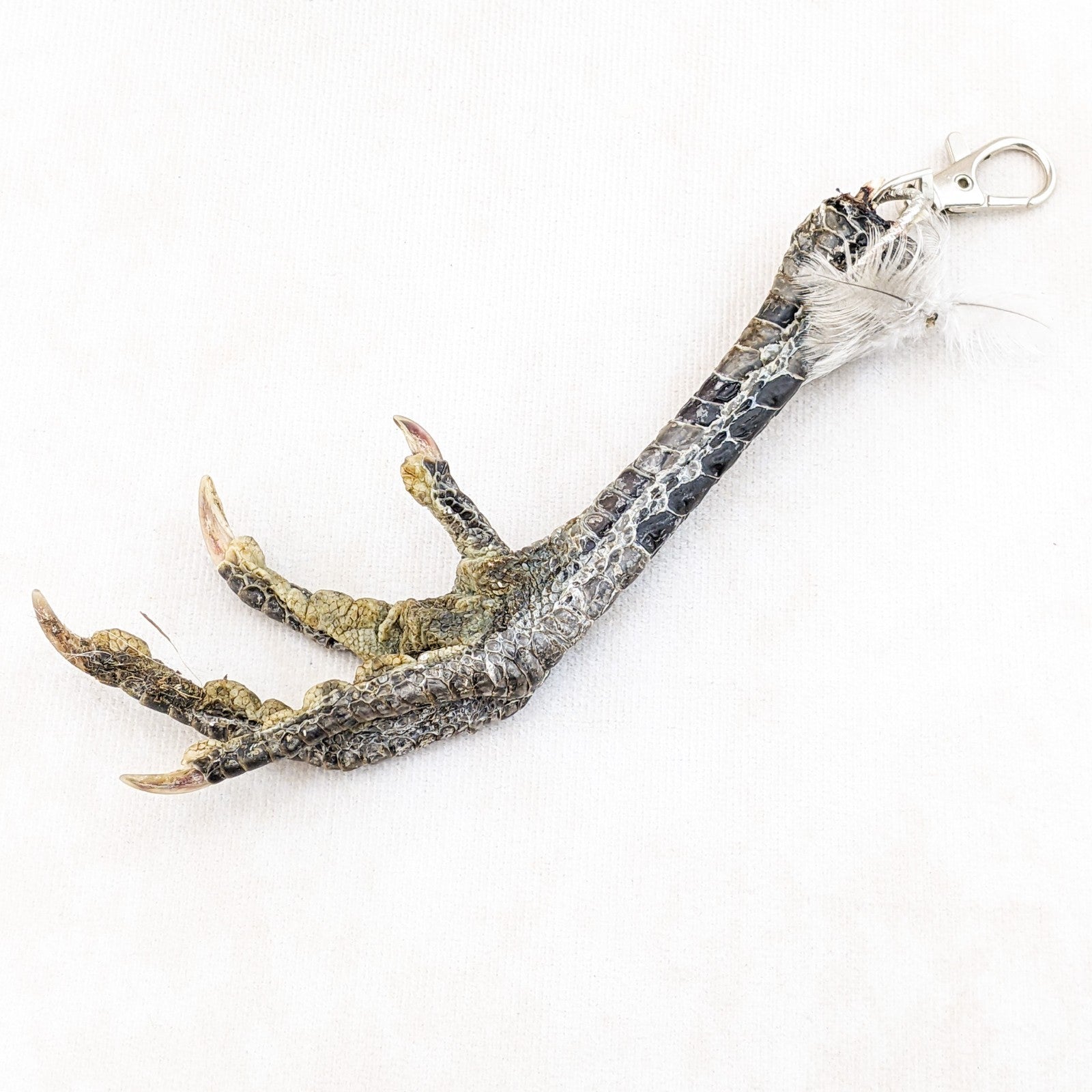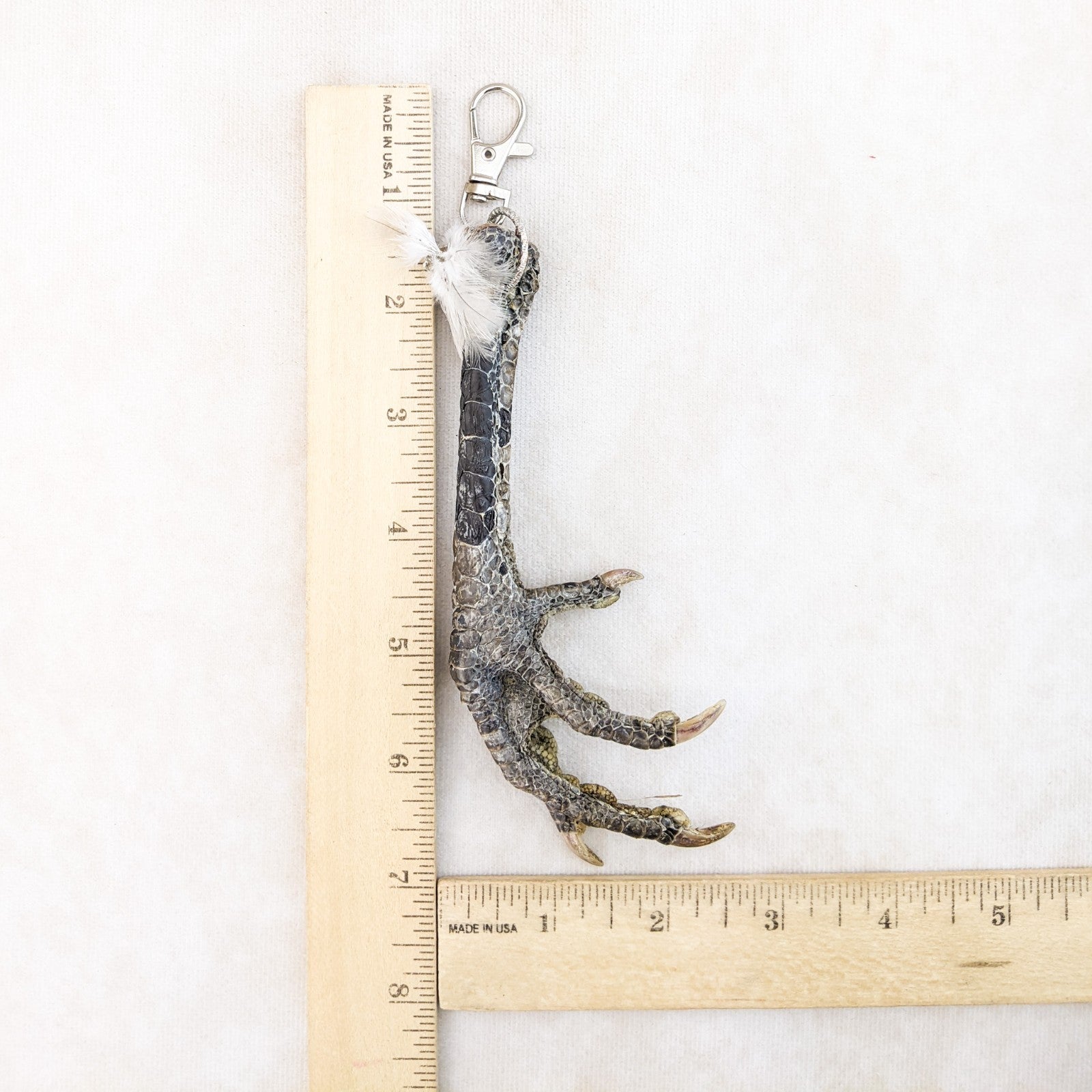This is a creepy taxidermy chicken foot on a keychain hook and would make a great talisman! Would work nicely for your favorite farmer as well. Wonderful gag gift and great gift for those "odd" friends! This is the actual one you will receive. approx 7 x 2 1/2" with the keychain hook.