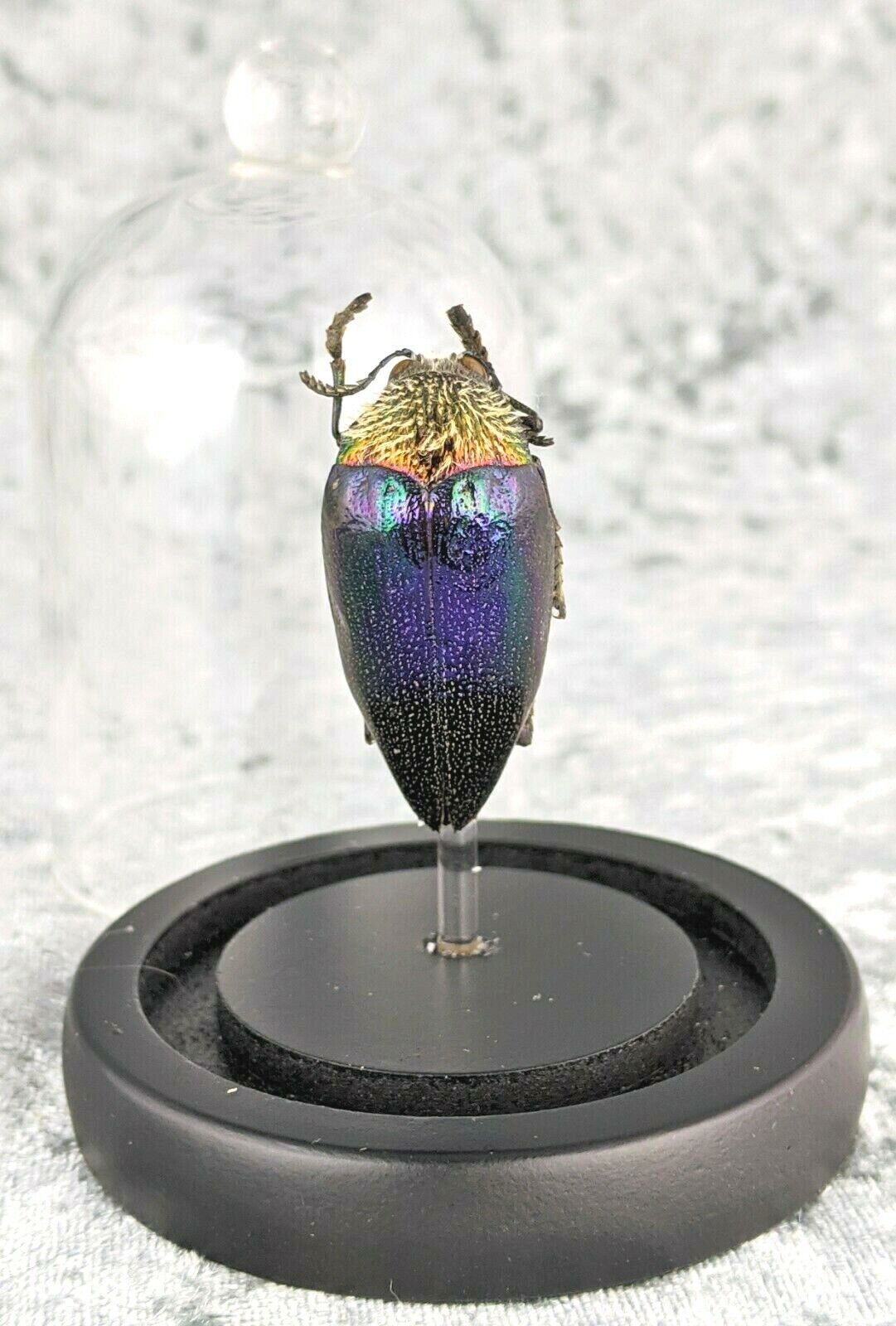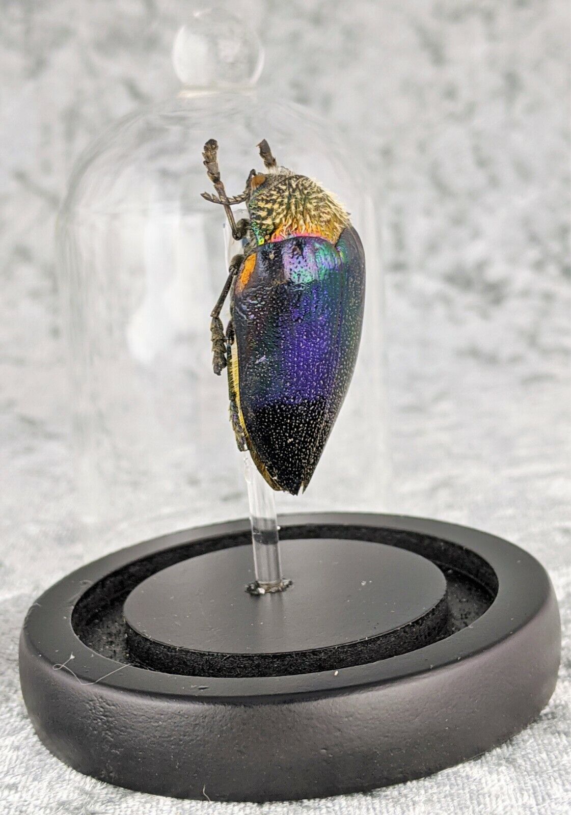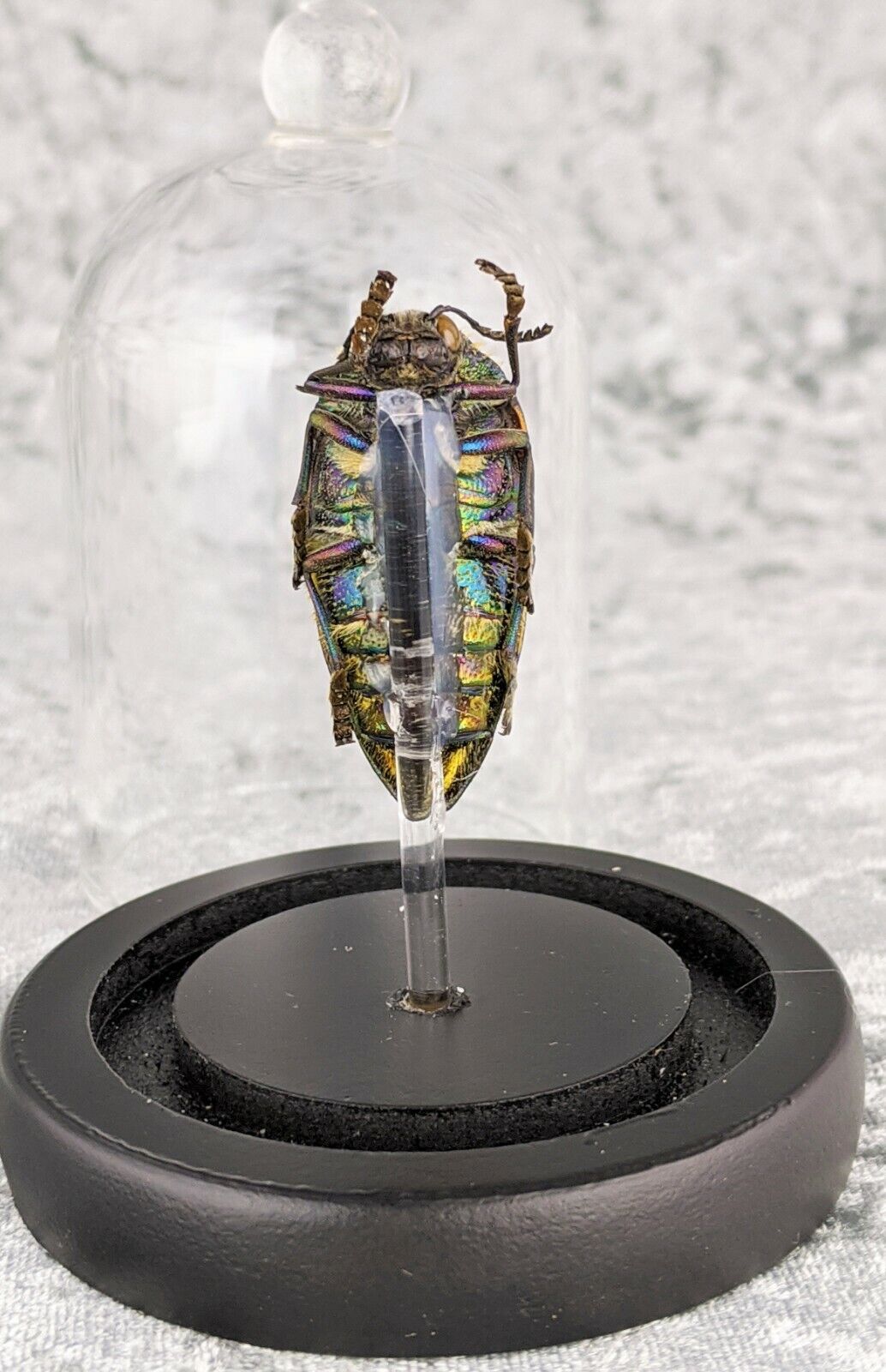 G45b #  The pictures do not do this justice, this is a very colorful beetle!  This is a Large Sternocera Pulchra Fisheri Beetle showcased in a glass dome display.  This display is approx. 3 1/2 x 3" and is covered with a glass dome with gray/black dappled wood base, it really shows the colors in the beetle.  This is a beautiful beetle and would be a great addition to any collection or great for classroom educational purposes as well!  These beetles are so beautiful that they are sometimes called Jewel beetles.