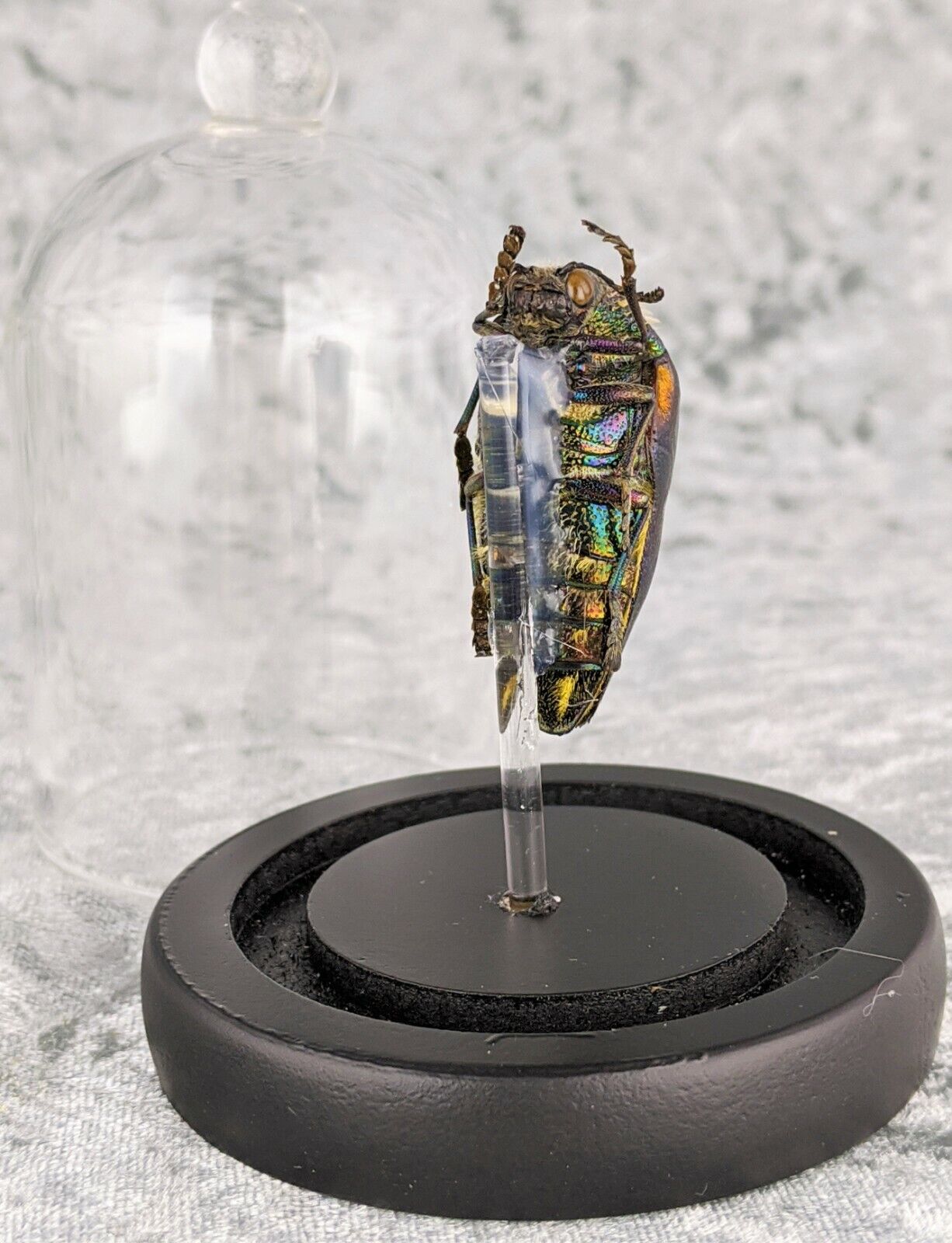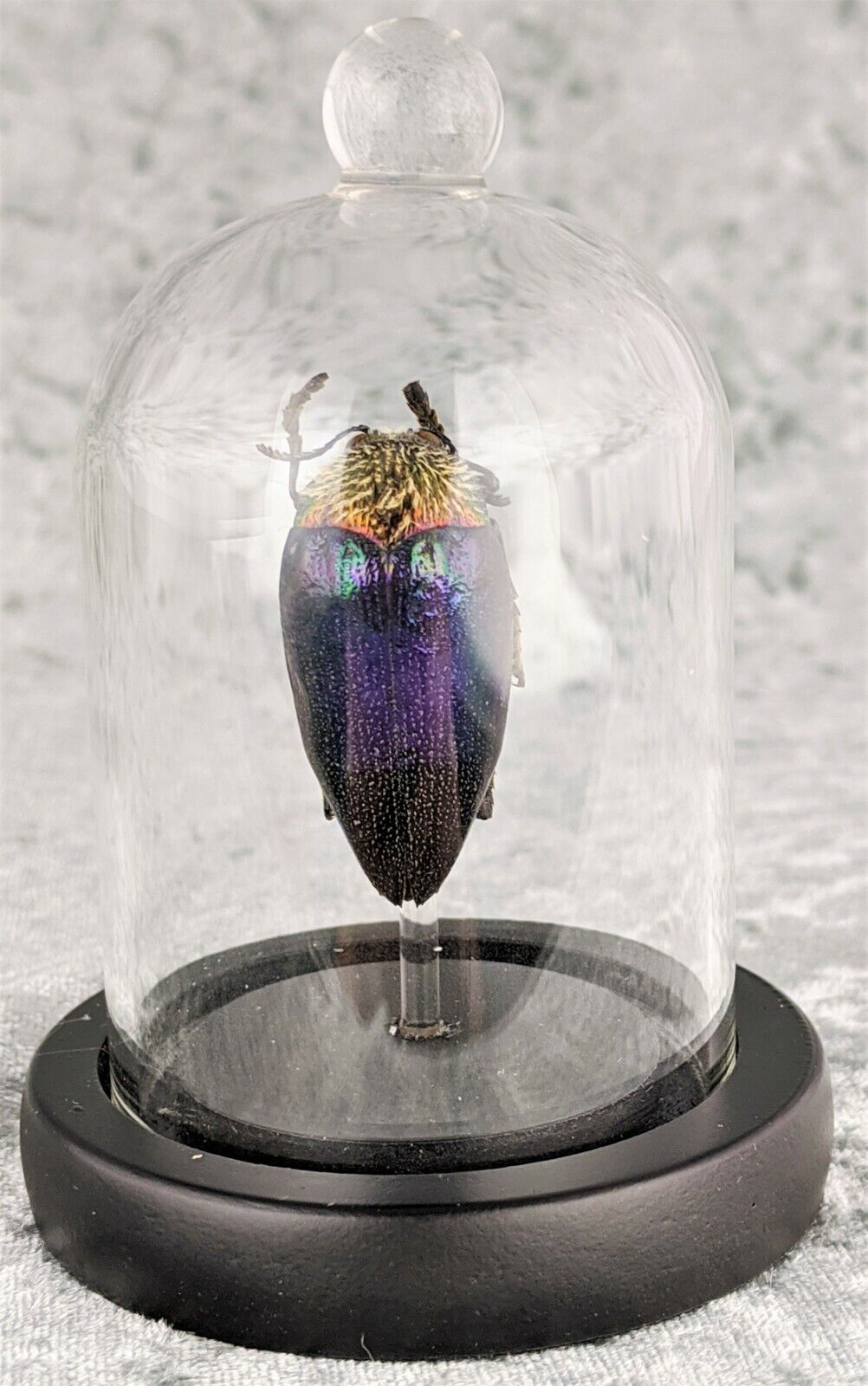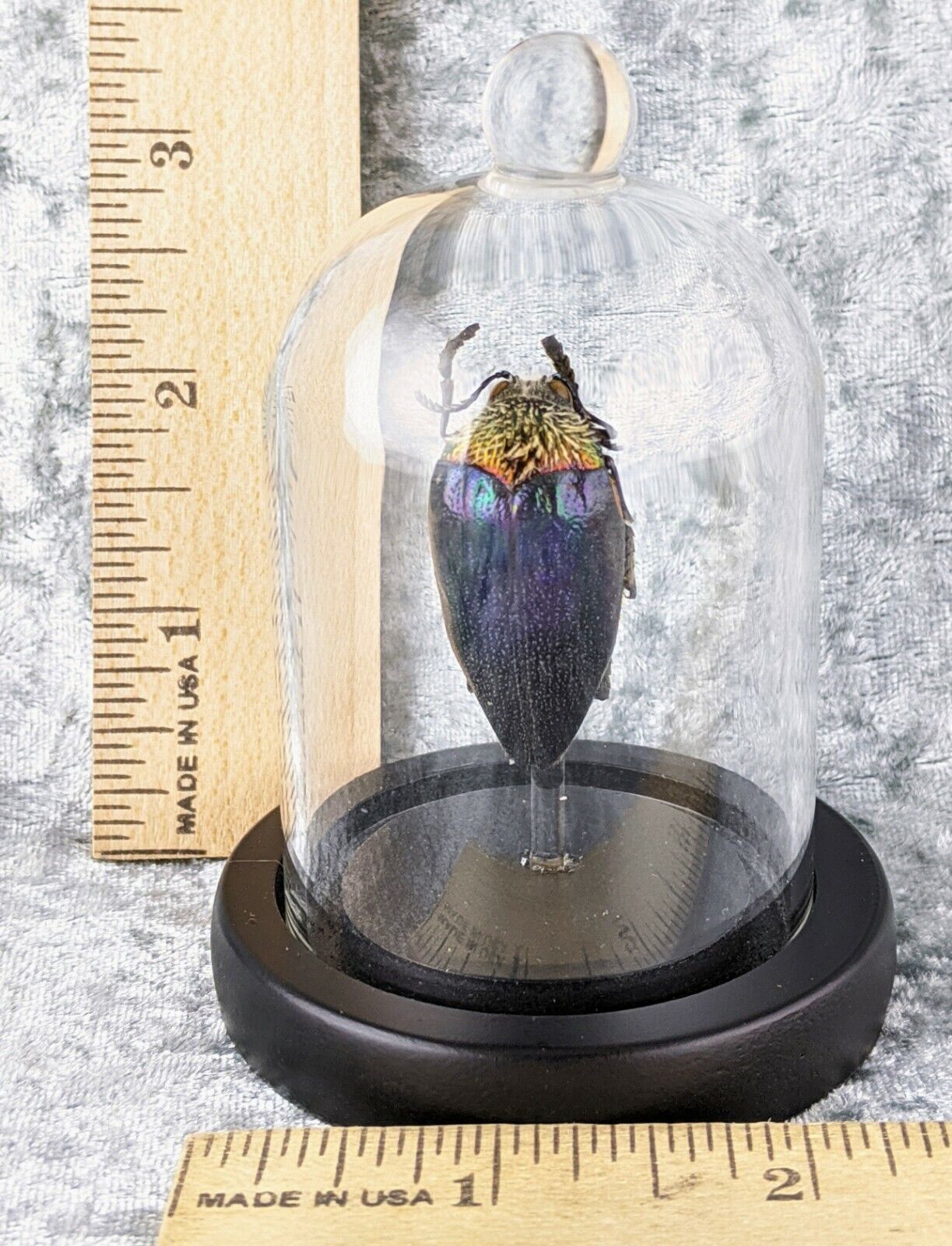 G45b #  The pictures do not do this justice, this is a very colorful beetle!  This is a Large Sternocera Pulchra Fisheri Beetle showcased in a glass dome display.  This display is approx. 3 1/2 x 3" and is covered with a glass dome with gray/black dappled wood base, it really shows the colors in the beetle.  This is a beautiful beetle and would be a great addition to any collection or great for classroom educational purposes as well!  These beetles are so beautiful that they are sometimes called Jewel beetles.