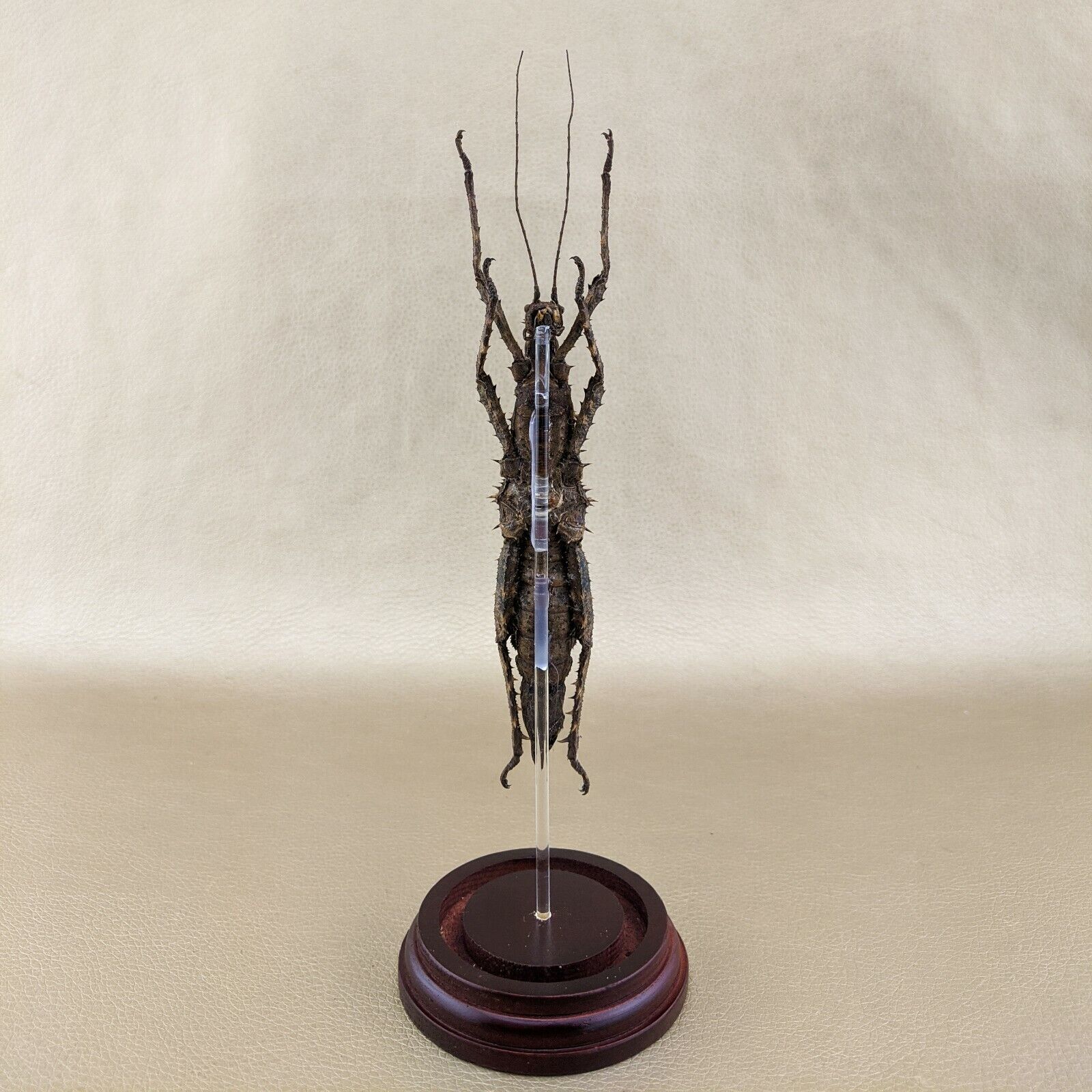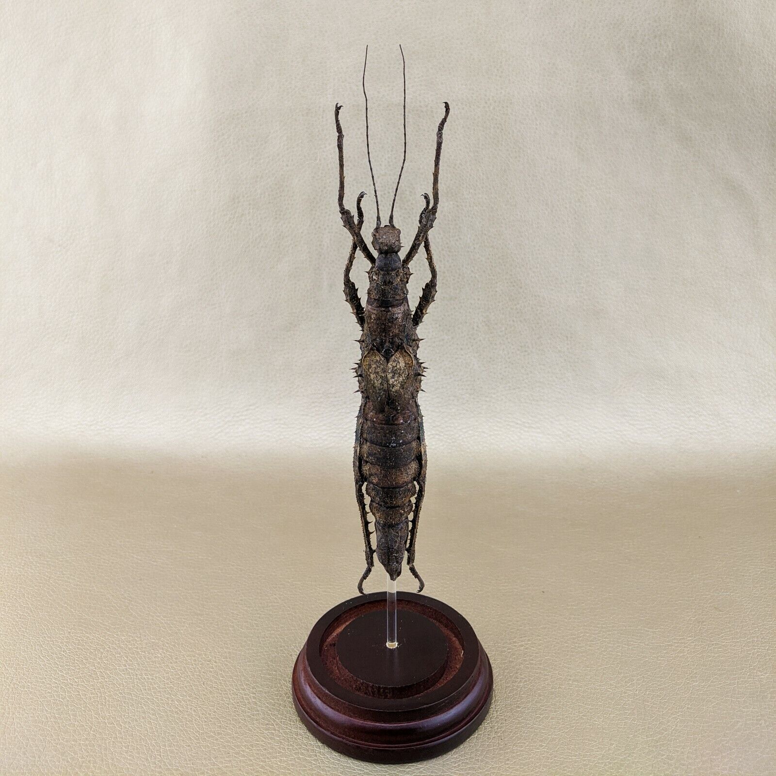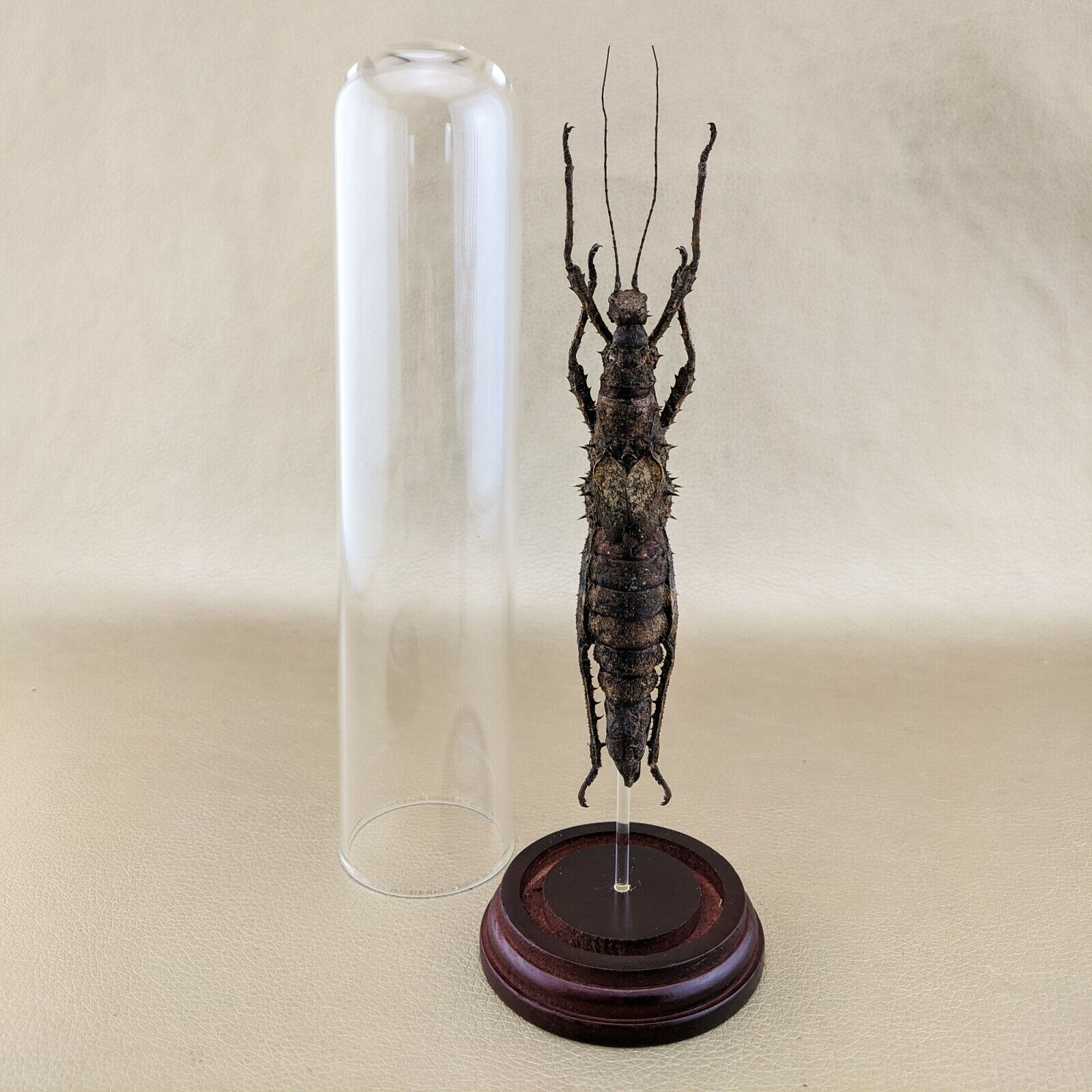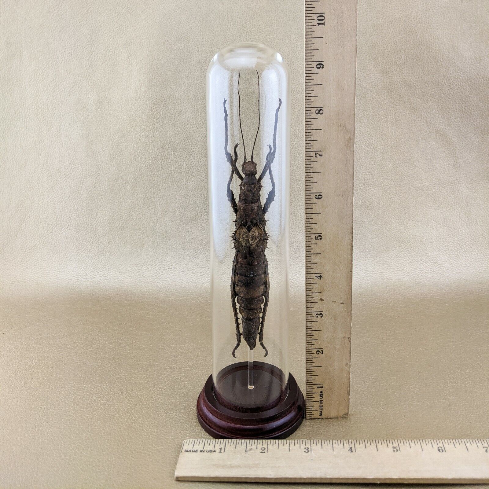 Q43b  #9  This is a very large and nice rare Prickly walking stick.  These guys are beautiful and interesting.  He is nicely  showcased in a glass dome with a wood base and would be a great addition to any collection as well as great conversation piece!  Put him down on the table in front of people and watch their reaction!  The display is approx. 9 1/2 x 3" and the dome will keep him safe and clean for years to come.  The dome is removable as well.
