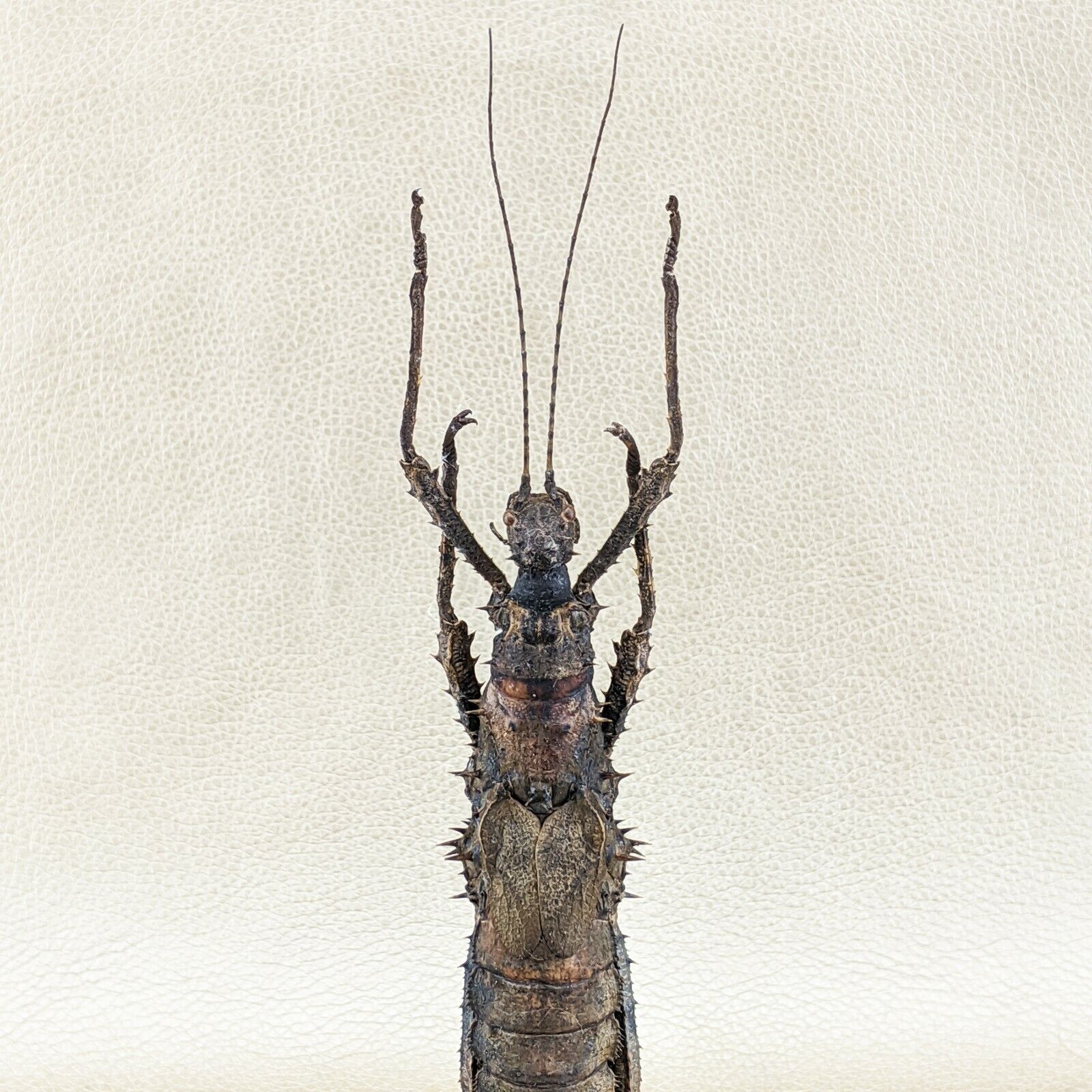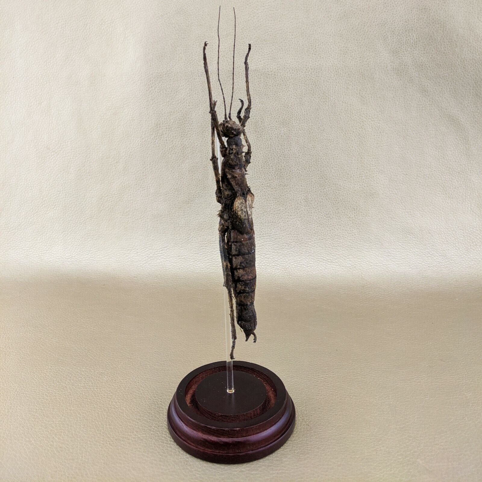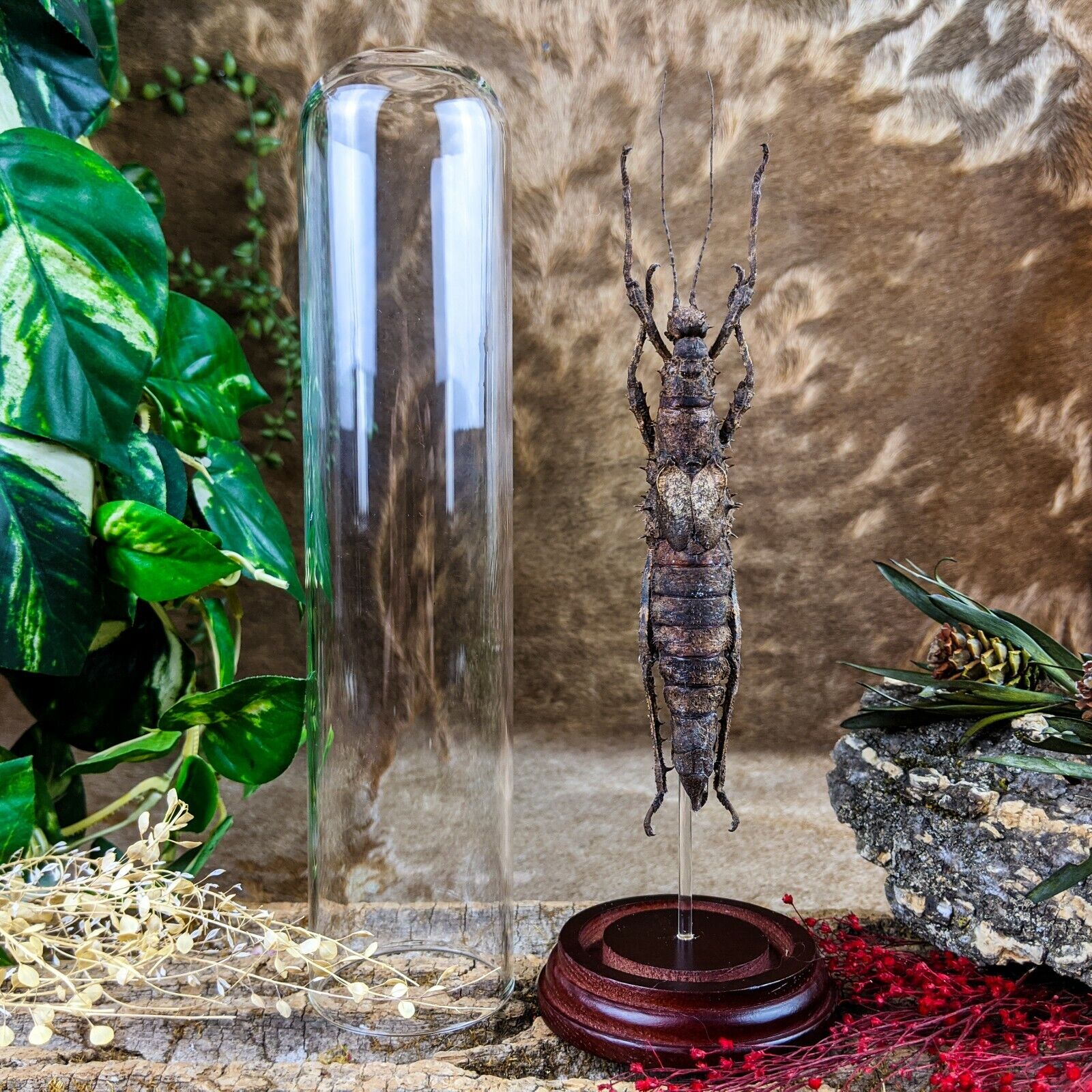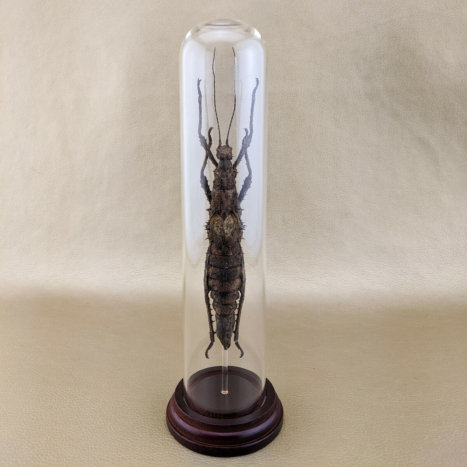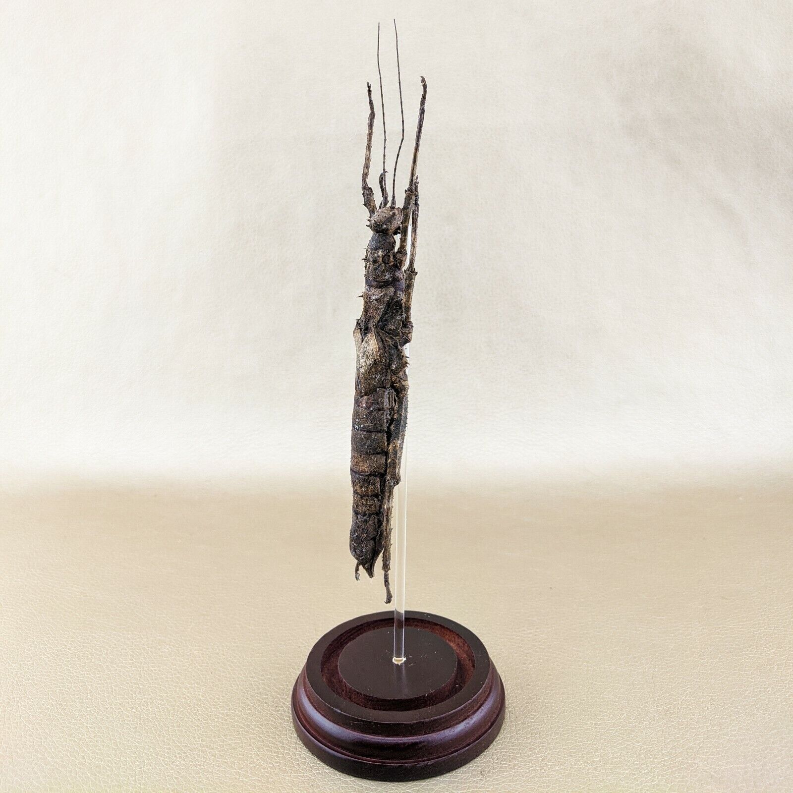 Q43b  #9  This is a very large and nice rare Prickly walking stick.  These guys are beautiful and interesting.  He is nicely  showcased in a glass dome with a wood base and would be a great addition to any collection as well as great conversation piece!  Put him down on the table in front of people and watch their reaction!  The display is approx. 9 1/2 x 3" and the dome will keep him safe and clean for years to come.  The dome is removable as well.