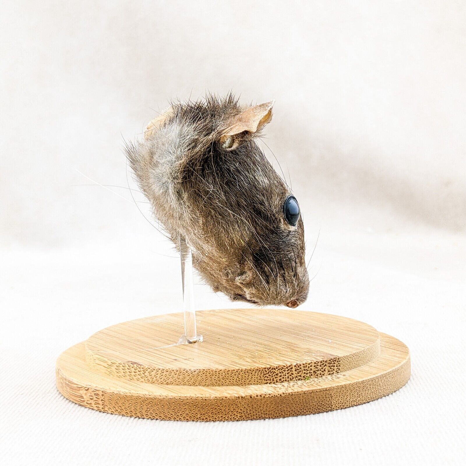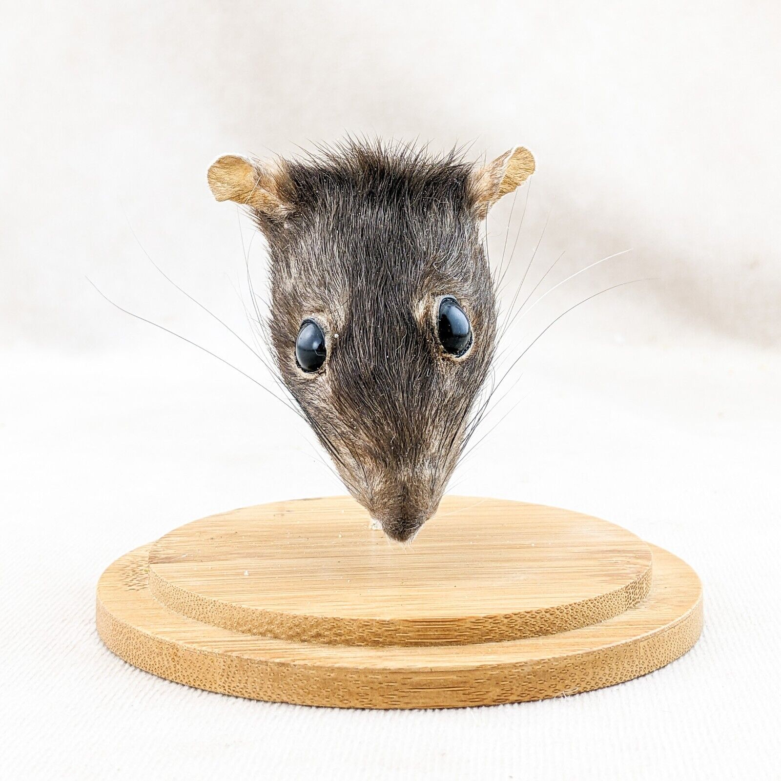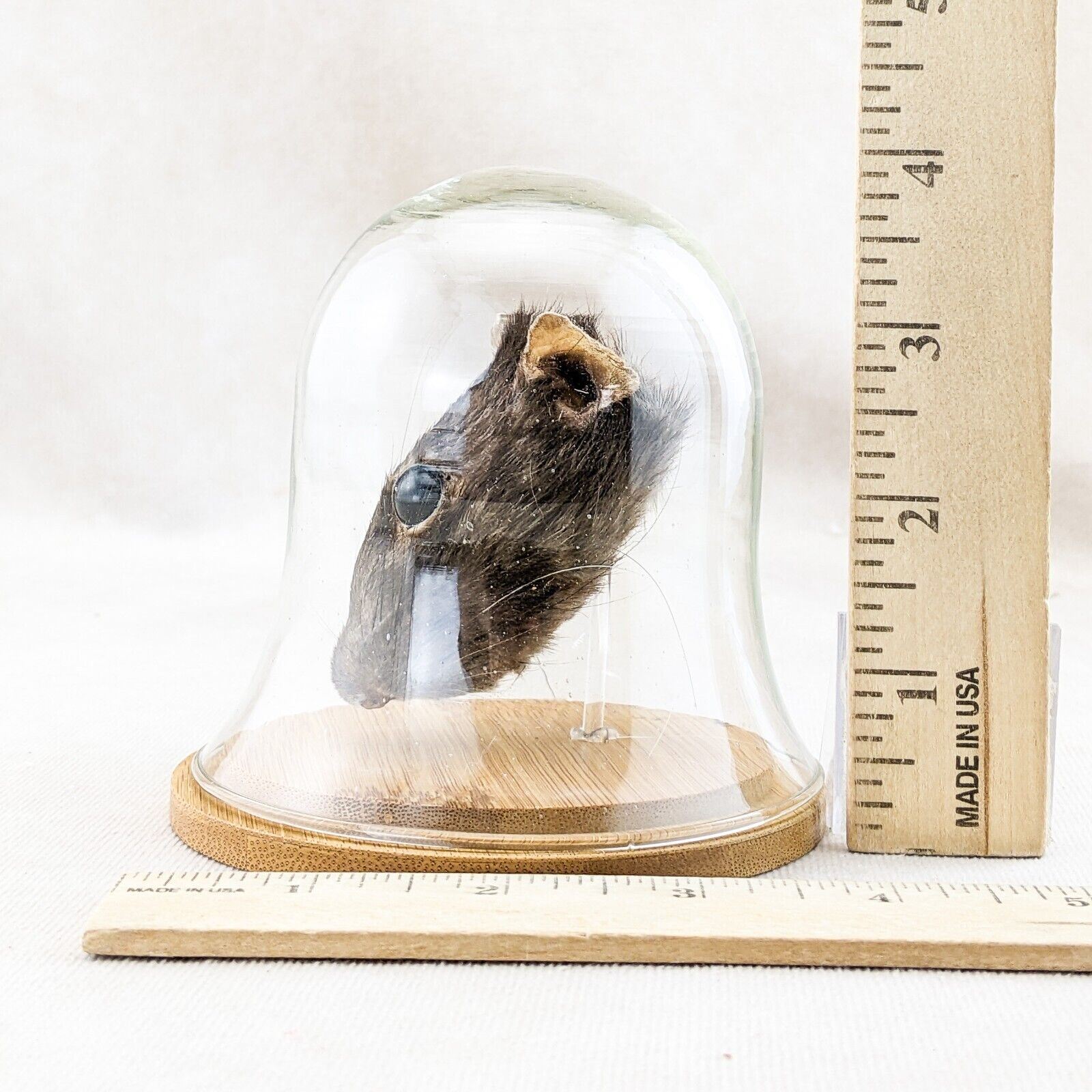 This is a nicely Displayed Taxidermy Rat Head mount in a glass dome. He will add a bit of creepiness to your collection! Great Halloween Decor as well! Great addition to any collection. This display is approx. 4 1/4" x 4" with a glass dome top and wood base.