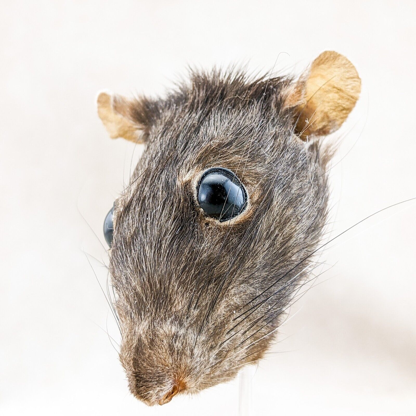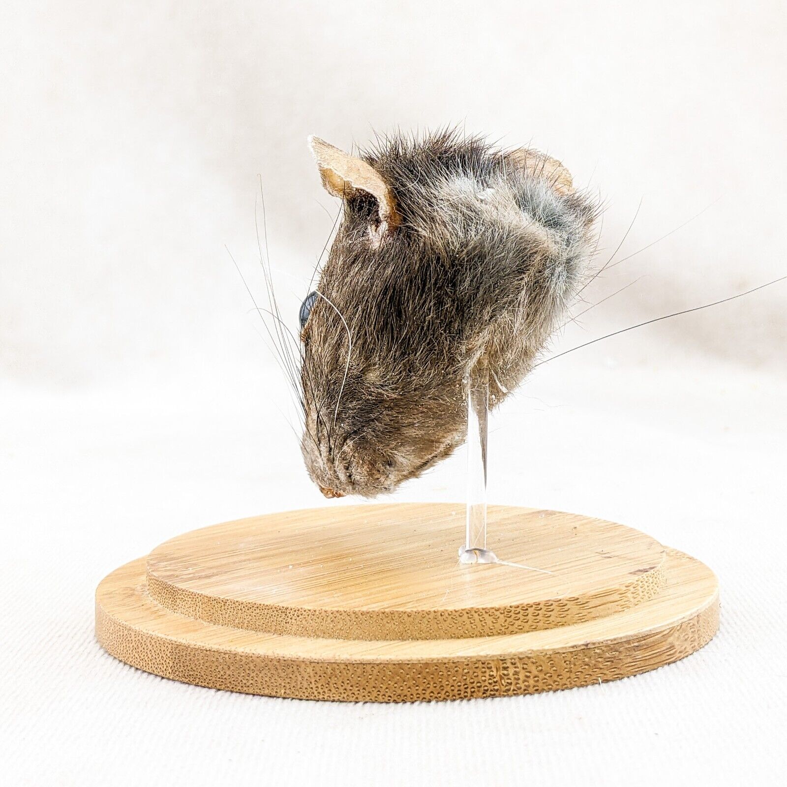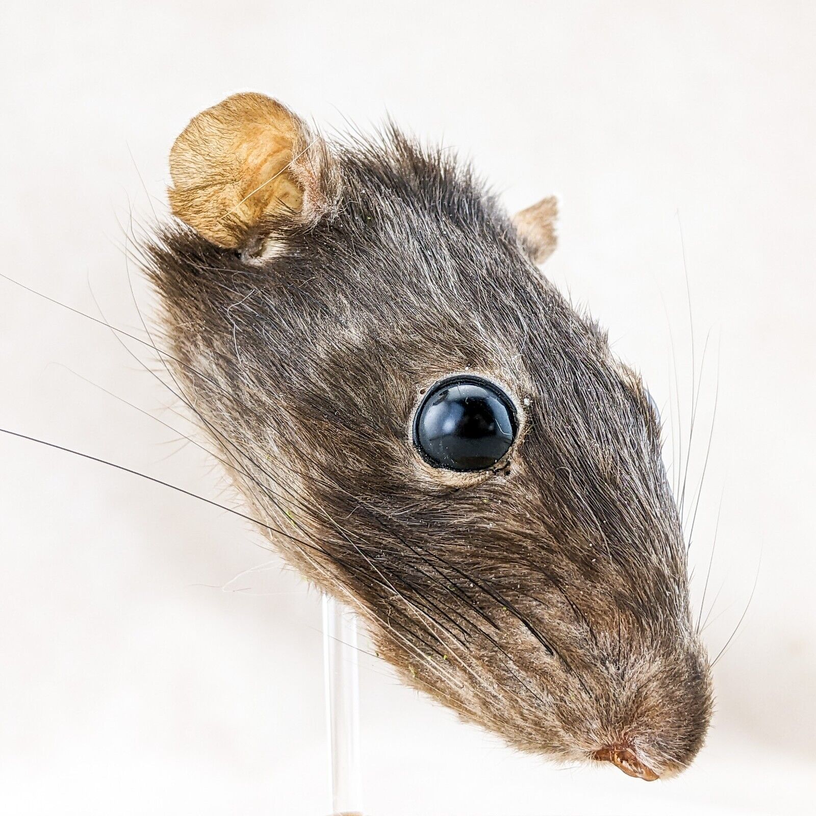 This is a nicely Displayed Taxidermy Rat Head mount in a glass dome. He will add a bit of creepiness to your collection! Great Halloween Decor as well! Great addition to any collection. This display is approx. 4 1/4" x 4" with a glass dome top and wood base.