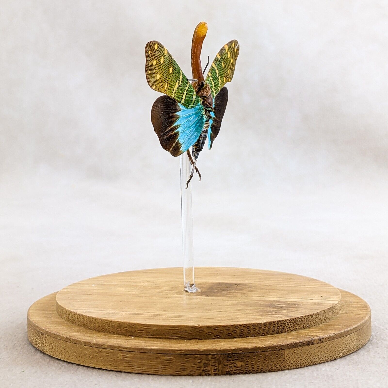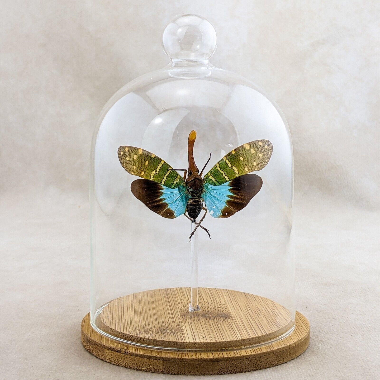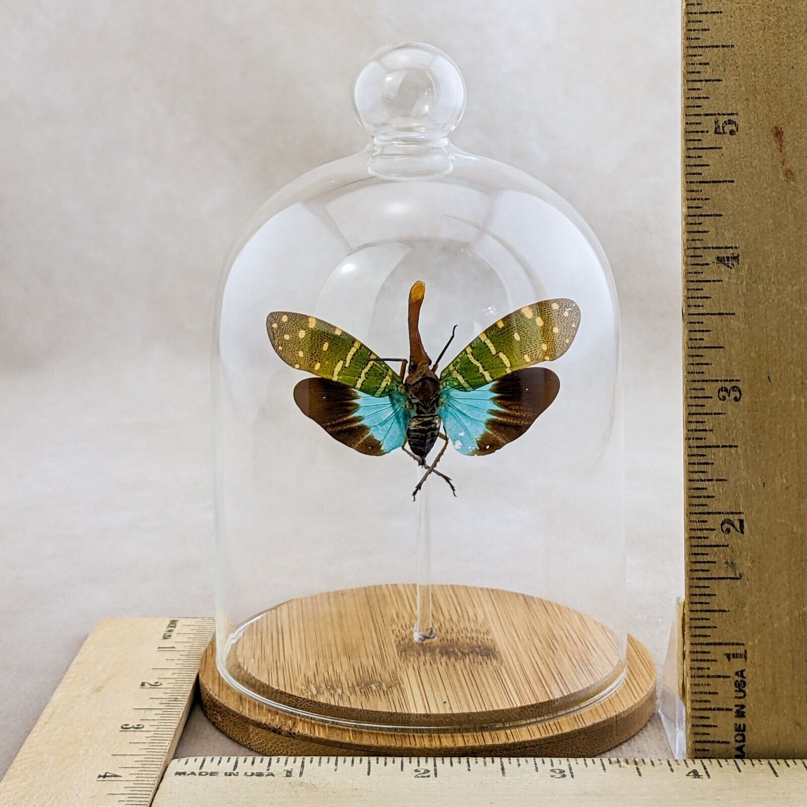 R7 #7 This is a wonderful specimen of a Pyrops Synavei Kallman Tan with its wings spread nicely showcased in a Glass Dome display with a wood bottom. This display is approx. 6 x 4". This would be a great addition to any collection, decor piece or gift!