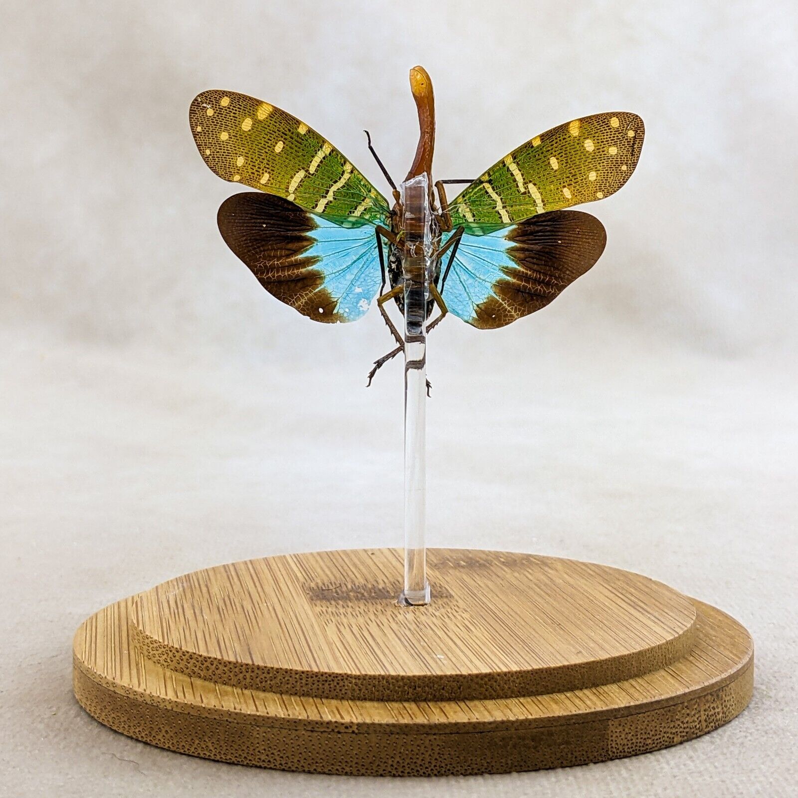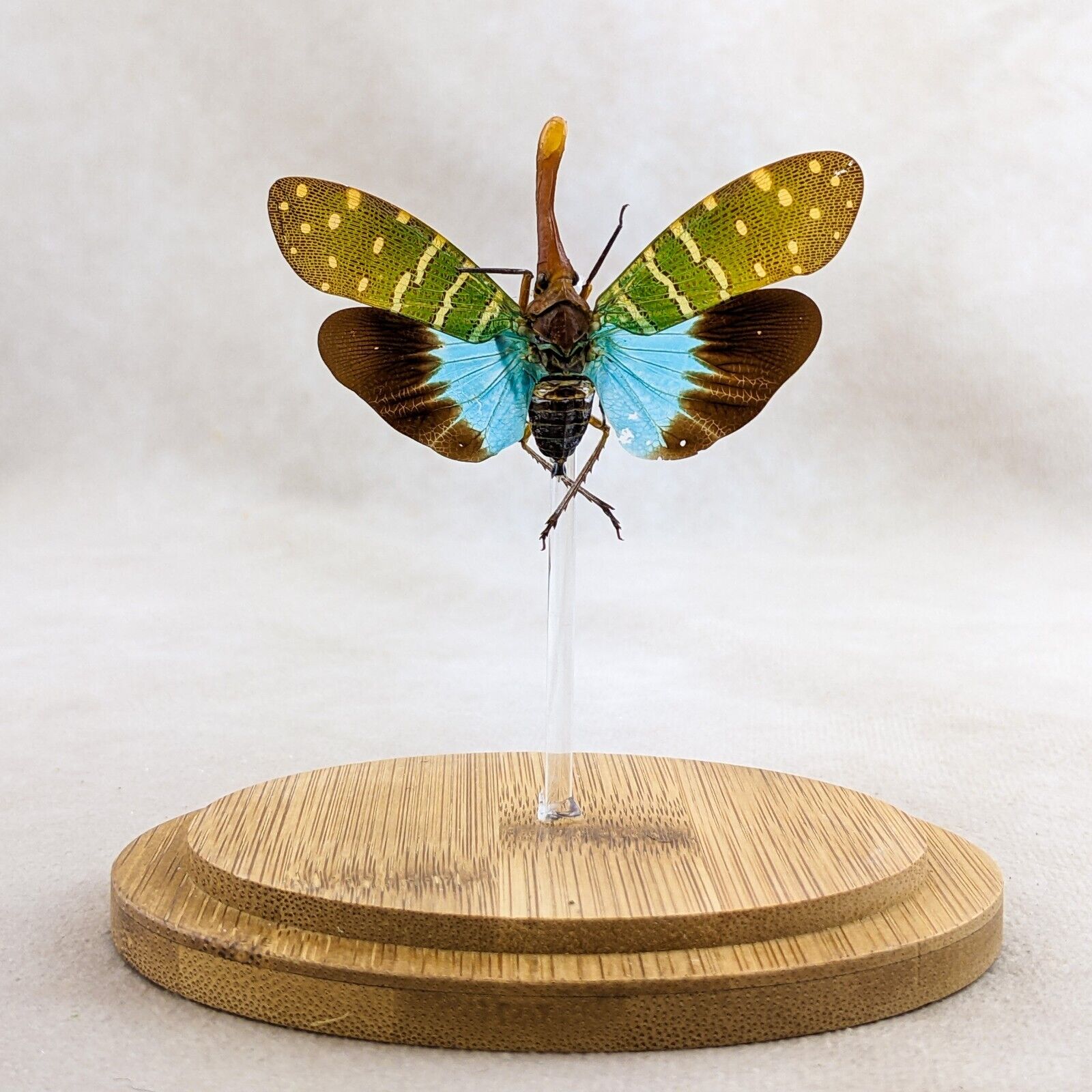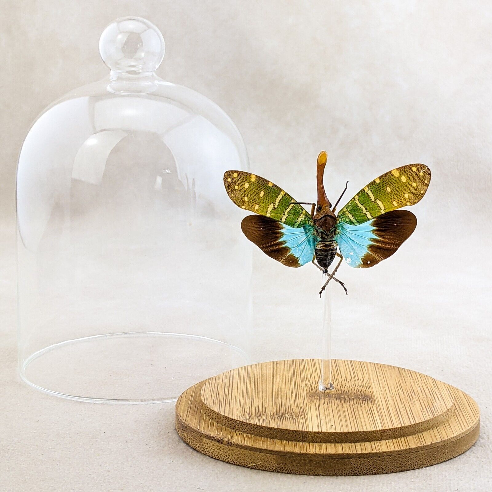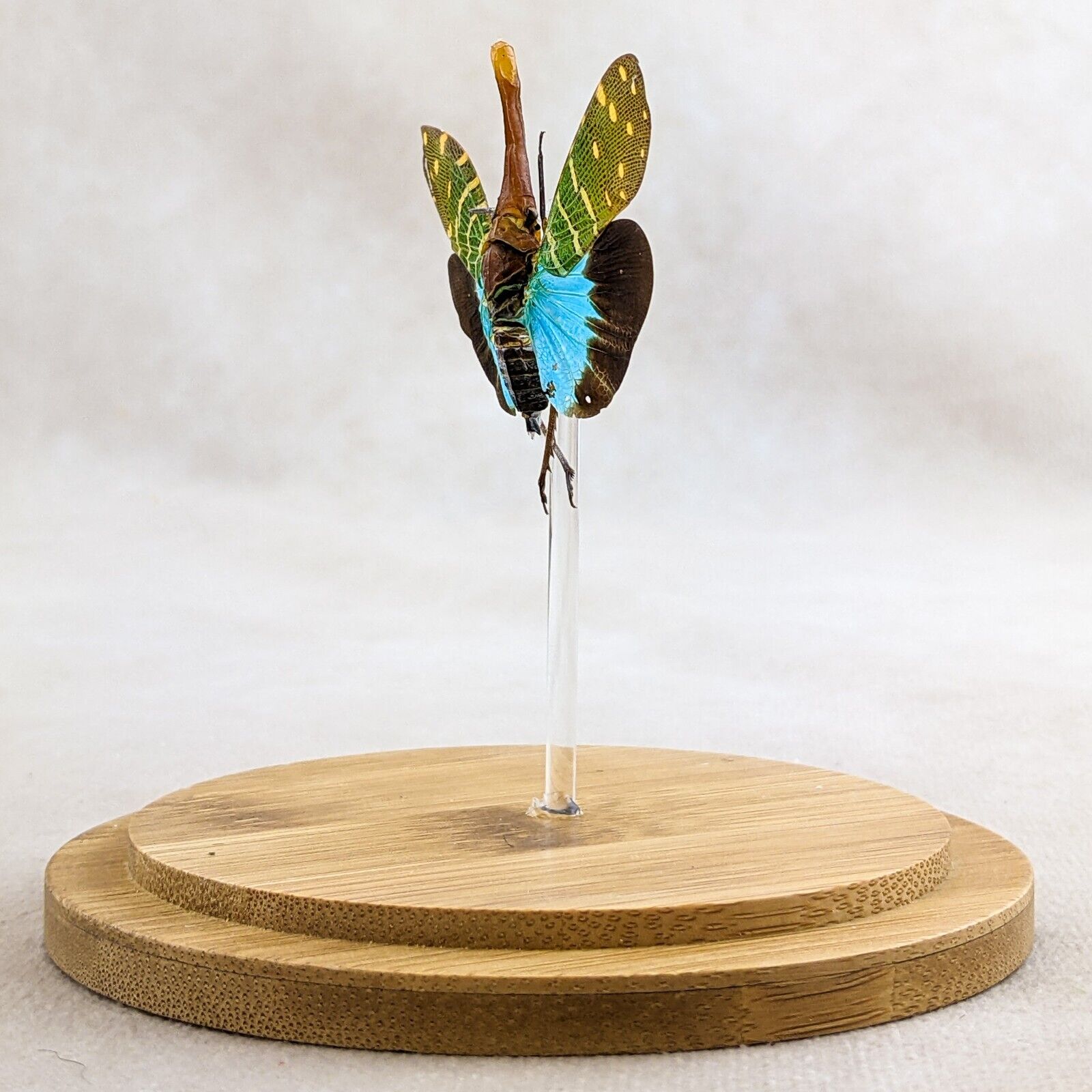 R7 #7 This is a wonderful specimen of a Pyrops Synavei Kallman Tan with its wings spread nicely showcased in a Glass Dome display with a wood bottom. This display is approx. 6 x 4". This would be a great addition to any collection, decor piece or gift!