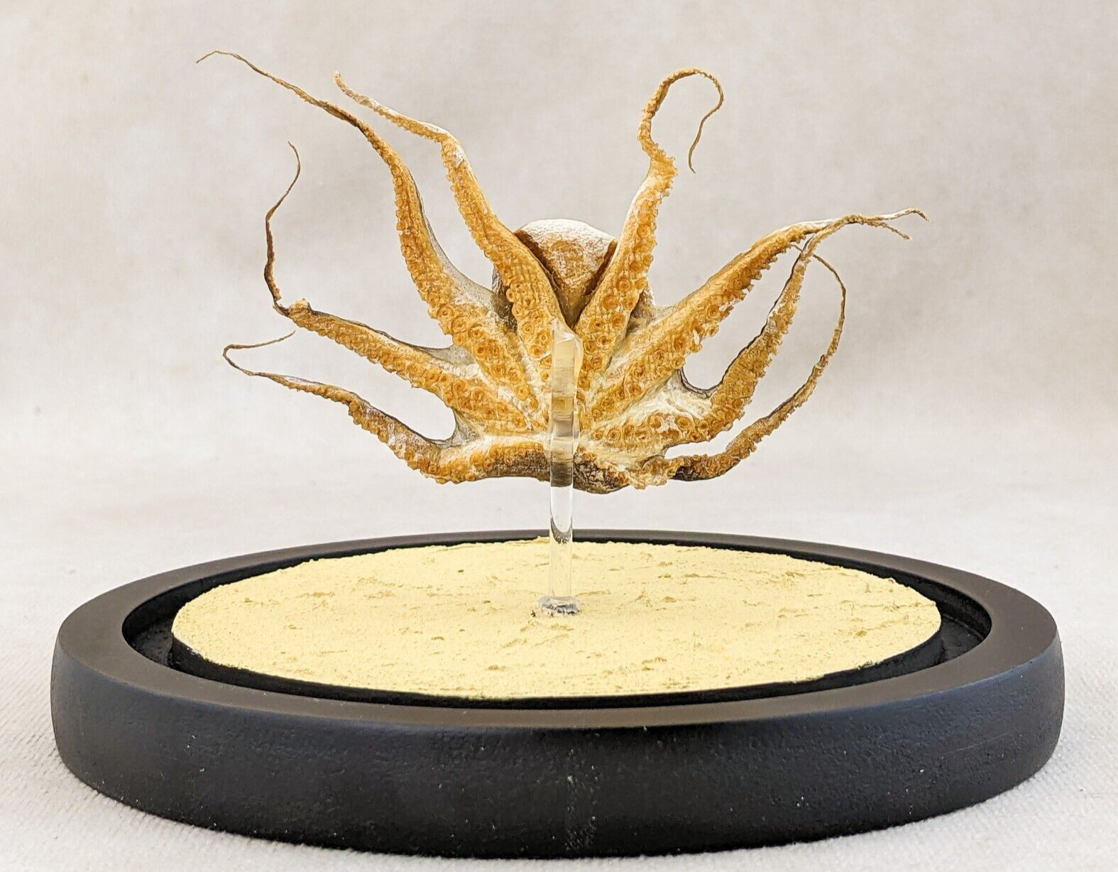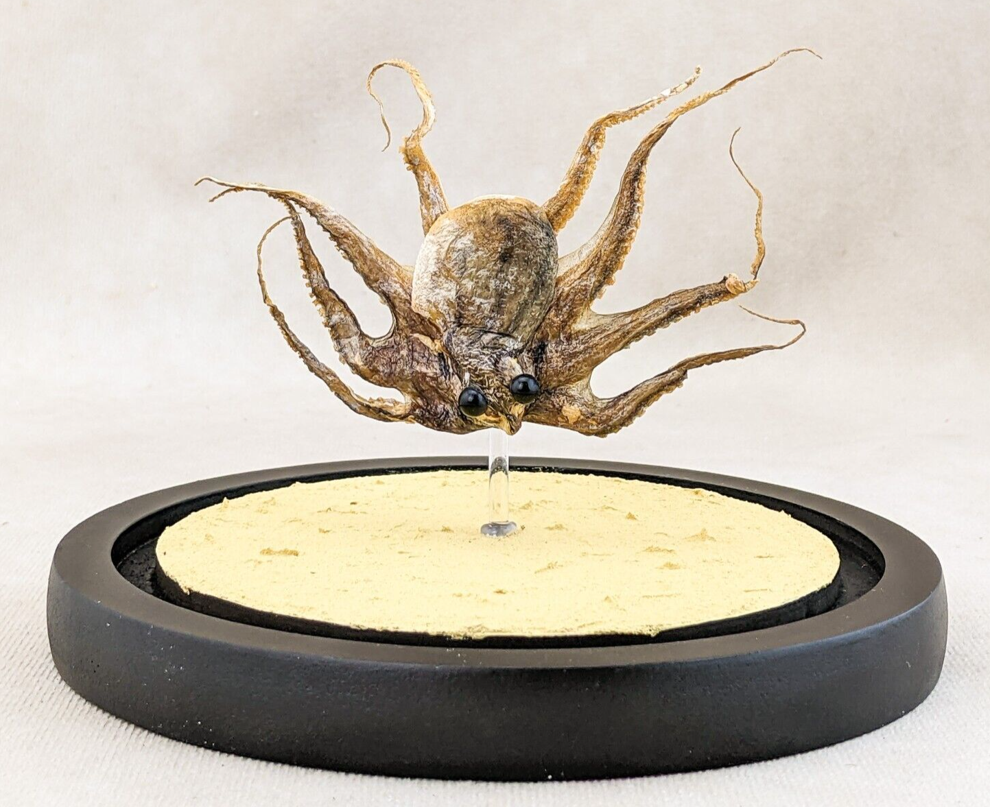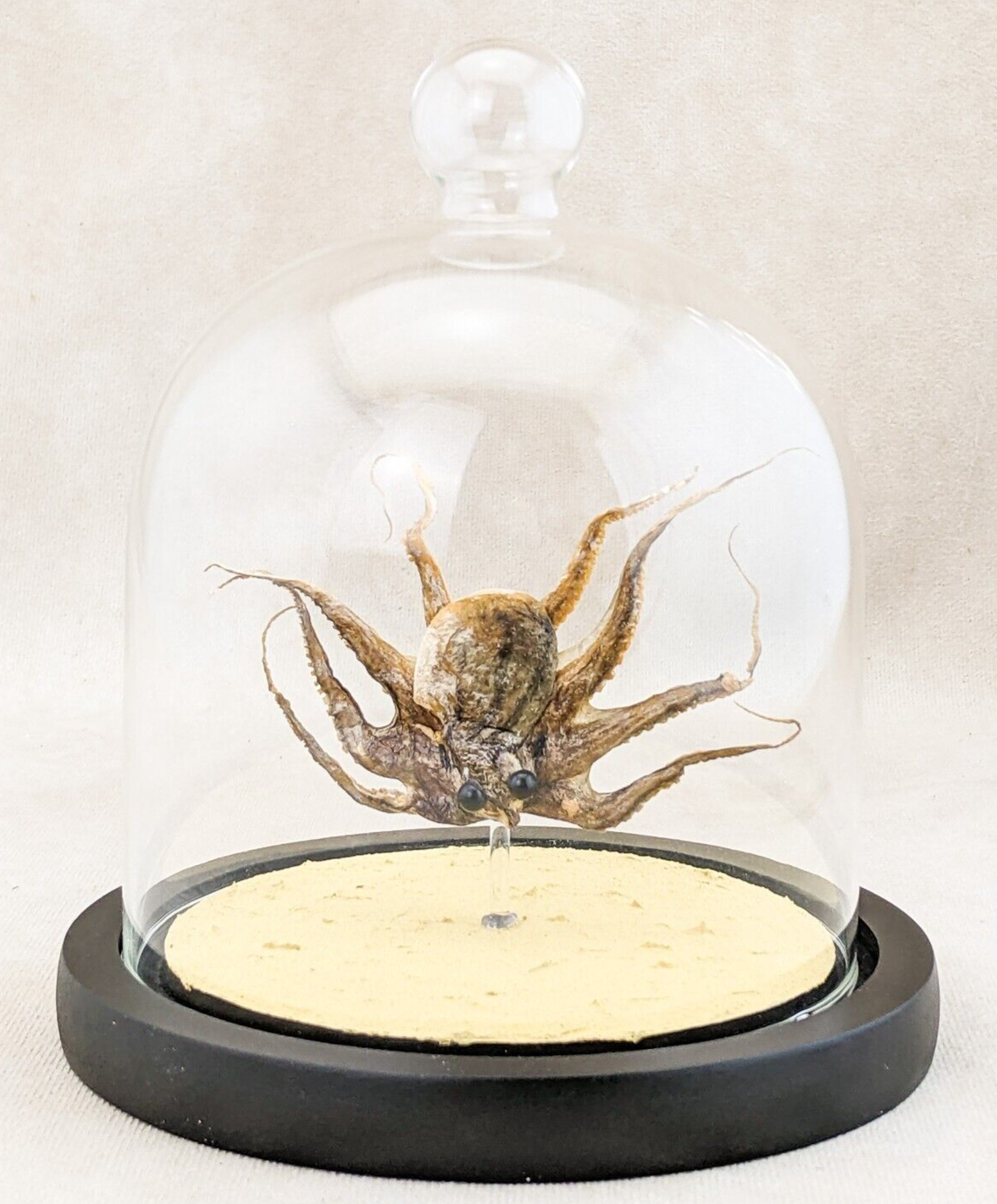 This is a baby Octopus that did not make it. I have him showcased in a glass dome that is approx. 6 1/2" x 5 1/2". Look how expressive he is! He would be great for a classroom presentations or just nice to add to your collection. I do have others that are done in fuller displays or done just as simply, check them out if you get the chance. This does have a sand bottom, some of the sand will shake loose in shipping, this is to be expected.  Just dump over trash can to get rid of the loose sand.