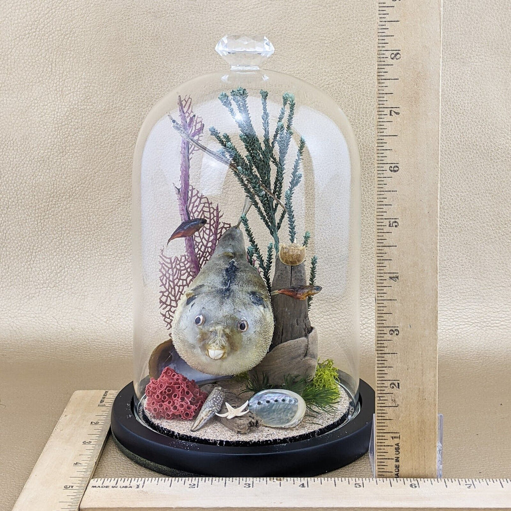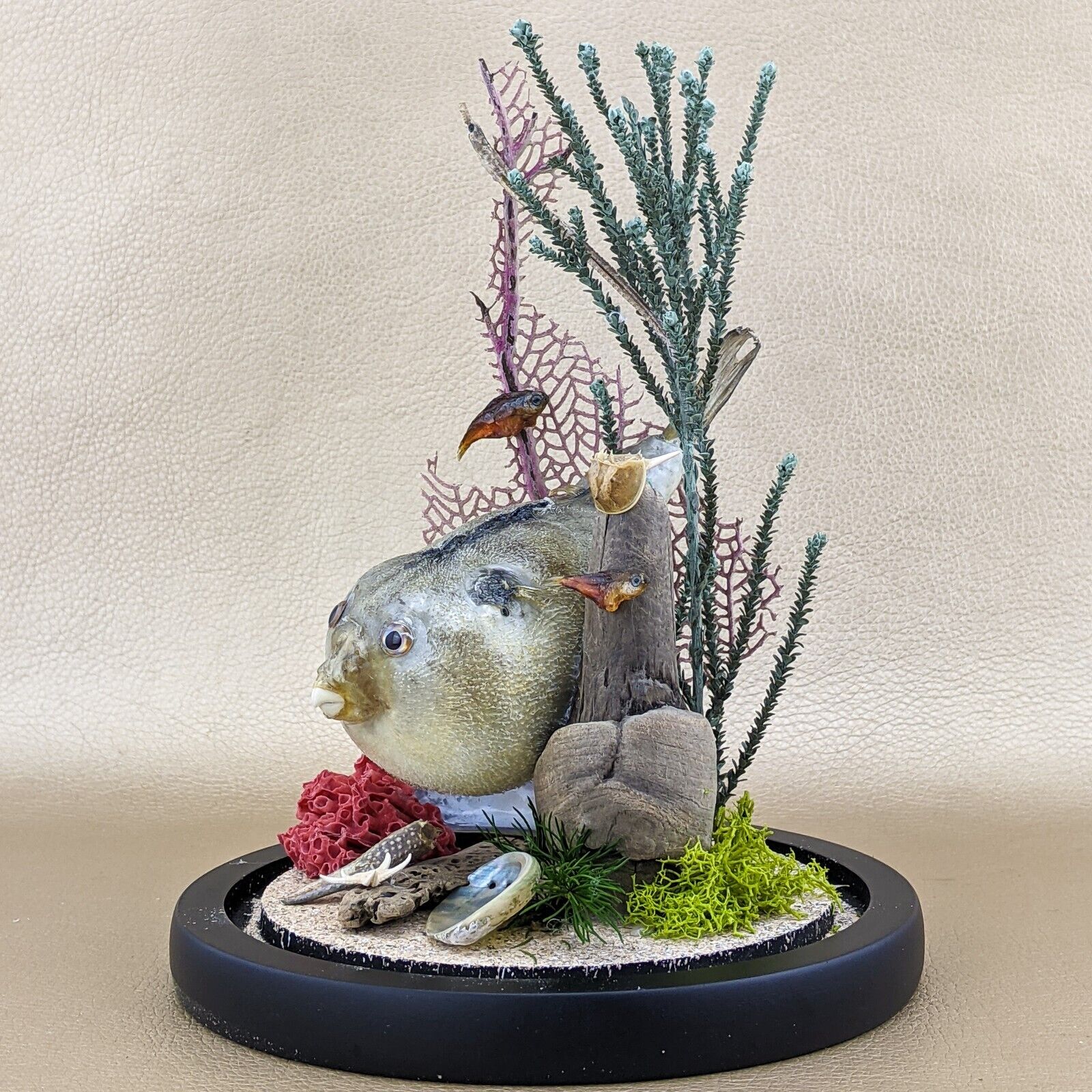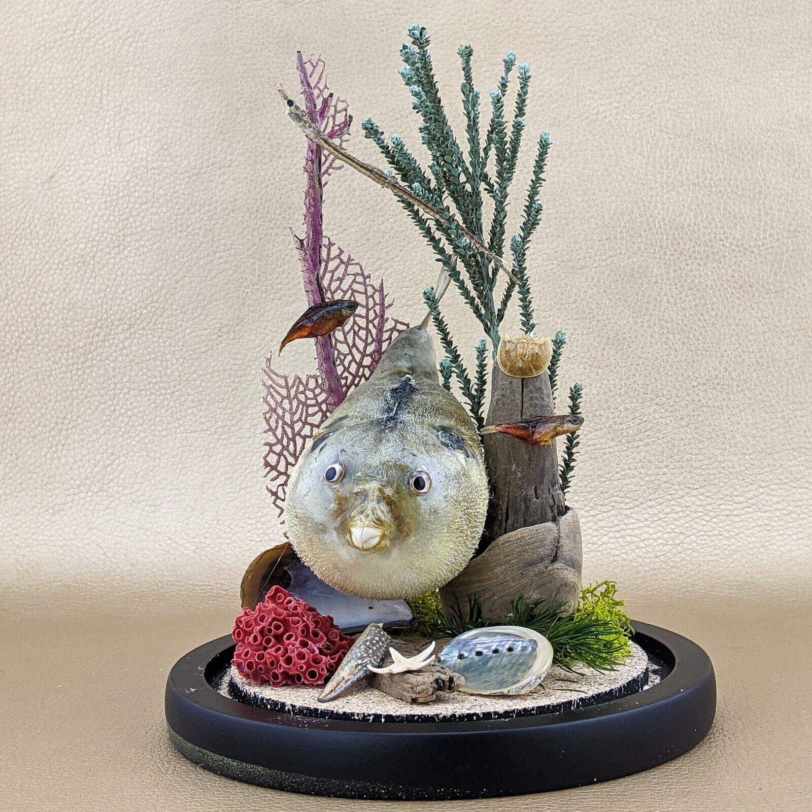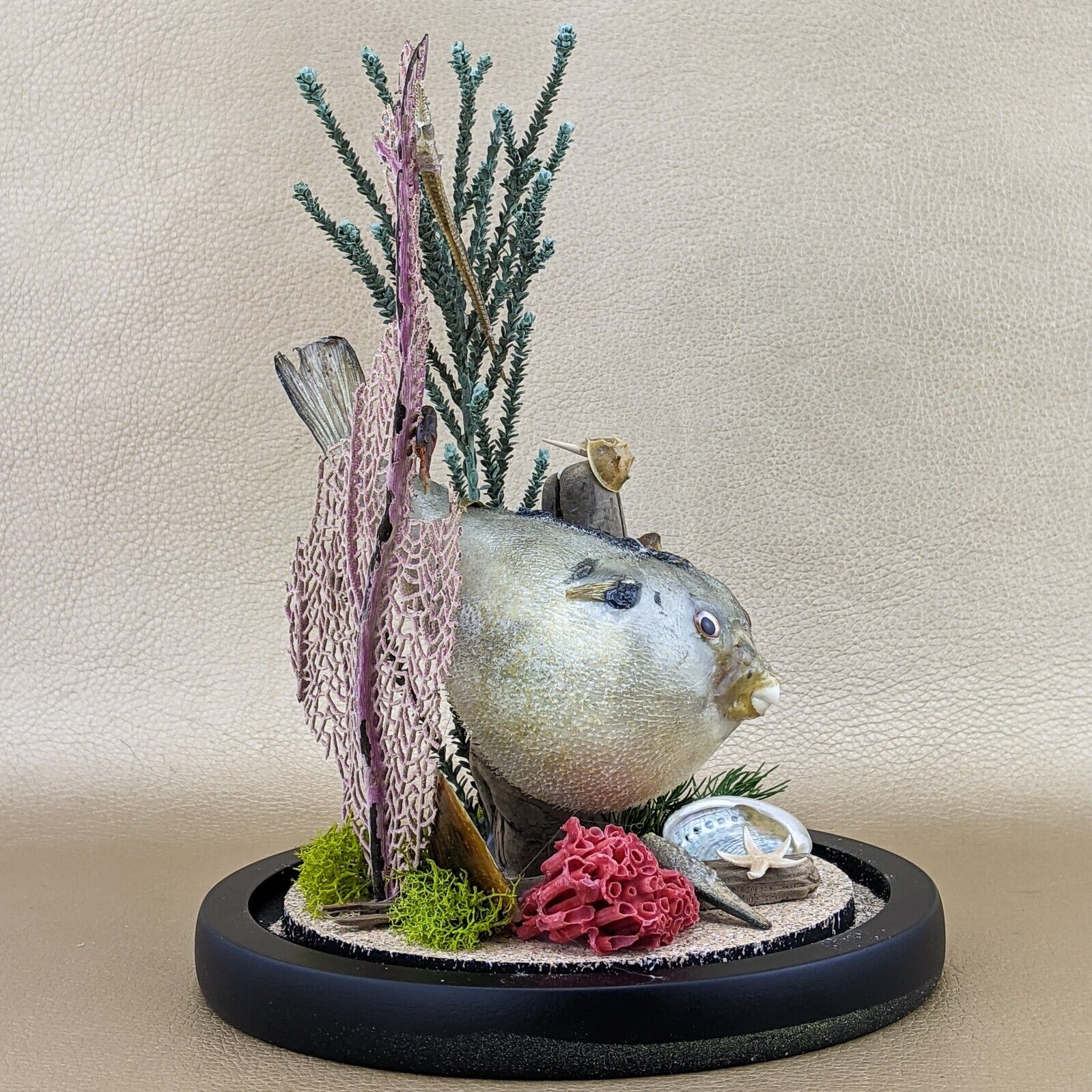 These guys are so unique! With their big bellies and tiny fins, these specimen are just too cute! Displayed surrounded by various REAL nautical pieces including sponge, starfish, shells, sea biscut, etc, they rest inside a wood based dome with a sand bottom and a beautiful diamond top dome- This would make an excellent display for your beach obsessed friends or would be perfect for a classroom! This display measures approximately              "