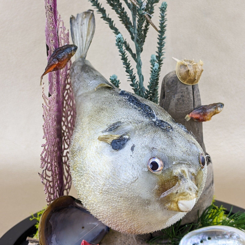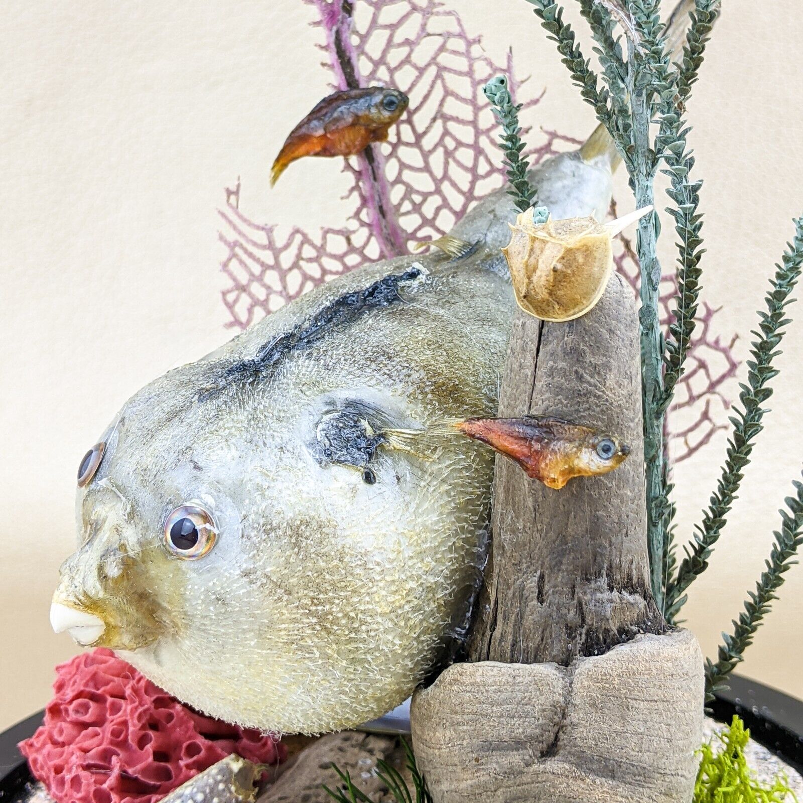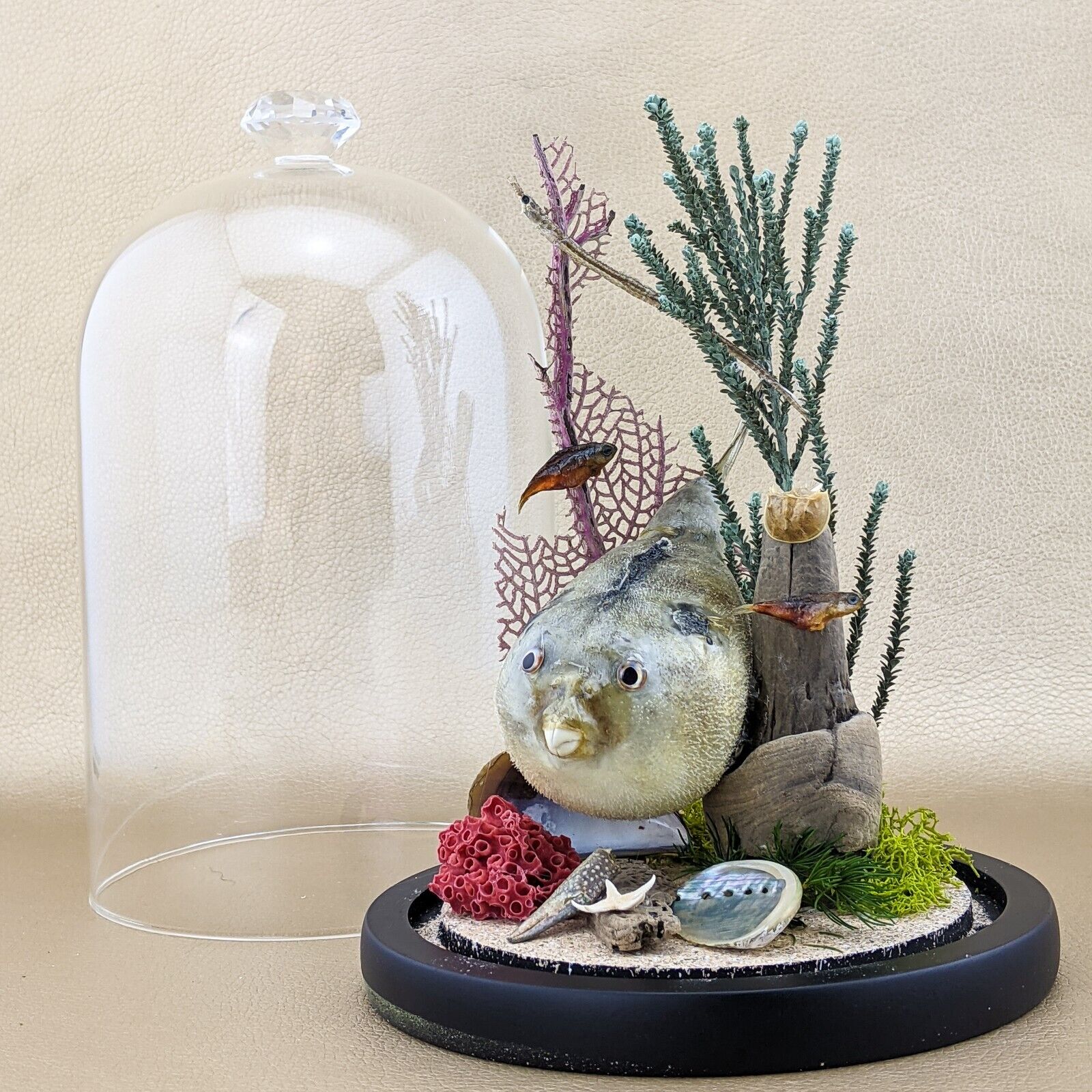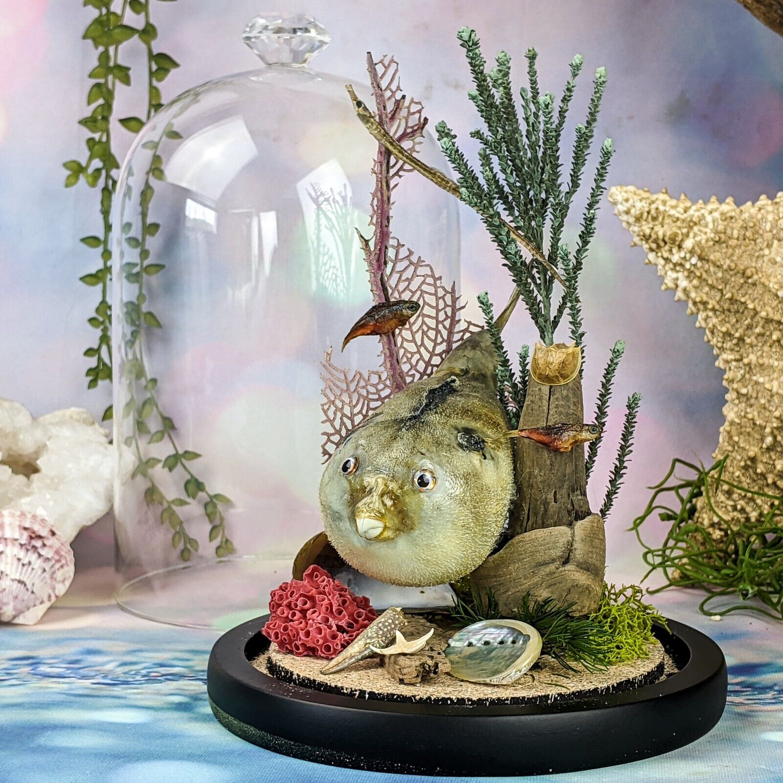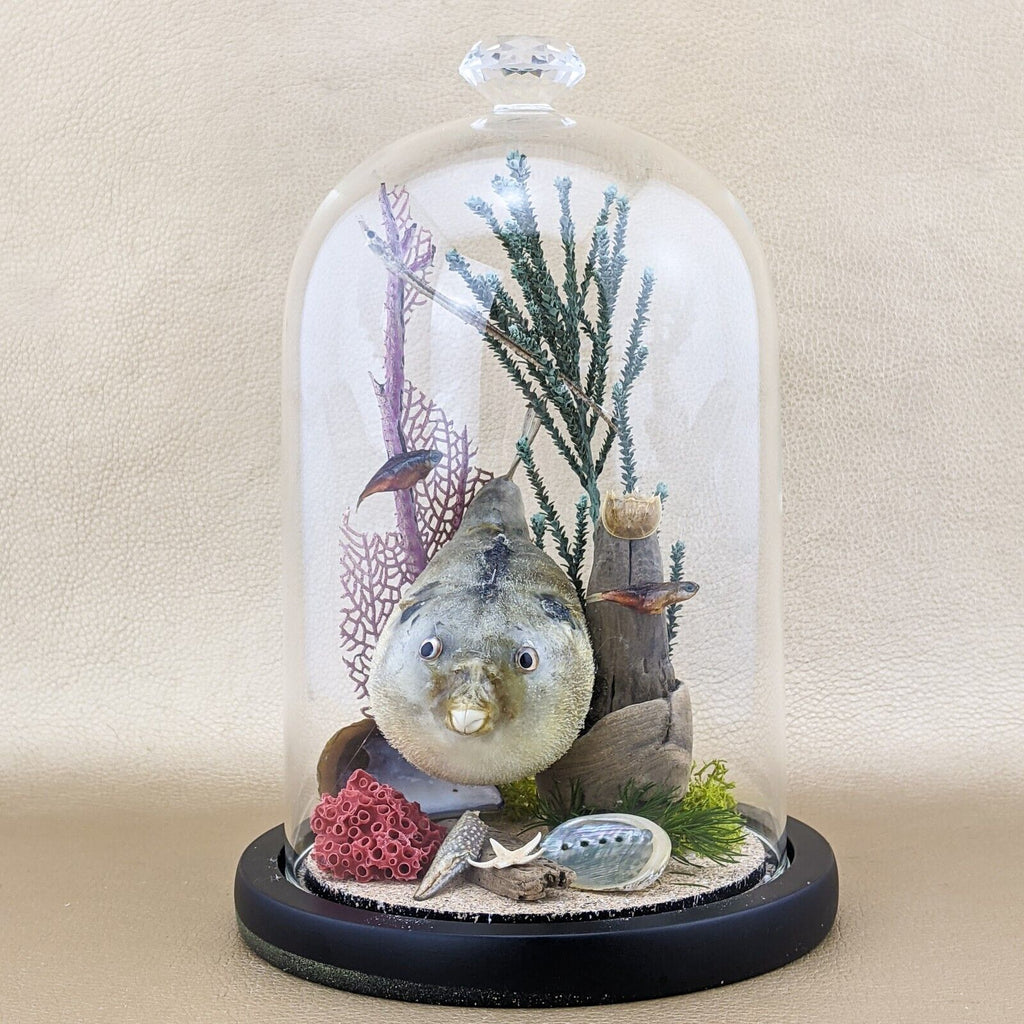These guys are so unique! With their big bellies and tiny fins, these specimen are just too cute! Displayed surrounded by various REAL nautical pieces including sponge, starfish, shells, sea biscut, etc, they rest inside a wood based dome with a sand bottom and a beautiful diamond top dome- This would make an excellent display for your beach obsessed friends or would be perfect for a classroom! This display measures approximately              "