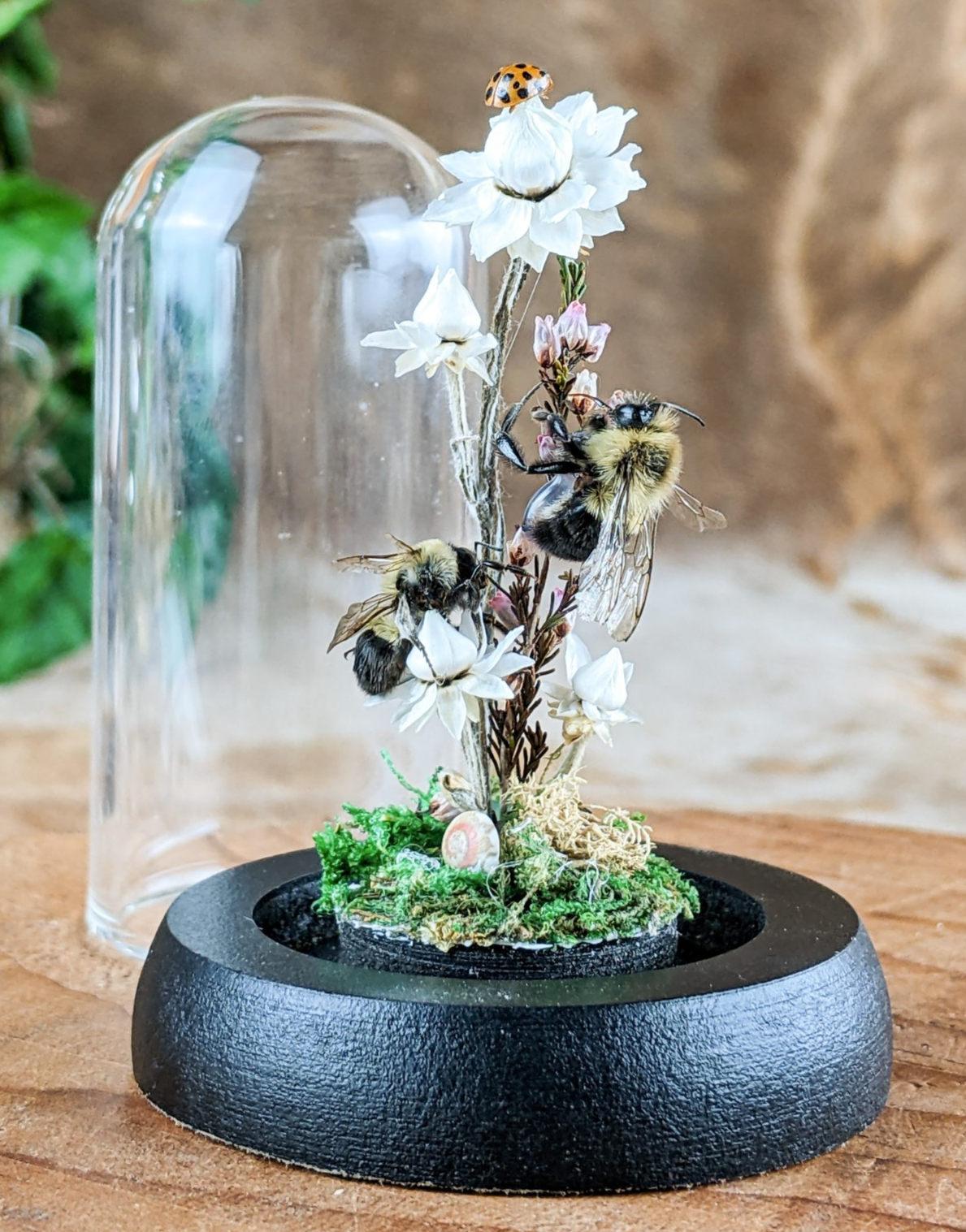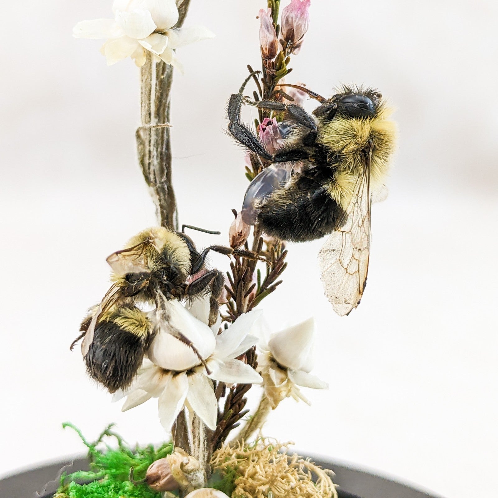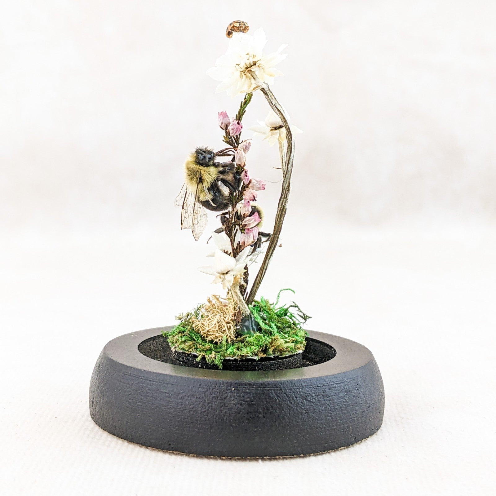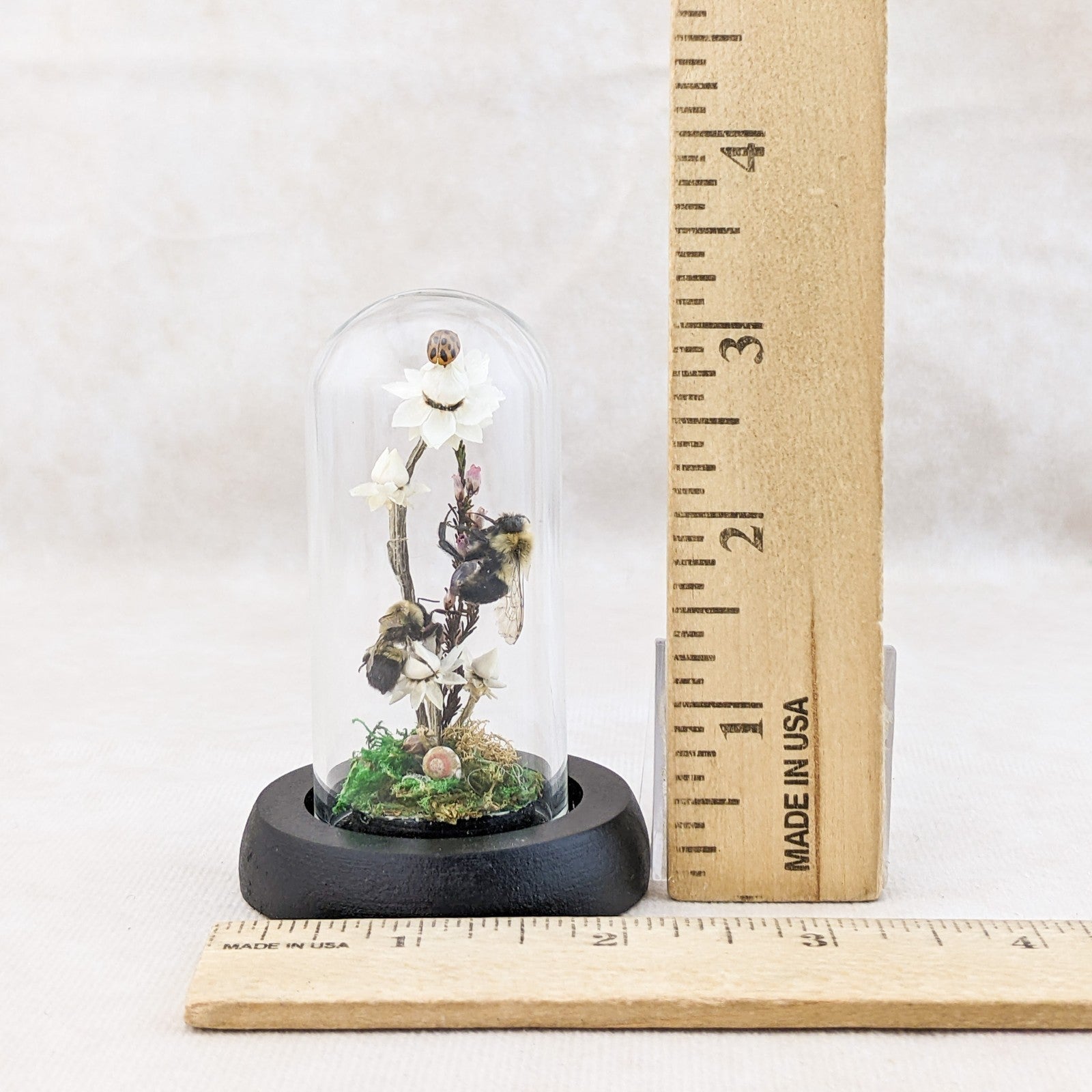 These preserved Bumble bees are adorable! The one is digging down for that nectar! He has his head buried in the flower! He is surrounded by preserved flowers, fern and the larger flower is resting on a faux rock. So cute with his little butt and legs hanging out. This is great for a classroom display and teaching tool as well and would be great addition to any collection. Removable dome with black base. This display is approx. 3 1/2 x 2 1/4"