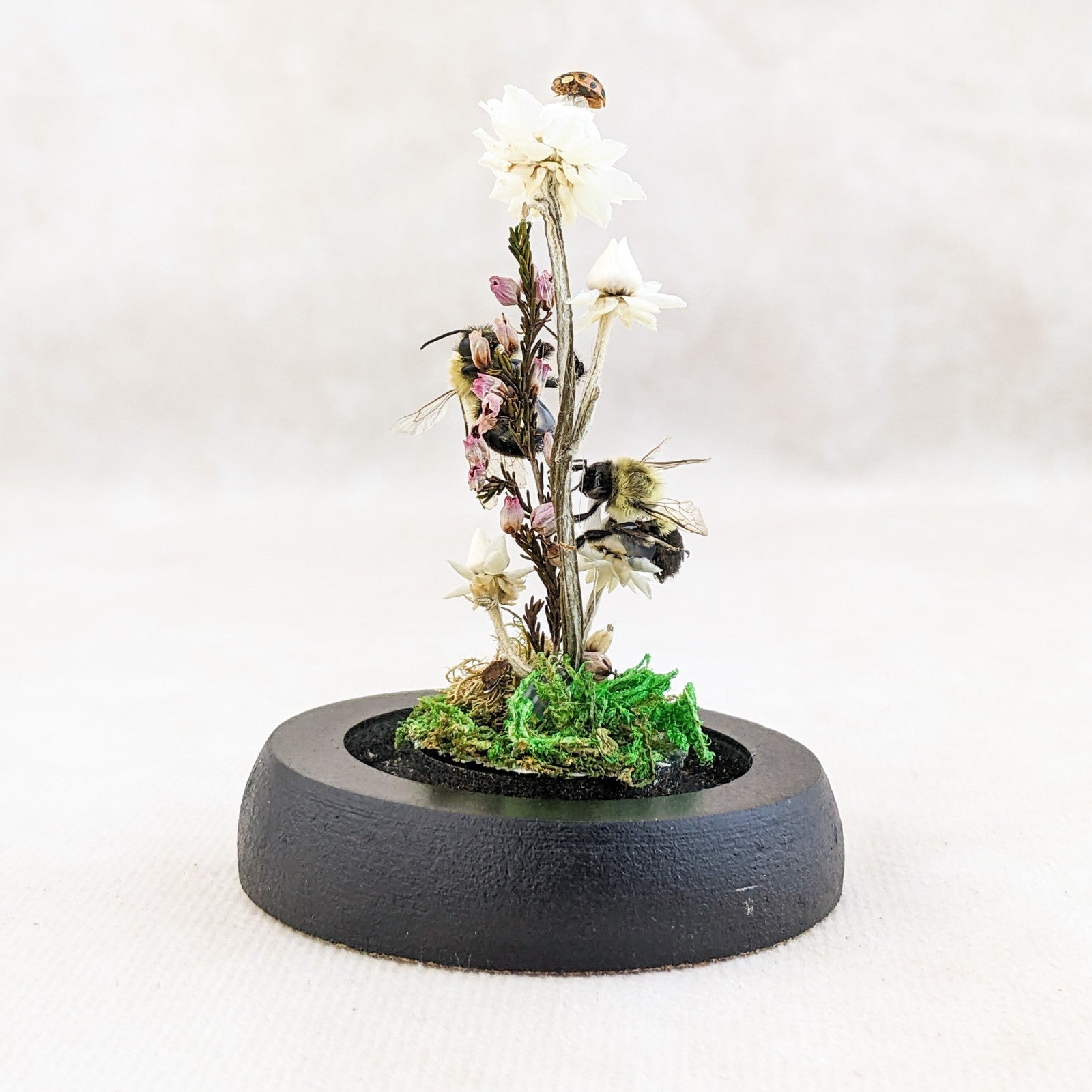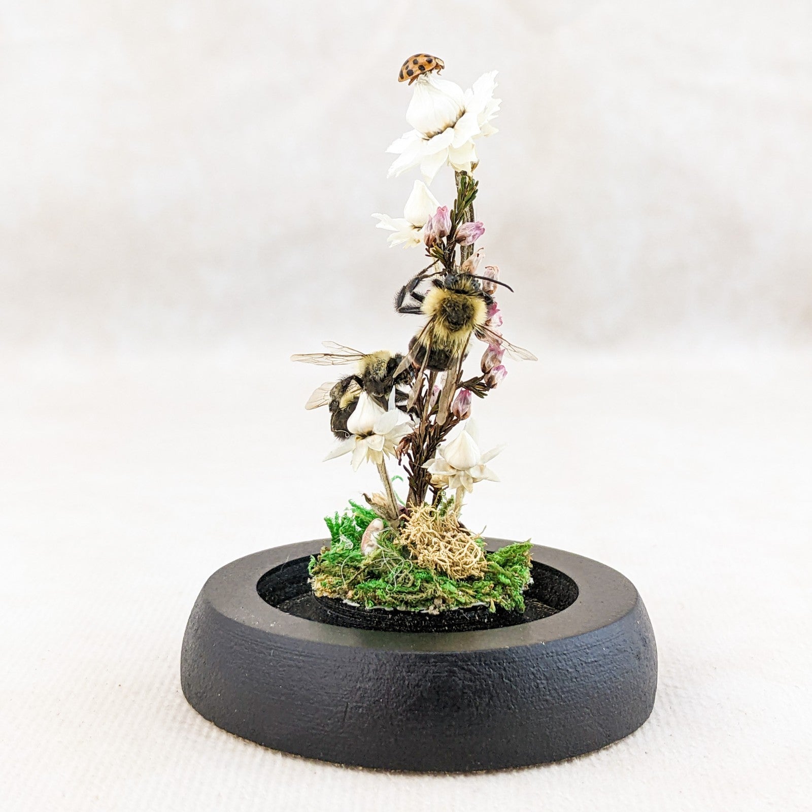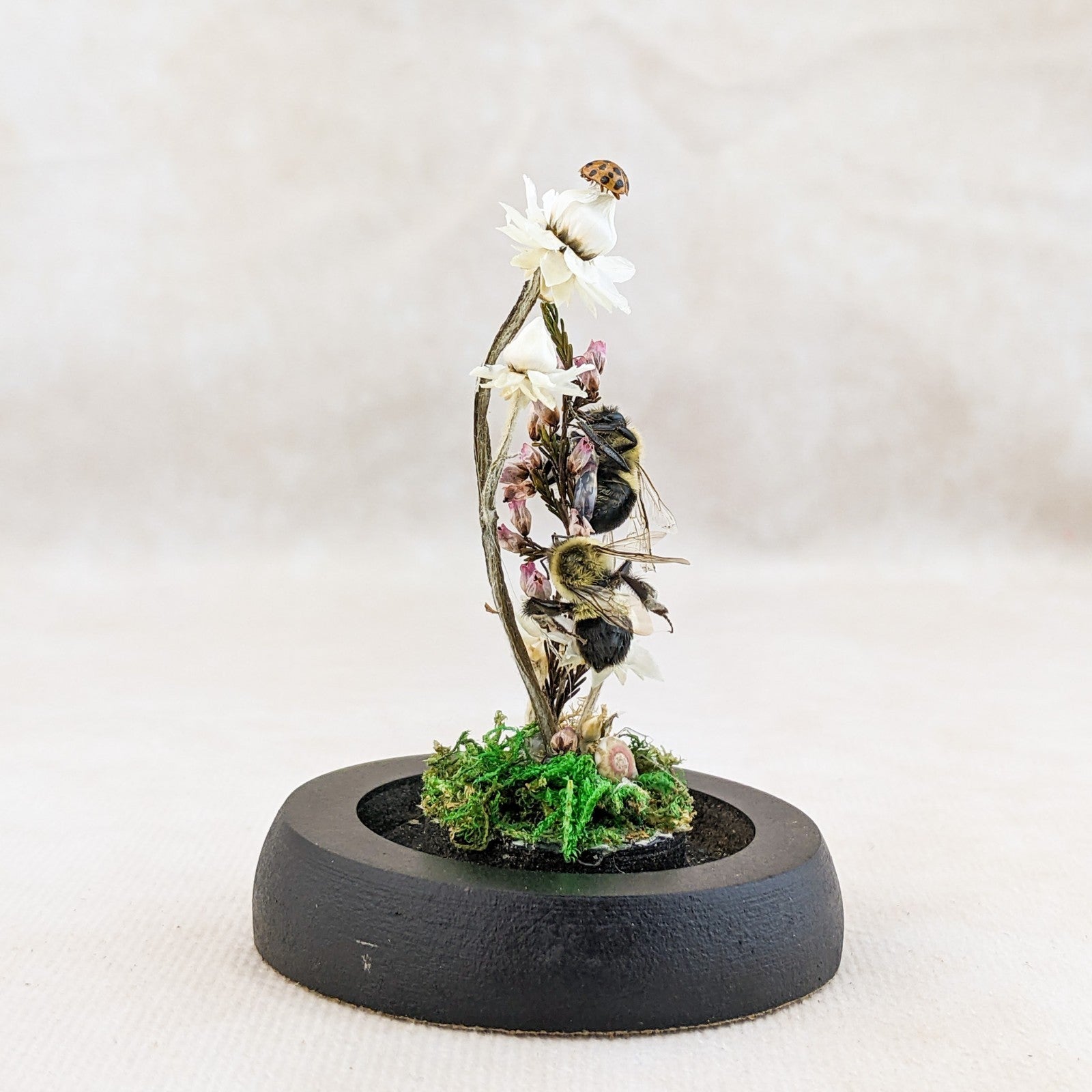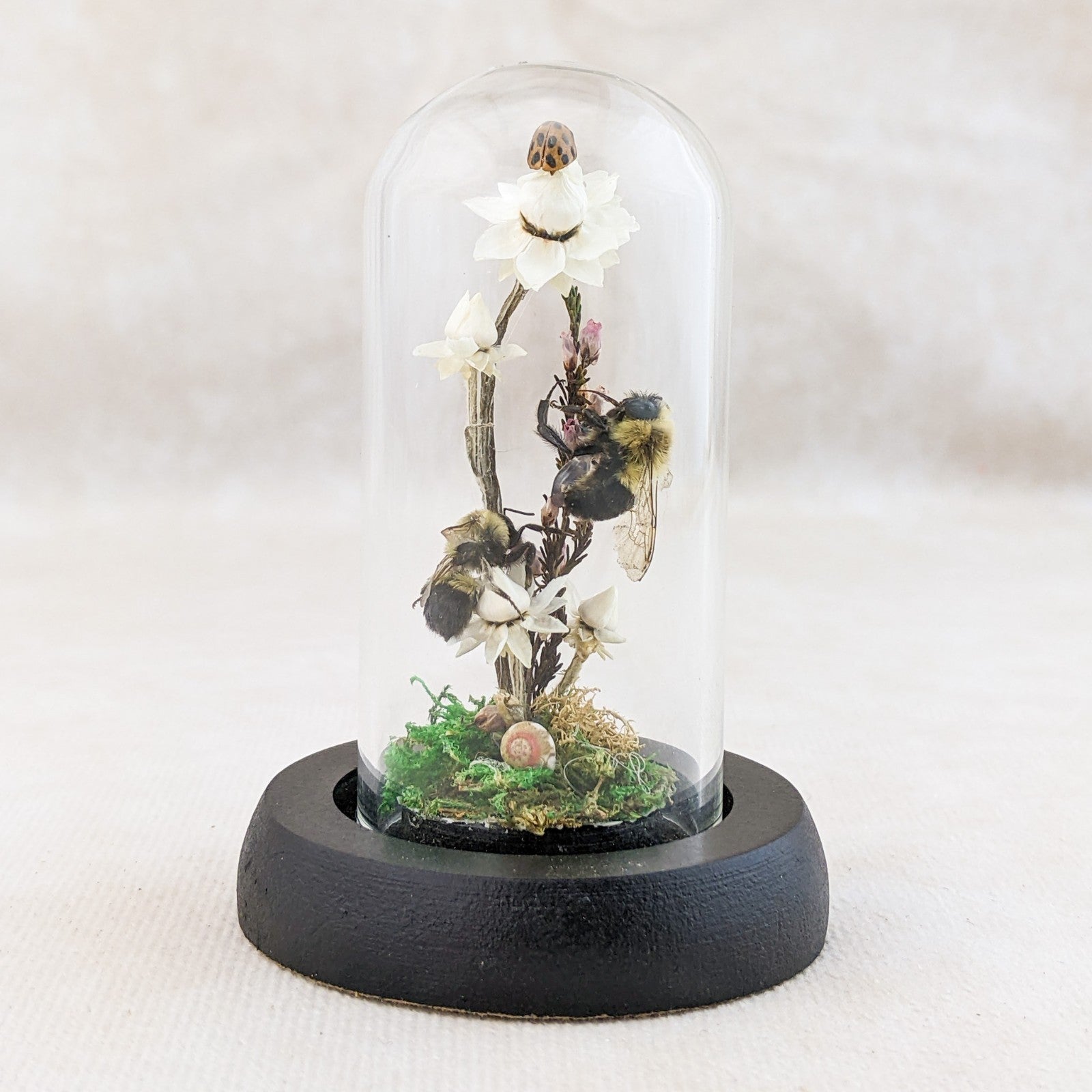 These preserved Bumble bees are adorable! The one is digging down for that nectar! He has his head buried in the flower! He is surrounded by preserved flowers, fern and the larger flower is resting on a faux rock. So cute with his little butt and legs hanging out. This is great for a classroom display and teaching tool as well and would be great addition to any collection. Removable dome with black base. This display is approx. 3 1/2 x 2 1/4"