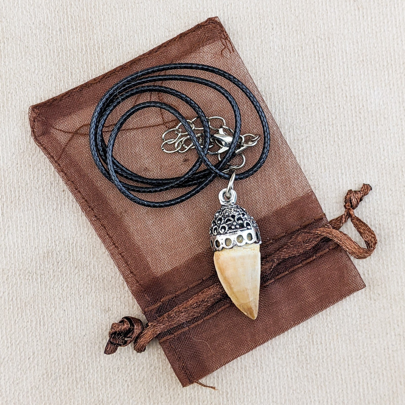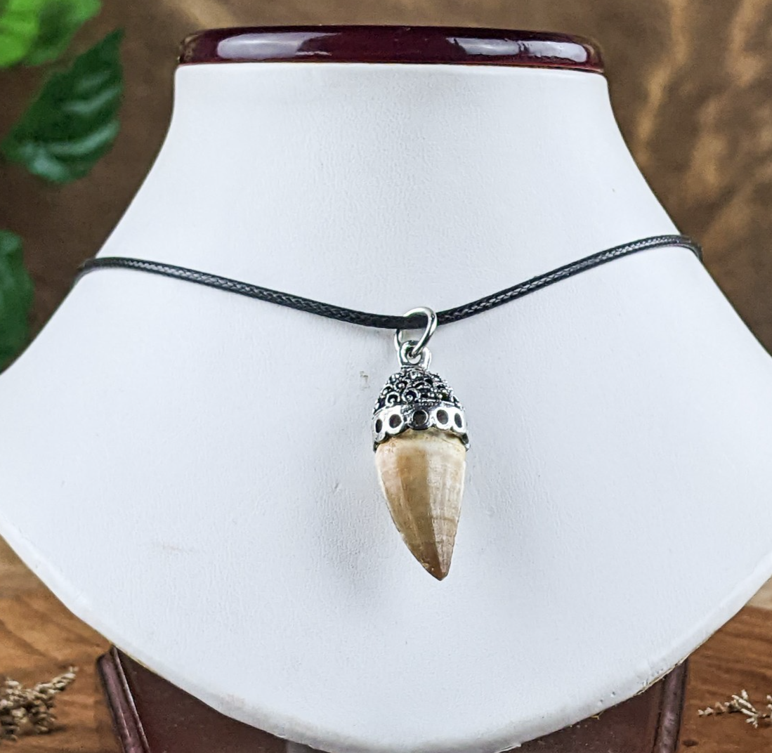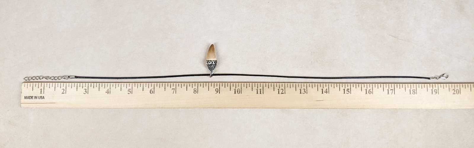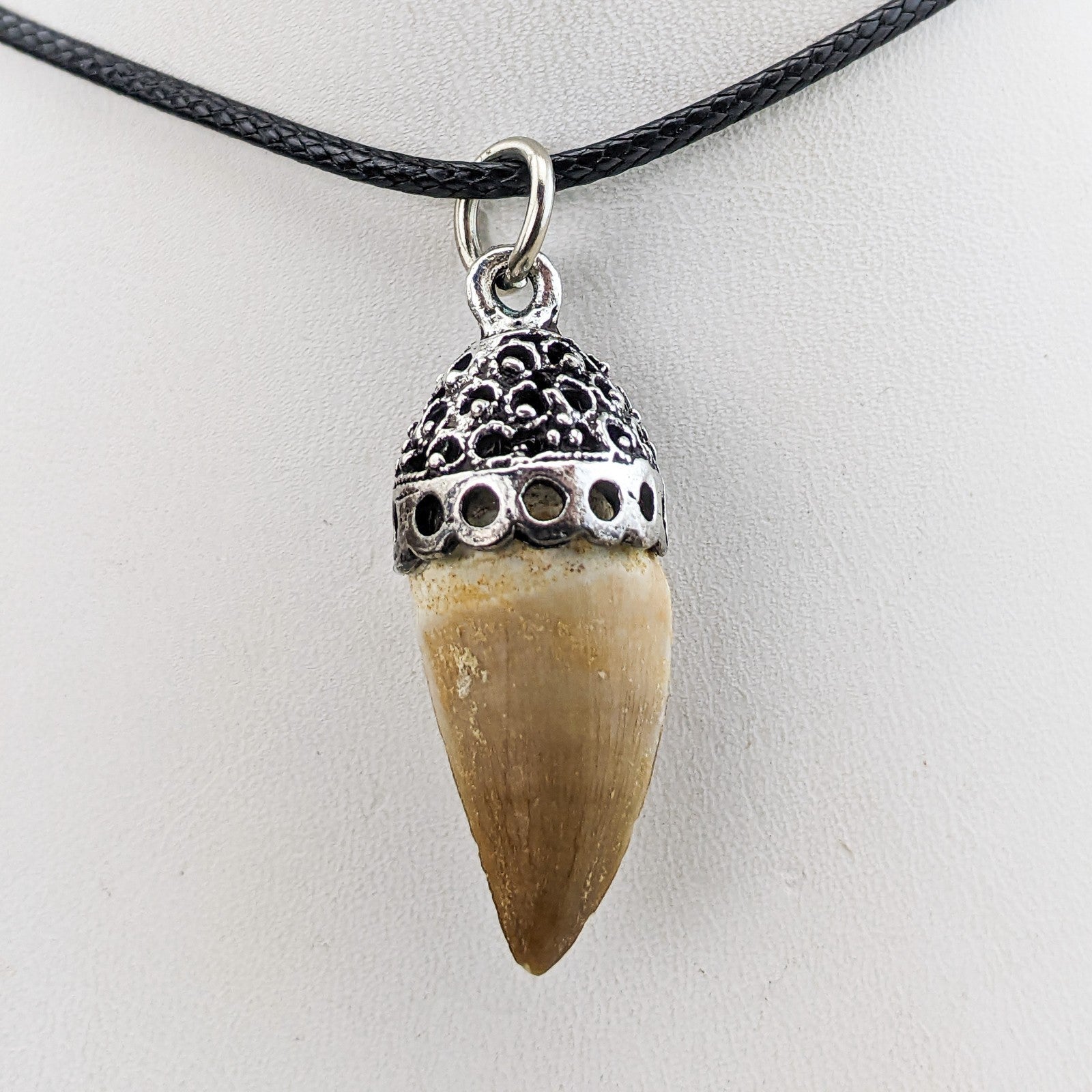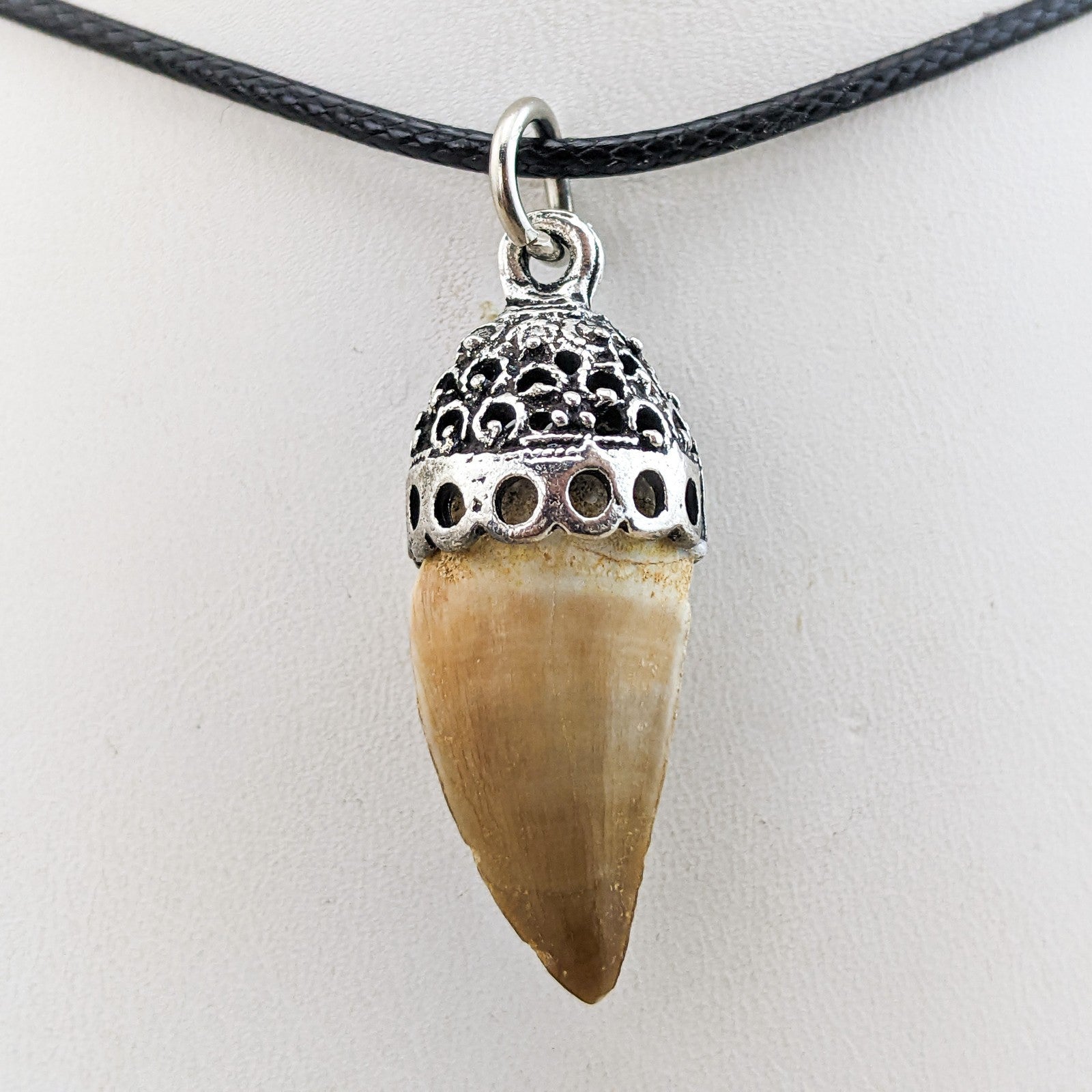 d6b #4 This necklace displays an Authentic Mosasaurus "Dinosaur of the Sea" fossilized tooth. The tooth is displayed in a fancy silver cap and hangs on an approx 18", 2" extender Leather cord necklace, the tooth and fancy cap and hook are 1 3/4". The last picture shows the necklace and tooth with a ruler.