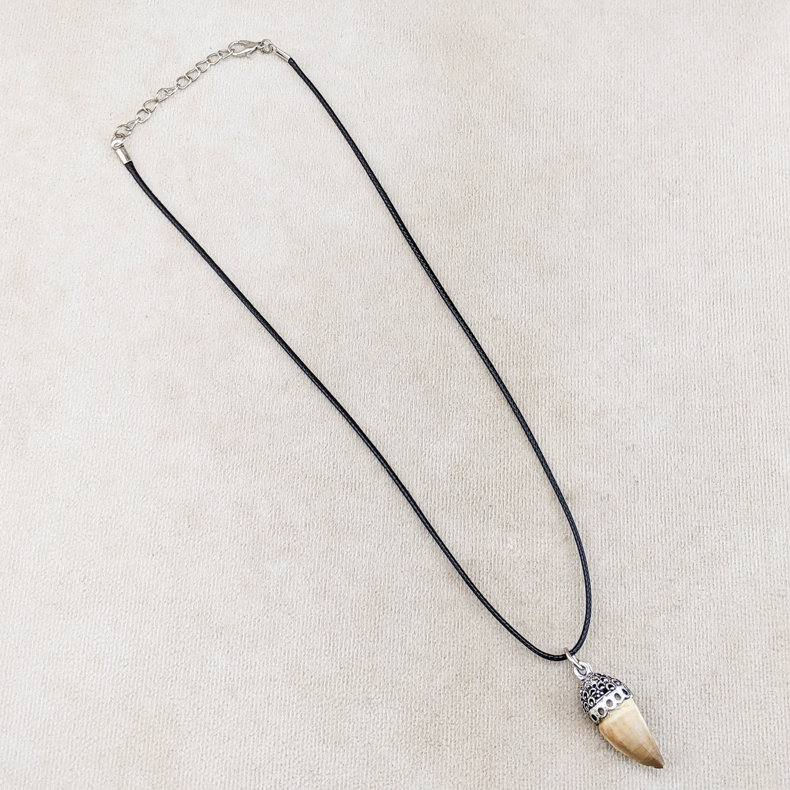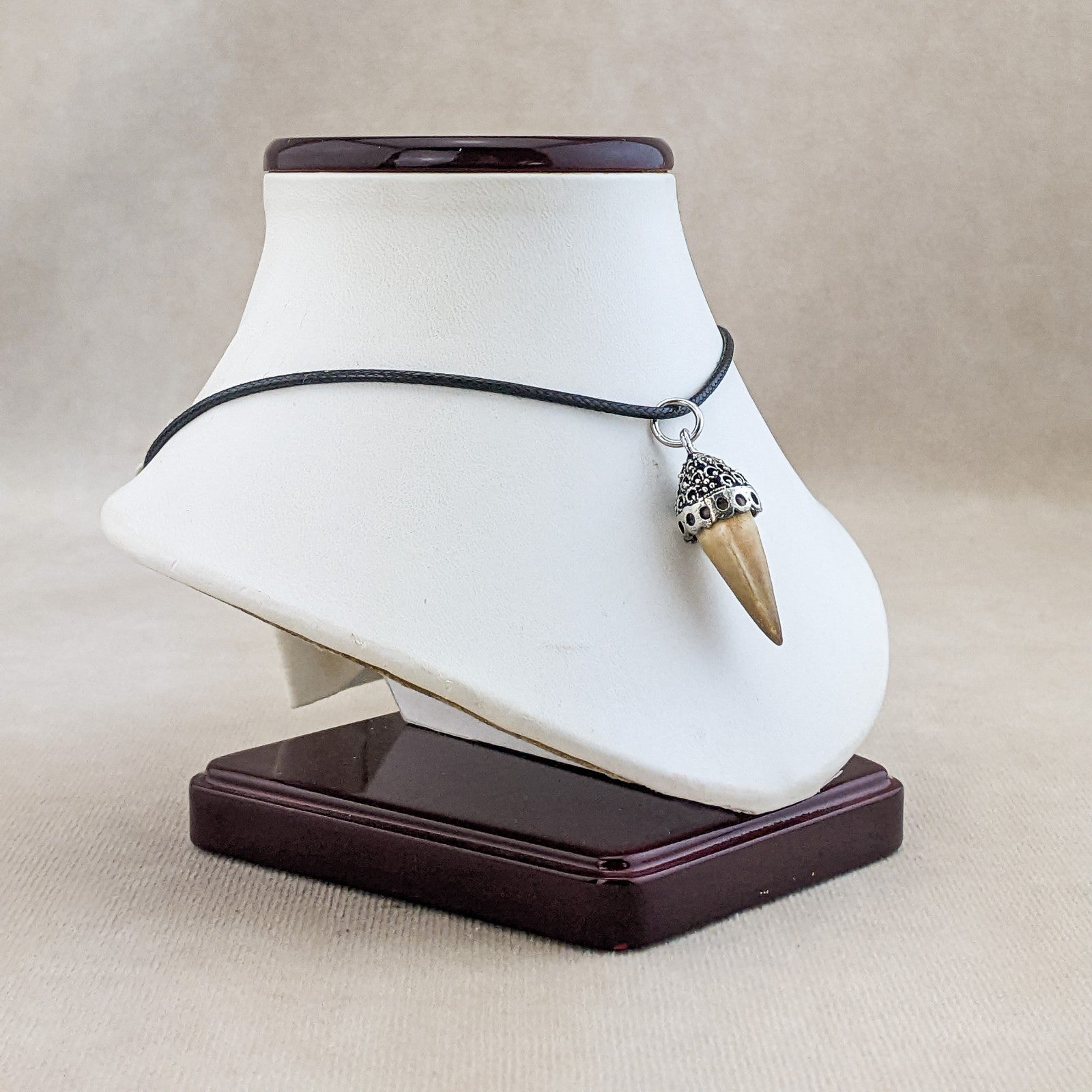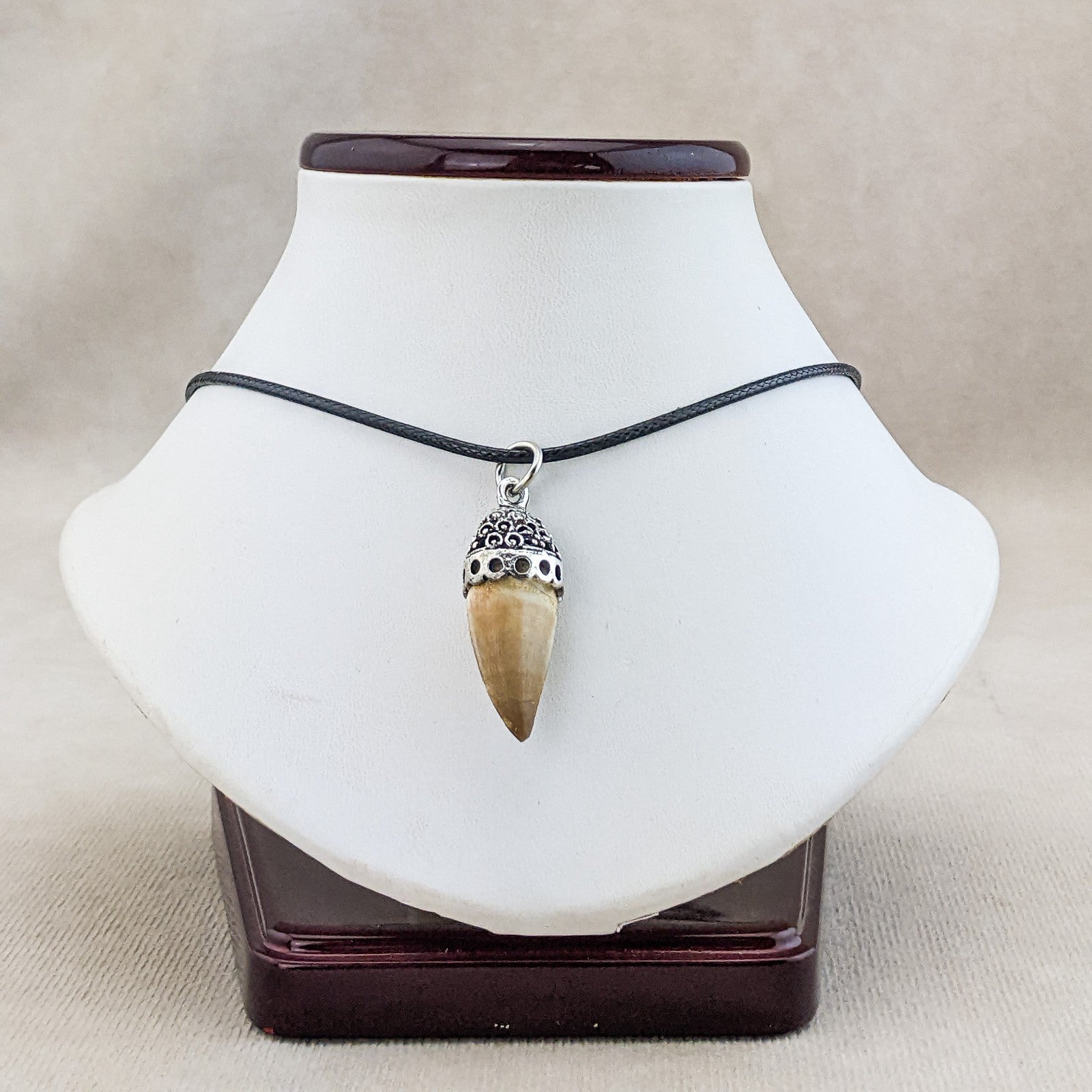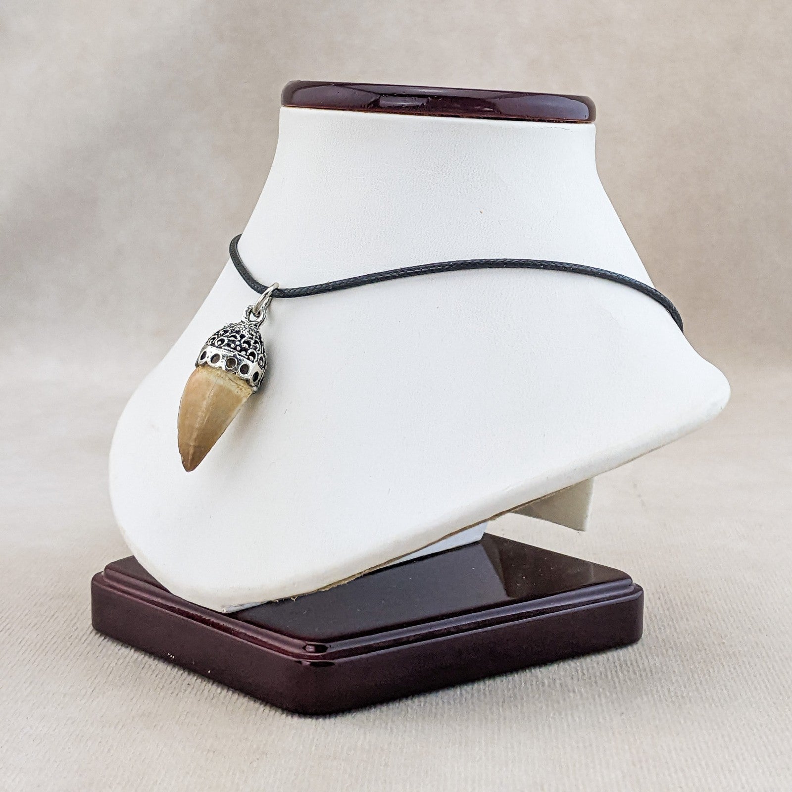 d6b #4 This necklace displays an Authentic Mosasaurus "Dinosaur of the Sea" fossilized tooth. The tooth is displayed in a fancy silver cap and hangs on an approx 18", 2" extender Leather cord necklace, the tooth and fancy cap and hook are 1 3/4". The last picture shows the necklace and tooth with a ruler.