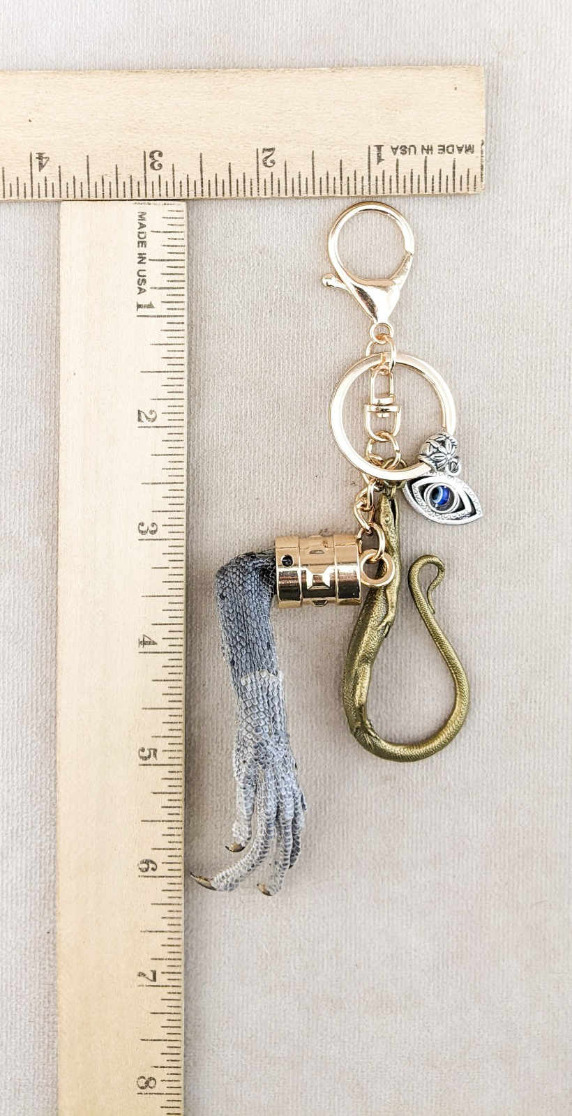 W14b #4 This is a Fancy capped Real taxidermy lizard foot Key chain or talisman with an All Seeing Eye and hanging on a Lizard belt hook!  This will be your little witches favorite!  Attach it to your Keys, cabin keys, car keys, purse, bag, luggage, belt or a gift! The claw is approx. 6 1/2 x 3 x 1".  Please see last picture for size.
