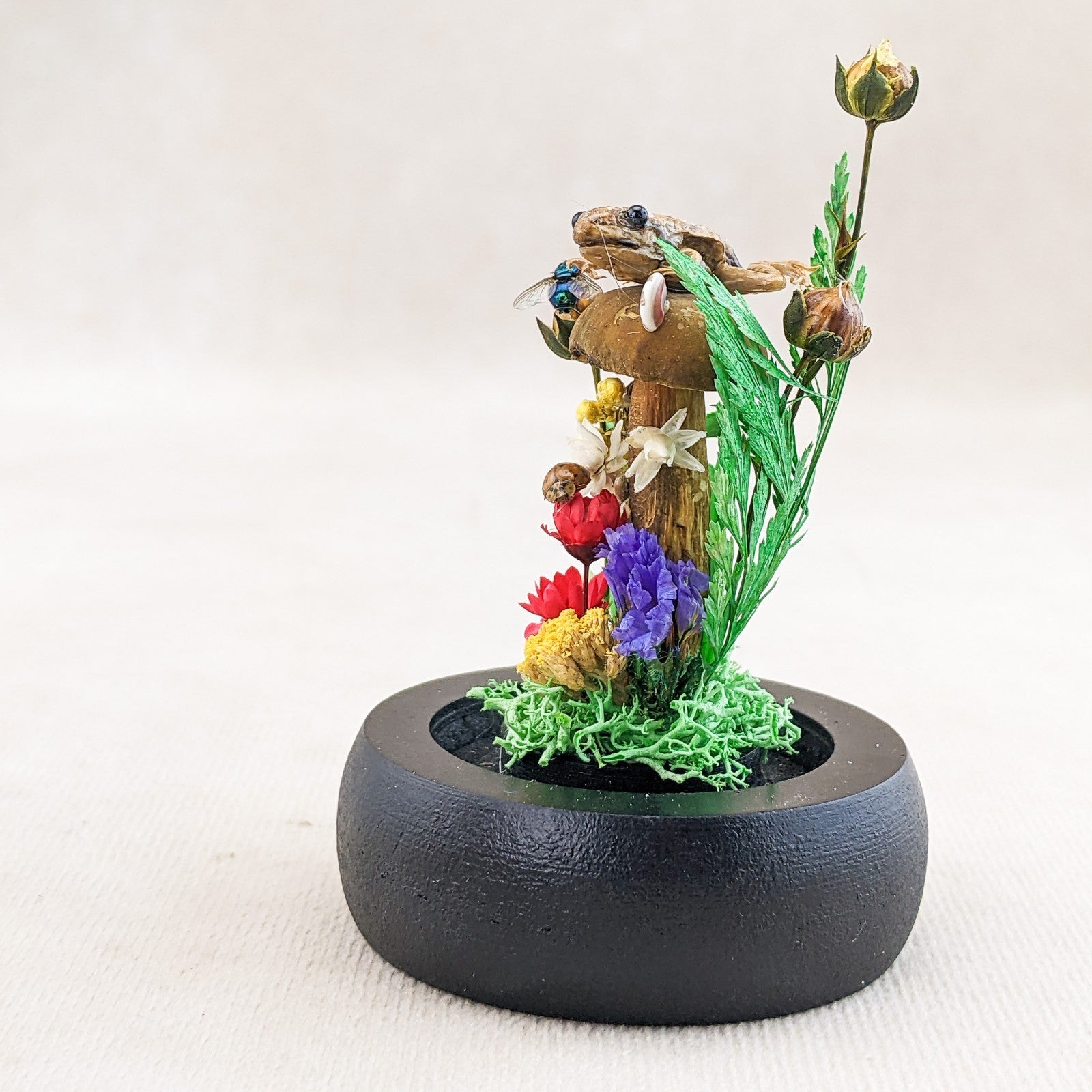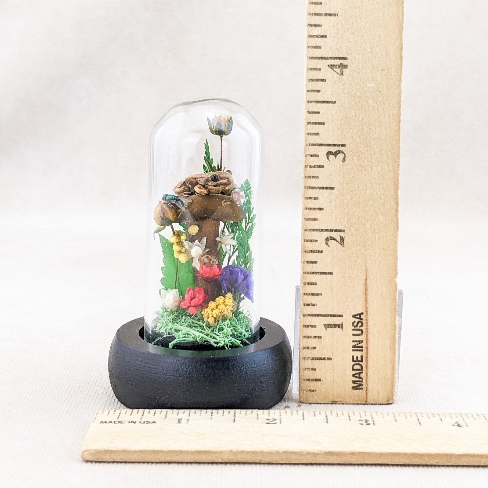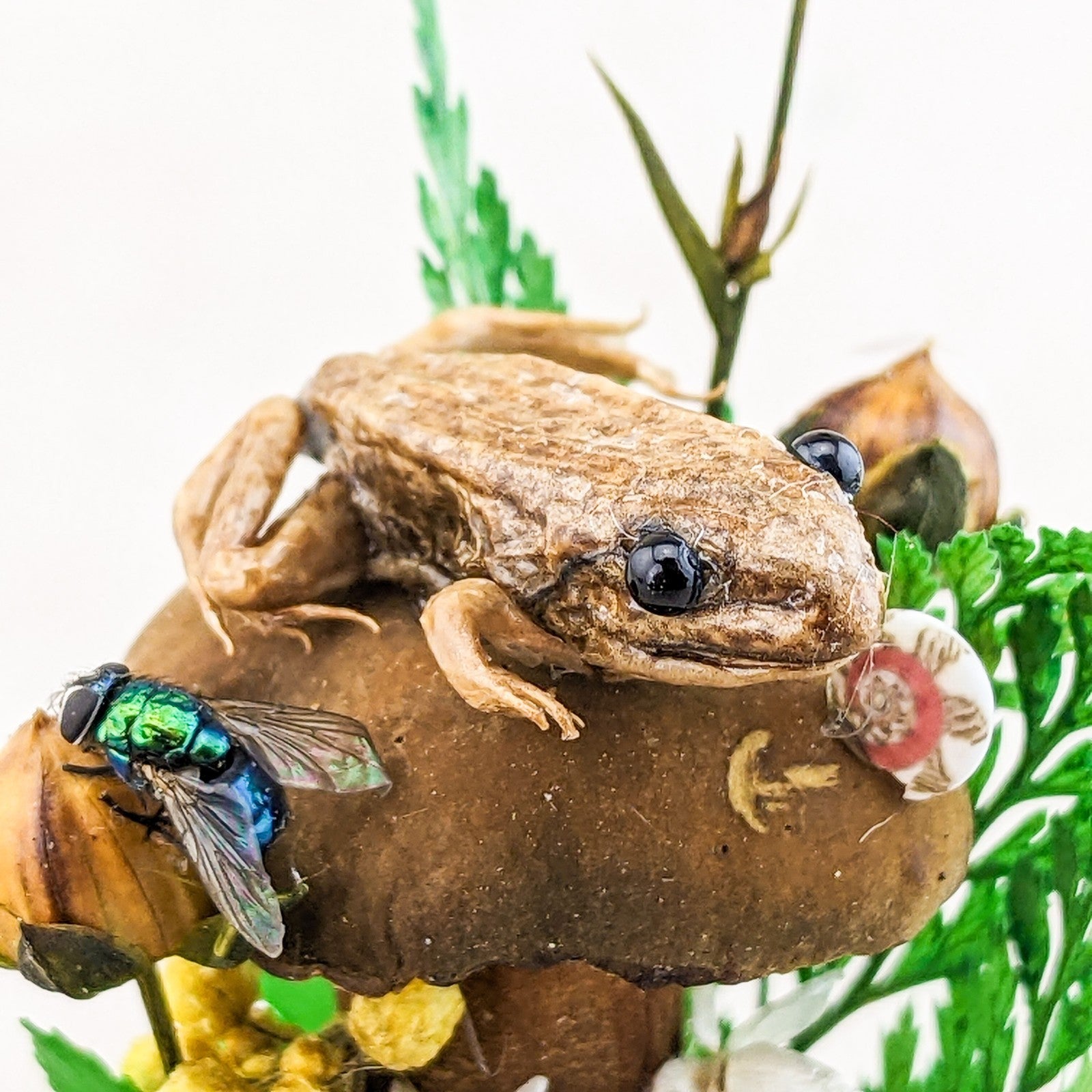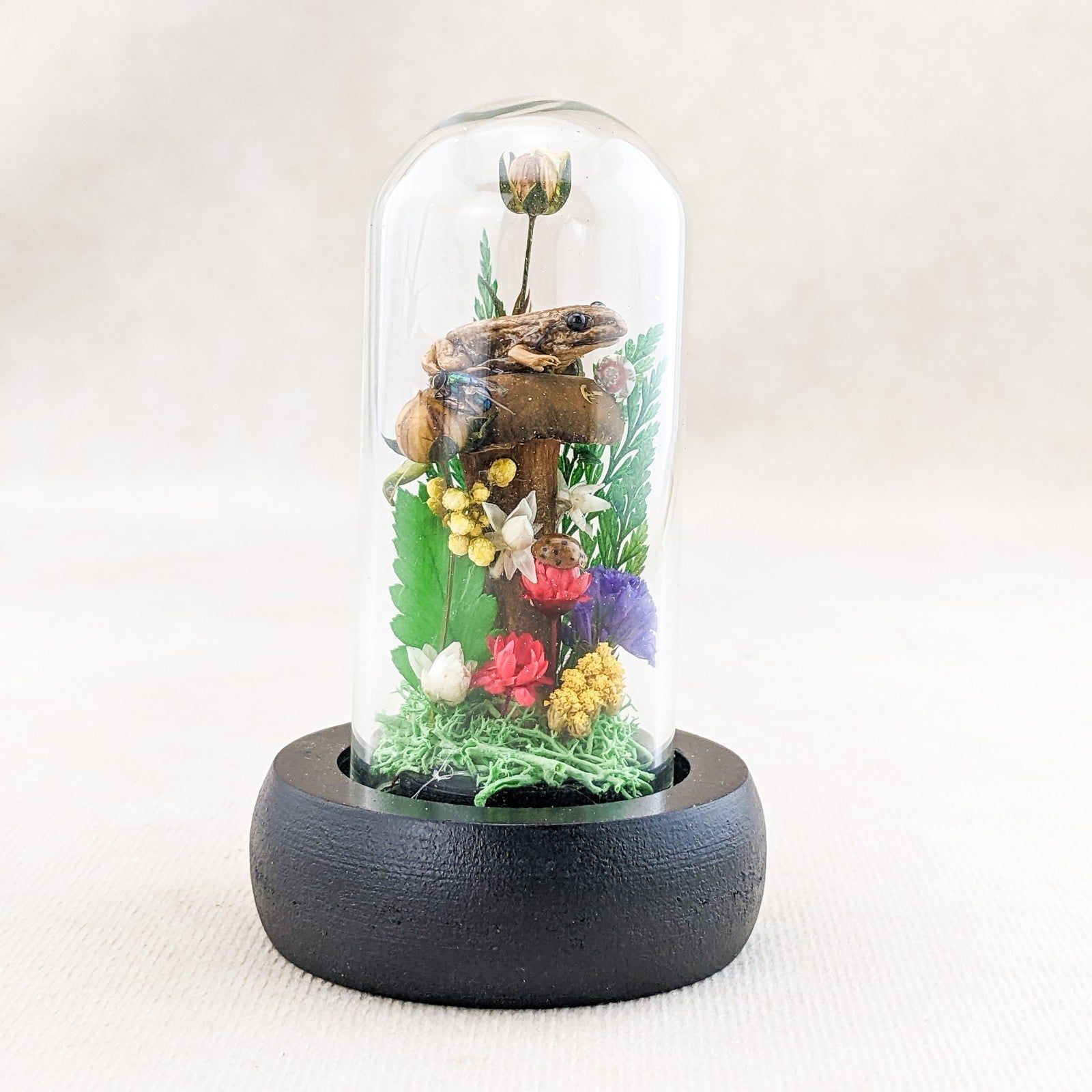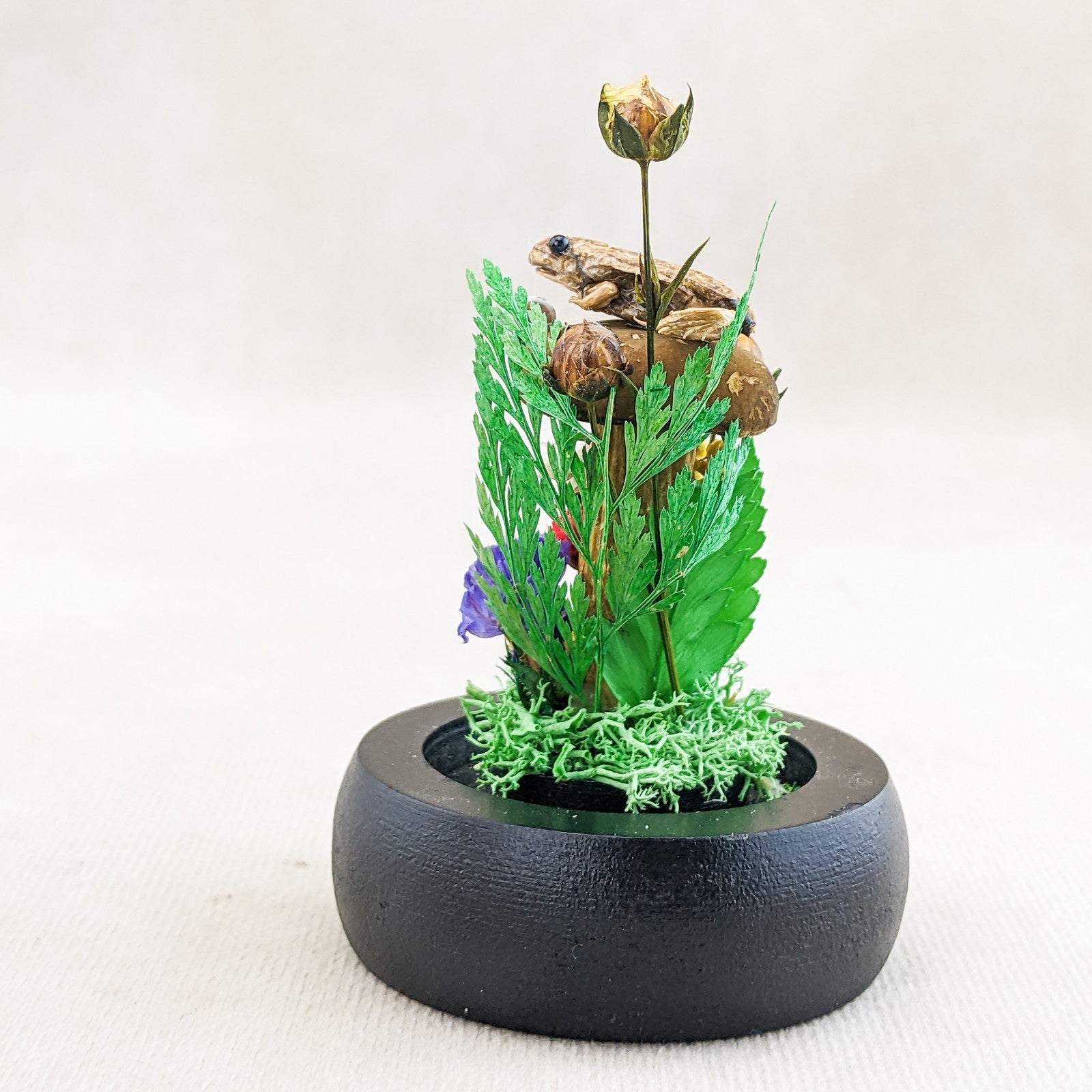 This is a very nice juvenile Leopard Frog showcased nicely in a Glass Dome Display surrounded by preserved flowers and ferns.  It also includes a real lady bug, fly and snail.  This display would be a great starter piece or a wonderful addition to any collection.  A lot of these are also being used for educational pieces in the classroom!  The glass dome and wood base will keep your specimen clean and safe for years to come.  This display is approx.     3 1/2 x 2 1/4"                  .