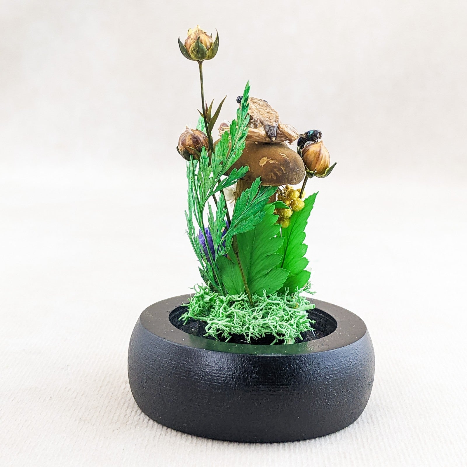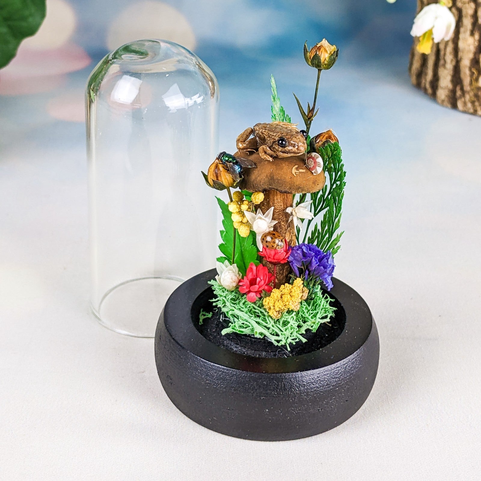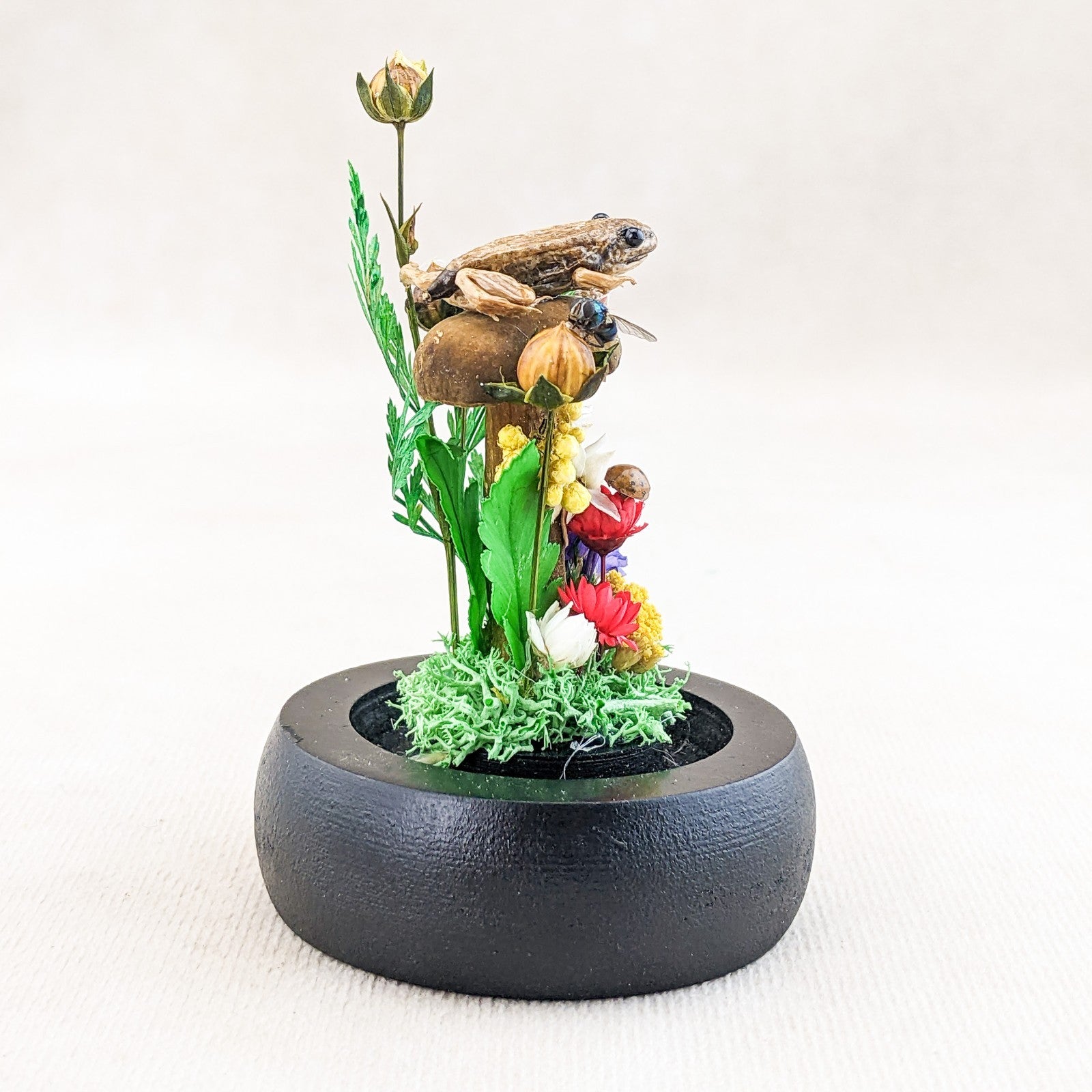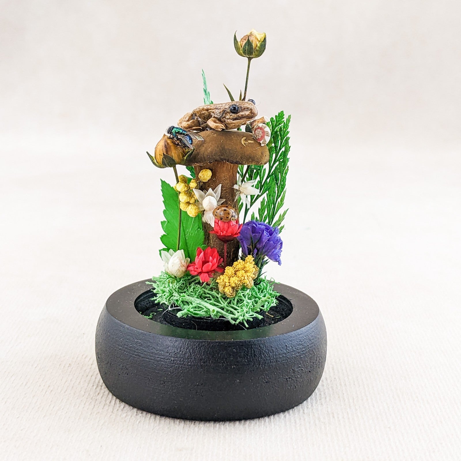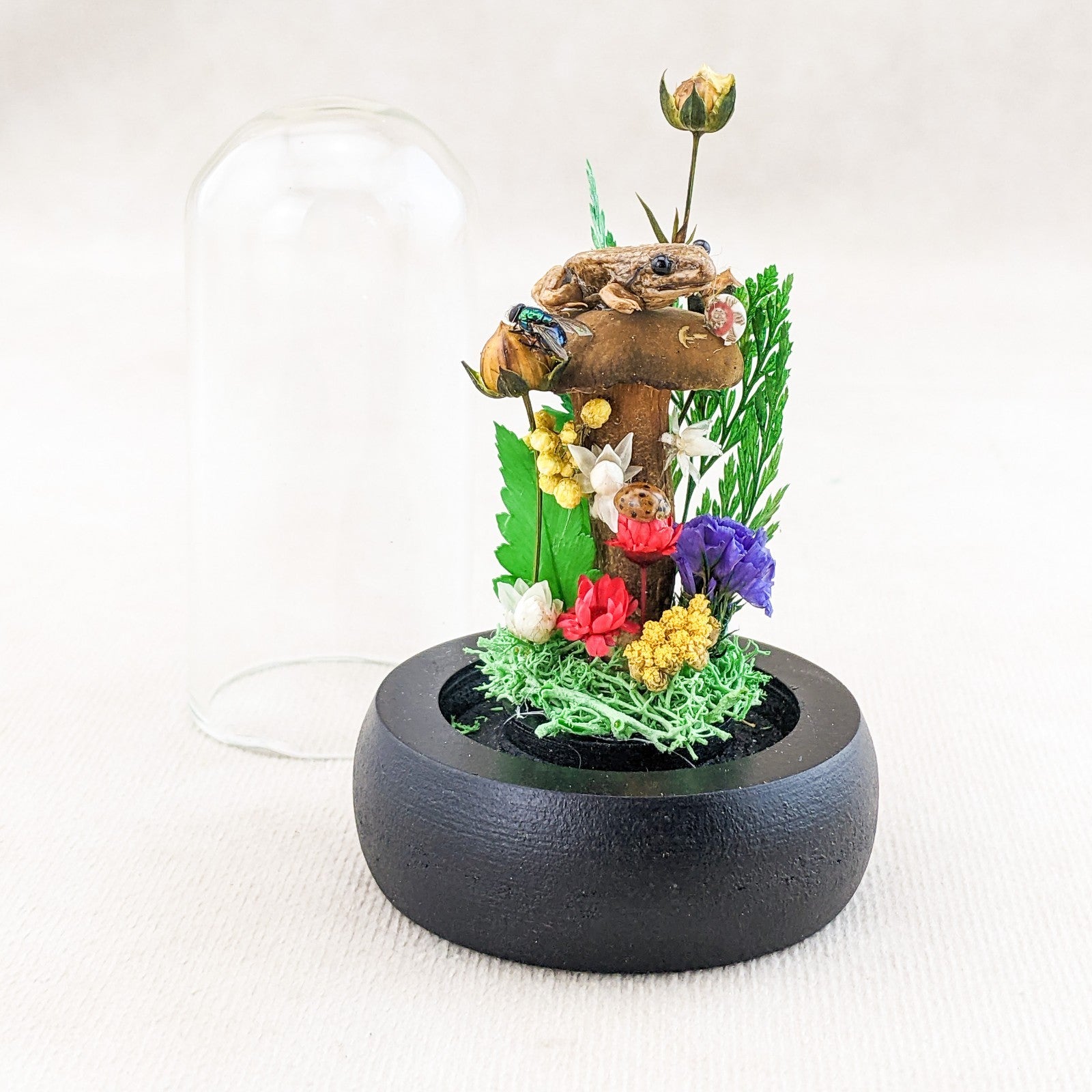 This is a very nice juvenile Leopard Frog showcased nicely in a Glass Dome Display surrounded by preserved flowers and ferns.  It also includes a real lady bug, fly and snail.  This display would be a great starter piece or a wonderful addition to any collection.  A lot of these are also being used for educational pieces in the classroom!  The glass dome and wood base will keep your specimen clean and safe for years to come.  This display is approx.     3 1/2 x 2 1/4"                  .