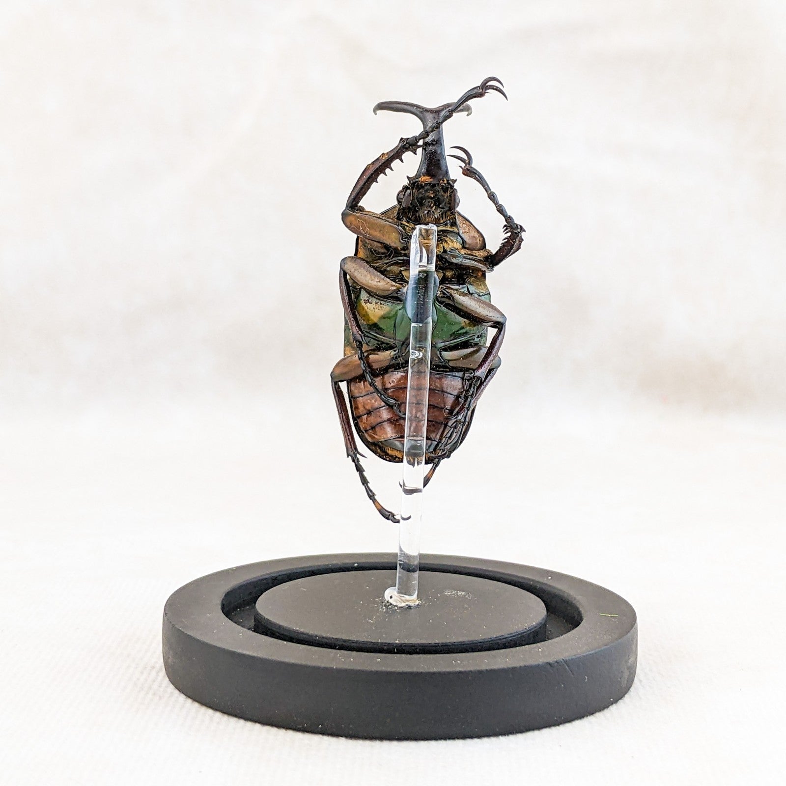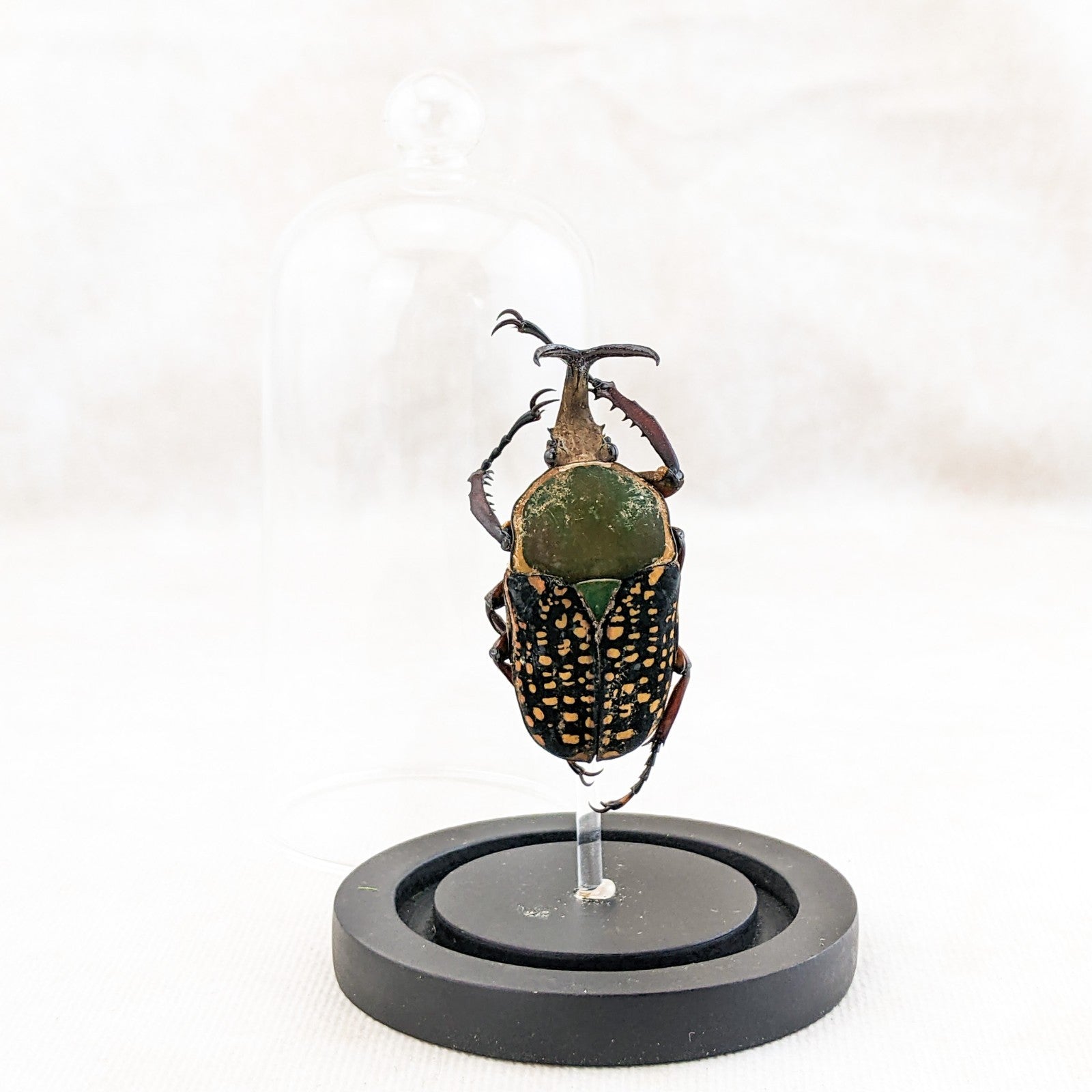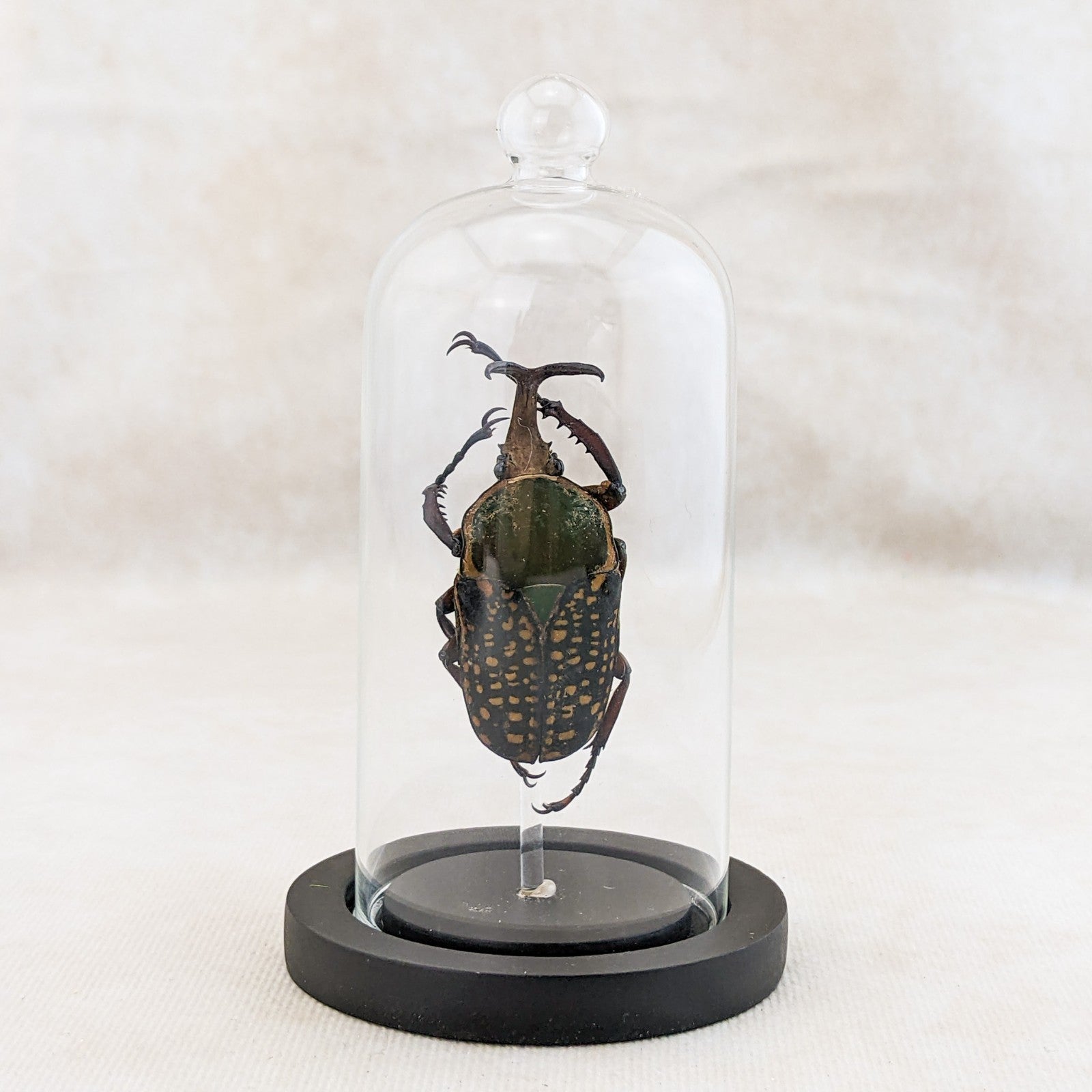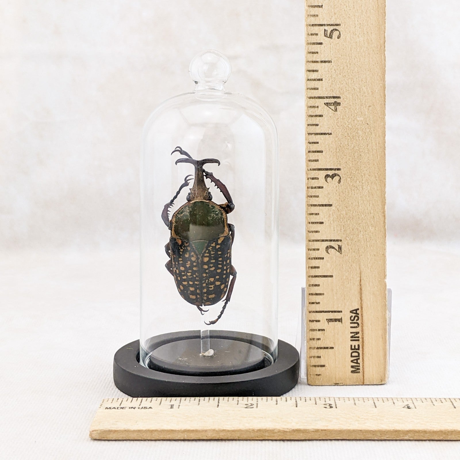 M48 #8 This is a large beautiful colorful Beetle! He is showcased nicely in a glass dome display and the dome has a ball top and a wood base. This display is approx. 4 1/2 x 2 1/2" and the insect itself is between 50 to 60 mm. This would be a great addition to any collection! For shipping purposes the beetle is attached to the post and wrapped seperate, when you receive you just unwrap slowly and carefully and then place post in the predrilled hole in the base (you may add a drop of glue to keep it more secure as well).