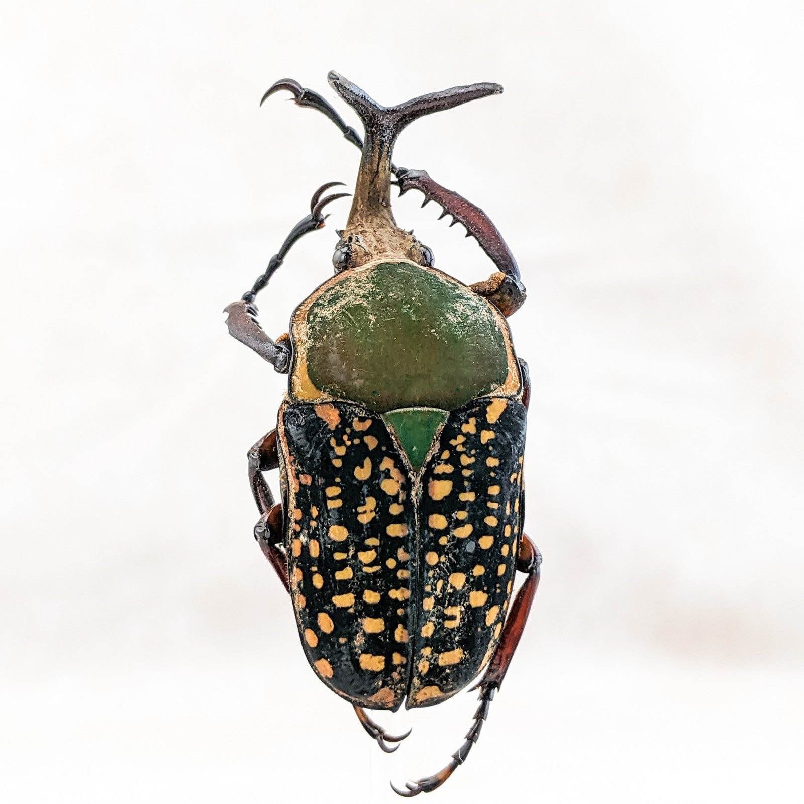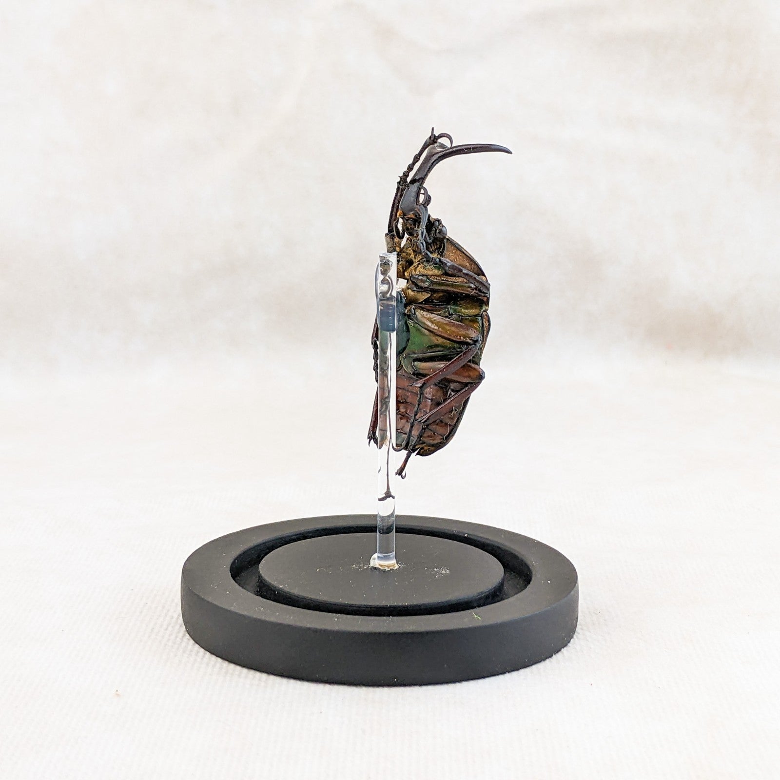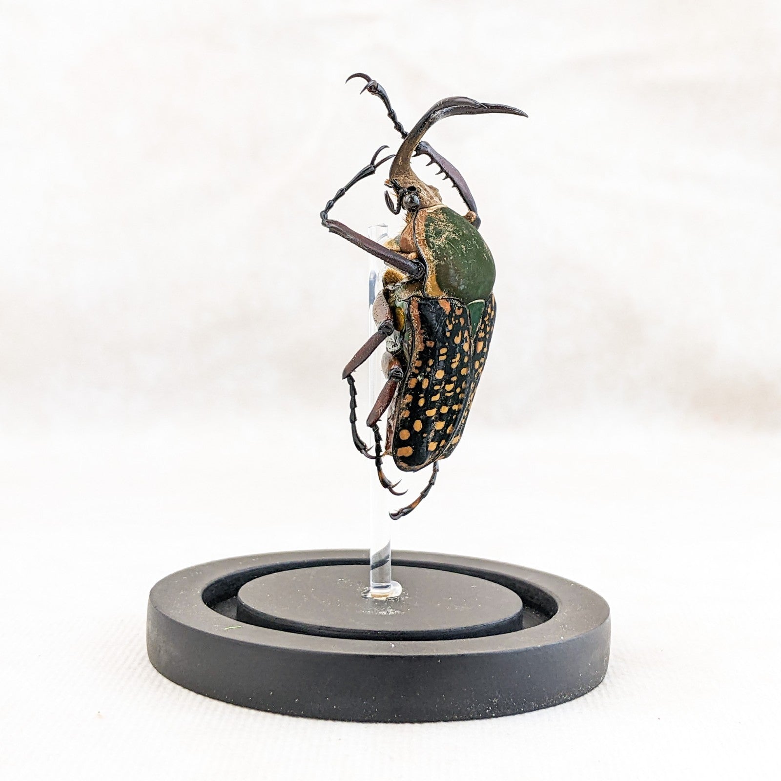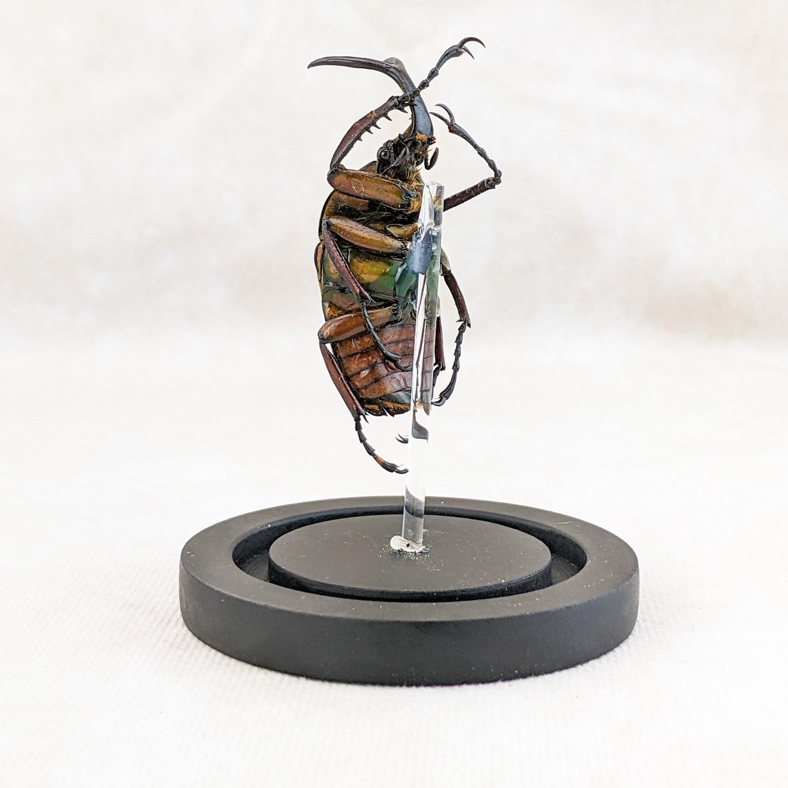 M48 #8 This is a large beautiful colorful Beetle! He is showcased nicely in a glass dome display and the dome has a ball top and a wood base. This display is approx. 4 1/2 x 2 1/2" and the insect itself is between 50 to 60 mm. This would be a great addition to any collection! For shipping purposes the beetle is attached to the post and wrapped seperate, when you receive you just unwrap slowly and carefully and then place post in the predrilled hole in the base (you may add a drop of glue to keep it more secure as well).