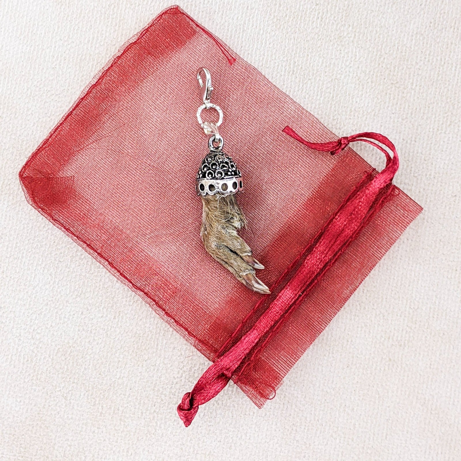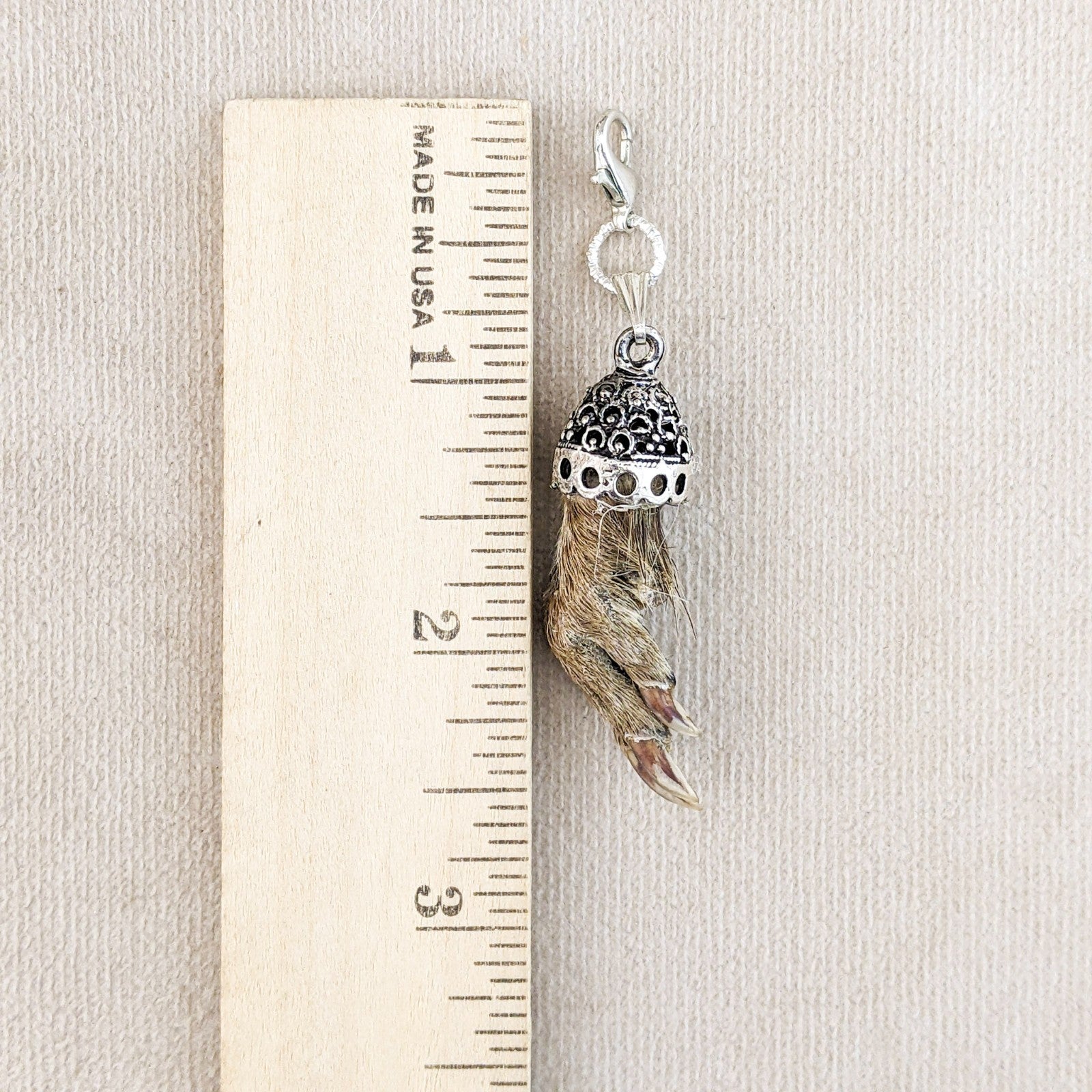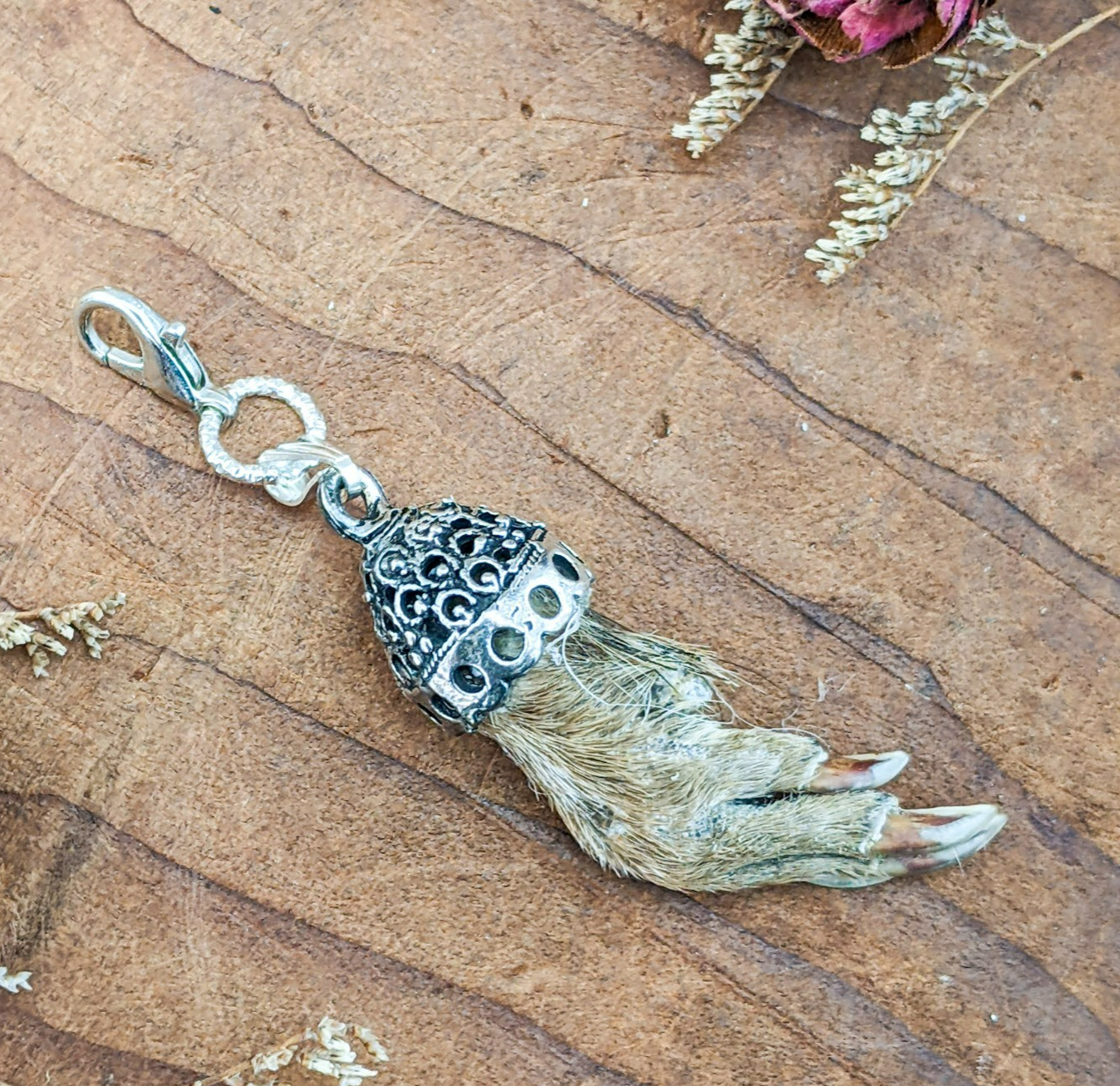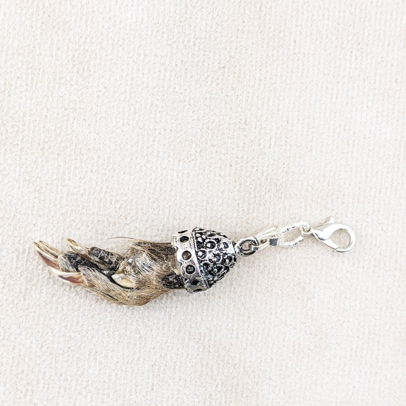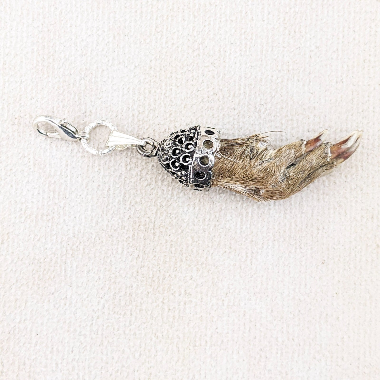 jw54 This is a Fancy capped Real Muskrat foot charm! This hangs on lobster claw clasp. It can be used on a necklace, bling, or as a charivari trophy or charm to be worn on Lederhosen: