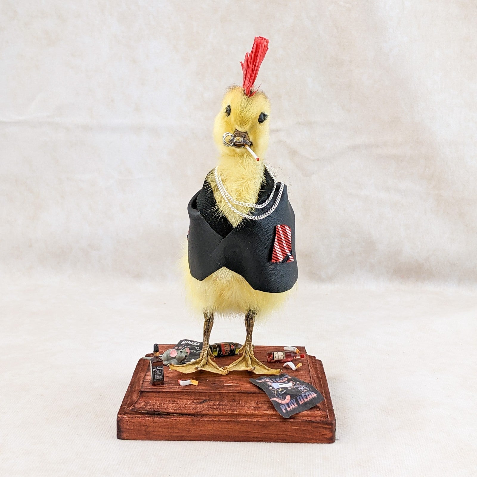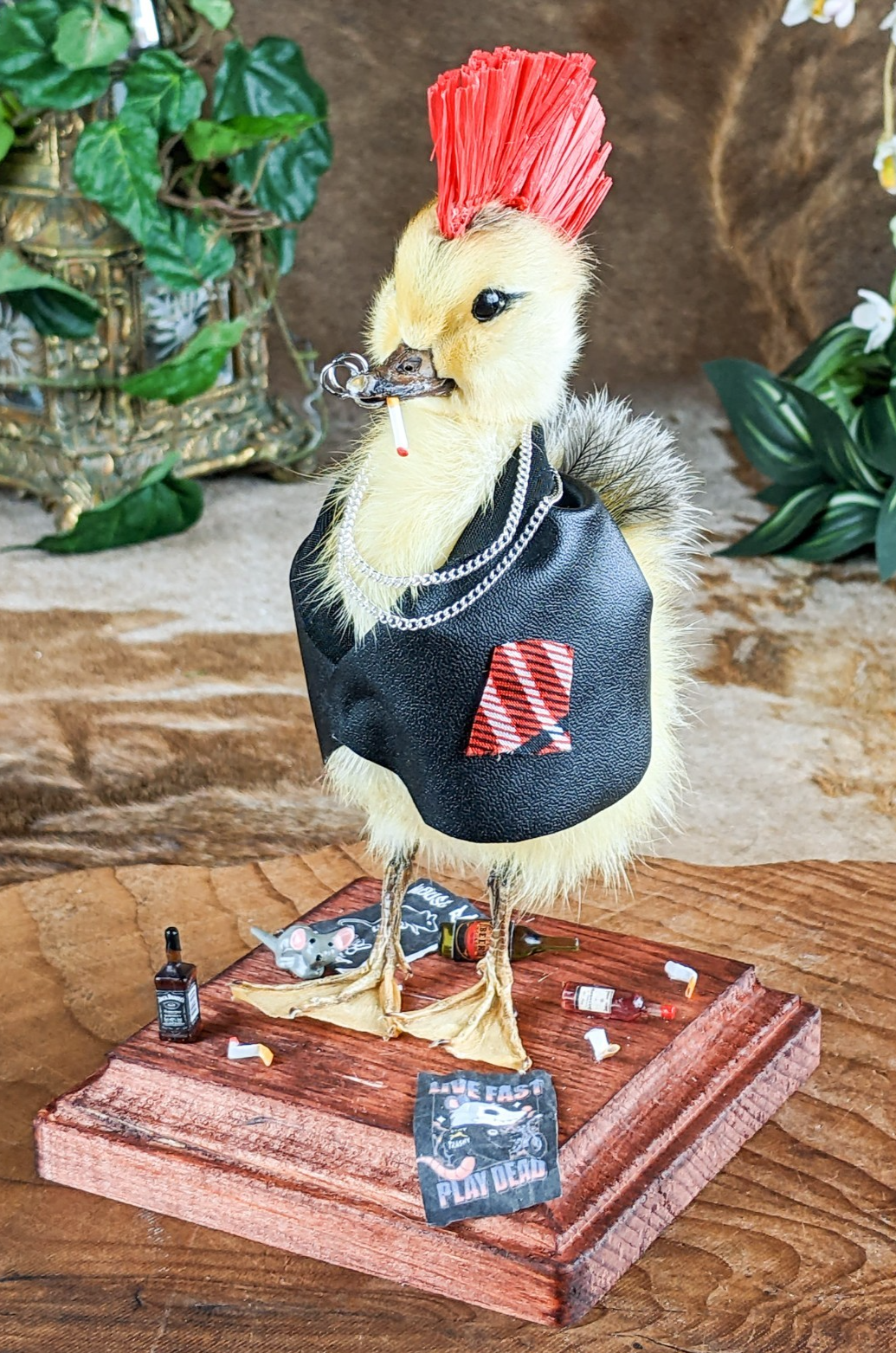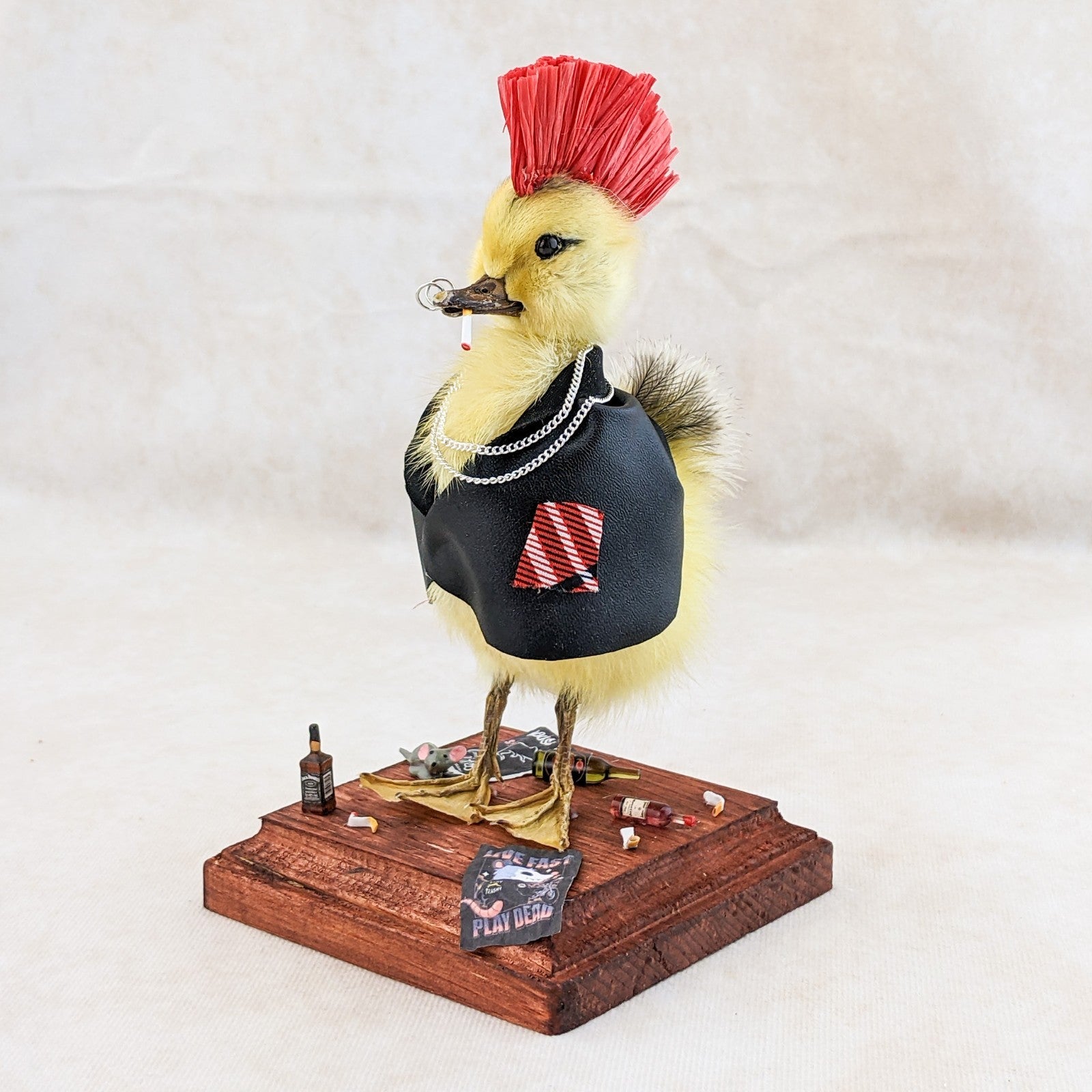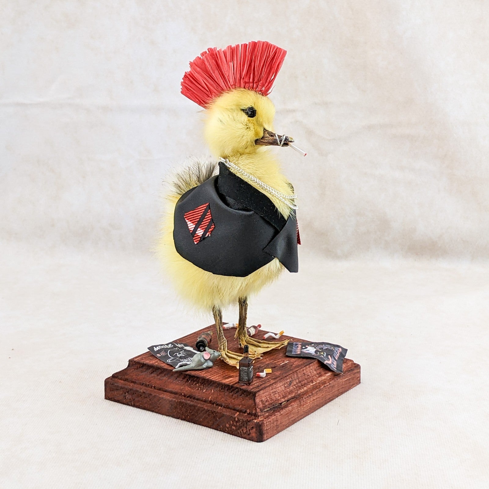 Meet the ultimate rebel of the oddities world: a taxidermy yellow duckling transformed into a punk icon. Rocking a black leather jacket, a fiery red mohawk, and edgy ring piercings in his bill, this bold duckling oozes defiance and attitude. A chain necklace completes his hardcore ensemble, while a cigarette dangles nonchalantly from his mouth.