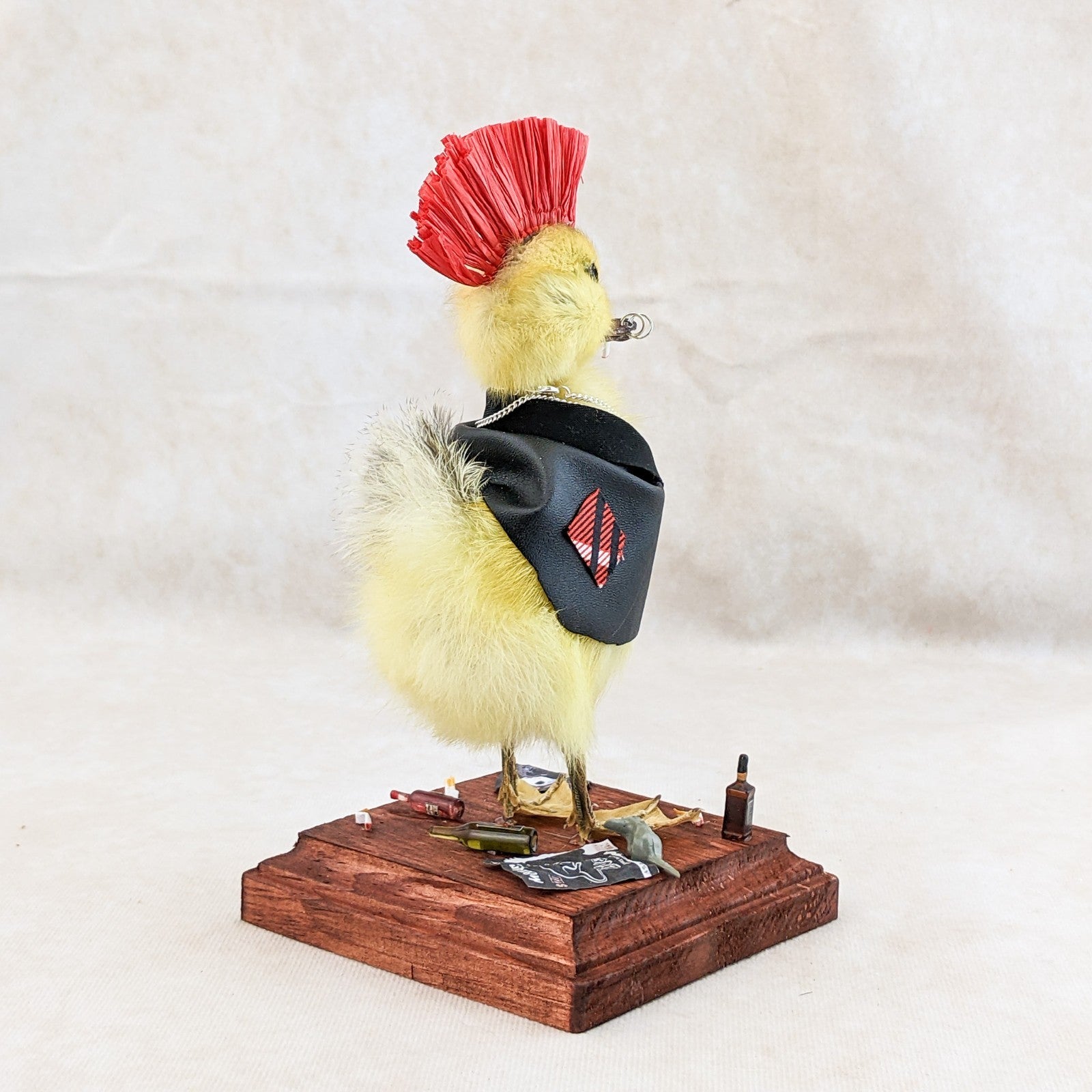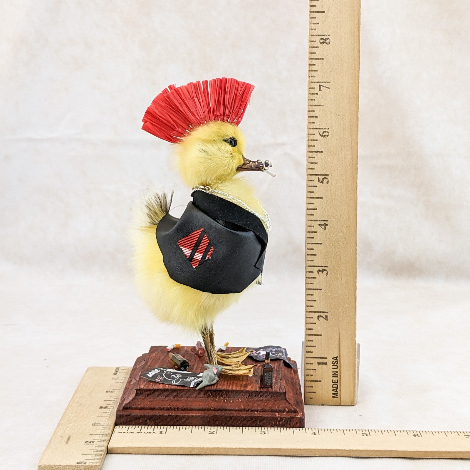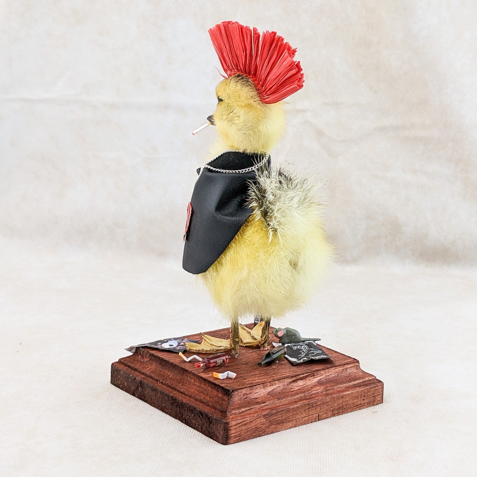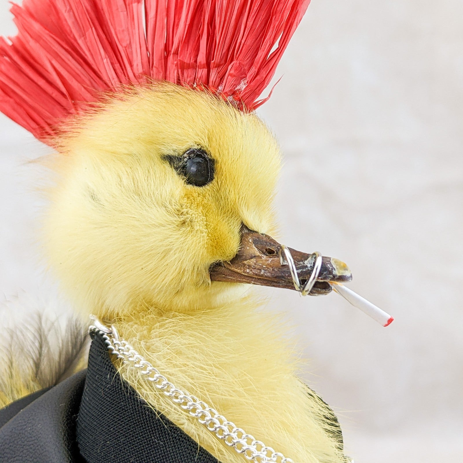 Meet the ultimate rebel of the oddities world: a taxidermy yellow duckling transformed into a punk icon. Rocking a black leather jacket, a fiery red mohawk, and edgy ring piercings in his bill, this bold duckling oozes defiance and attitude. A chain necklace completes his hardcore ensemble, while a cigarette dangles nonchalantly from his mouth.