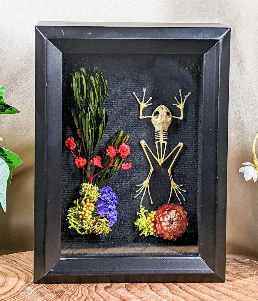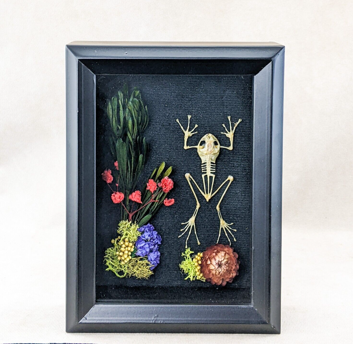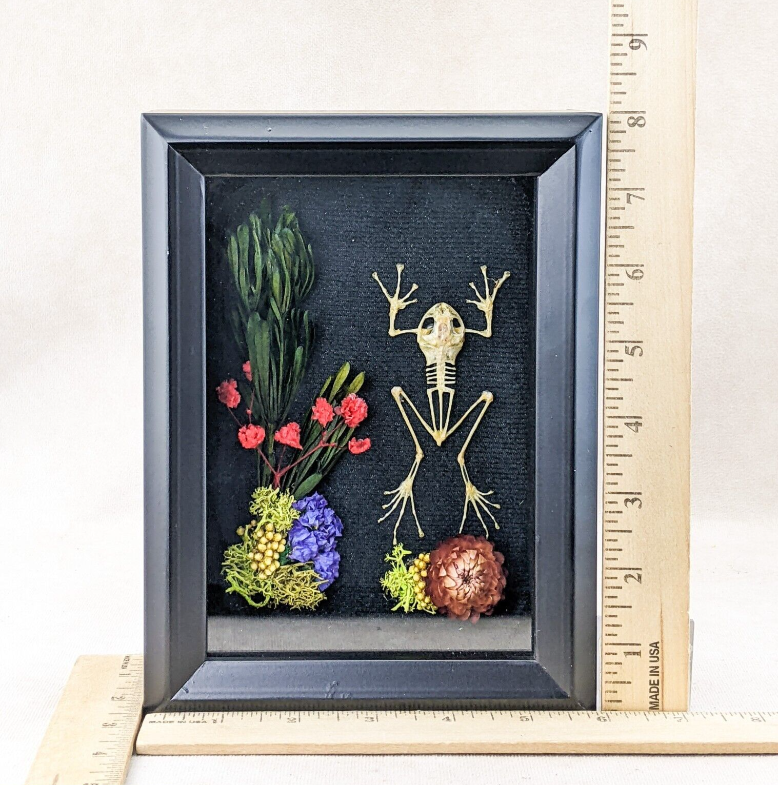 P42c #1.11 This is a nicely showcased frog skeleton with preserved flowers and fern in a black frame on Black backing Shadowbox. The display is approx. 5 x 7. He really shows up in the display and would look great in any collection! This display is sharp and looks great! Your specimen will stay clean and safe for years to come in this display.