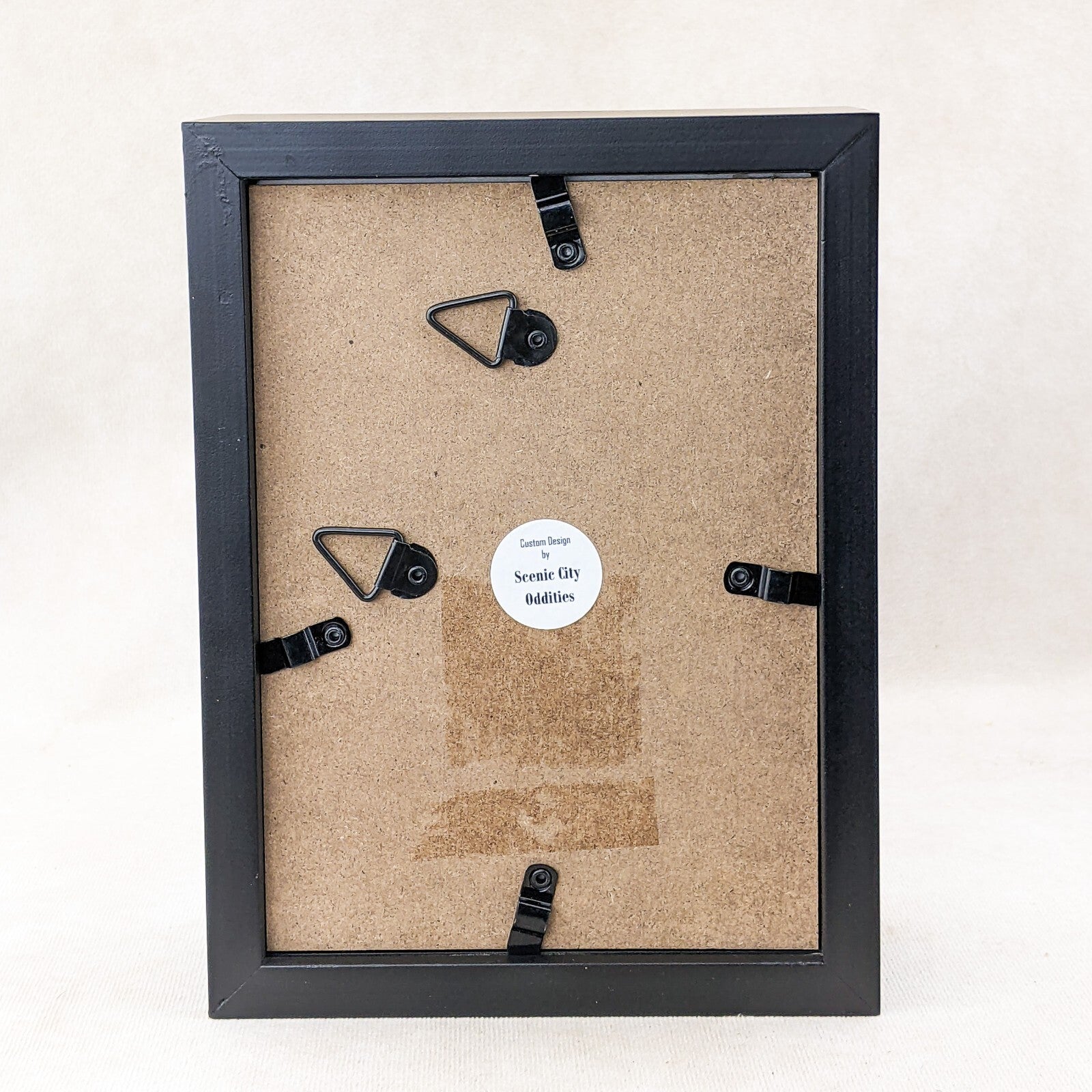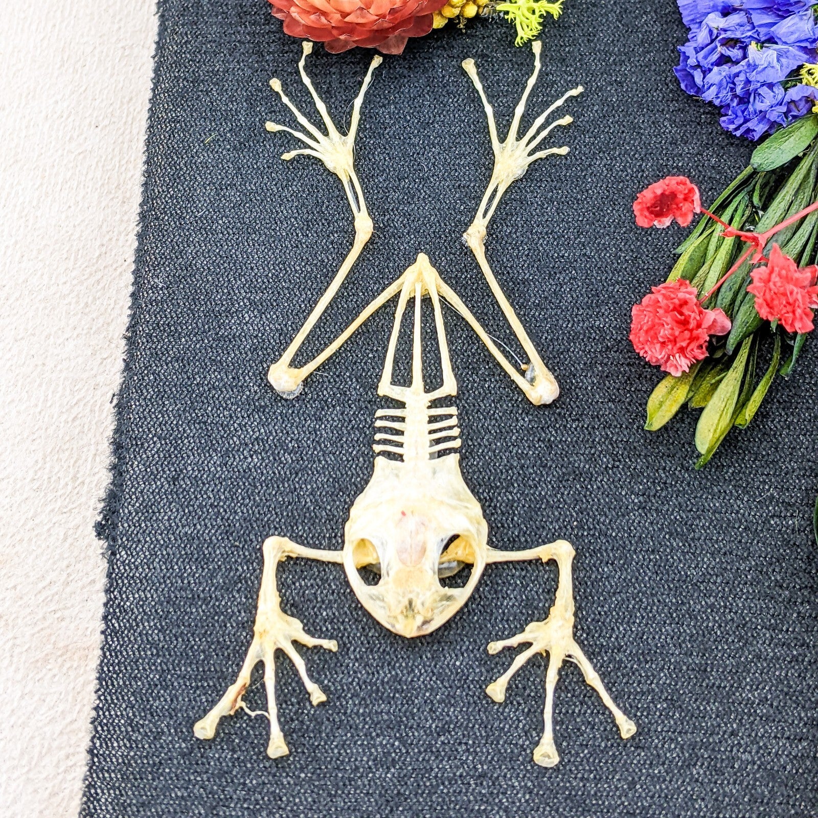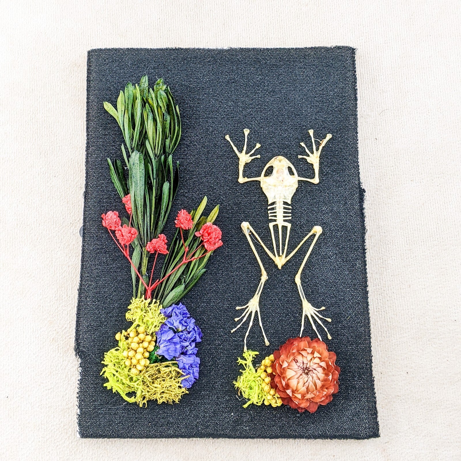 P42c #1.11 This is a nicely showcased frog skeleton with preserved flowers and fern in a black frame on Black backing Shadowbox. The display is approx. 5 x 7. He really shows up in the display and would look great in any collection! This display is sharp and looks great! Your specimen will stay clean and safe for years to come in this display.
