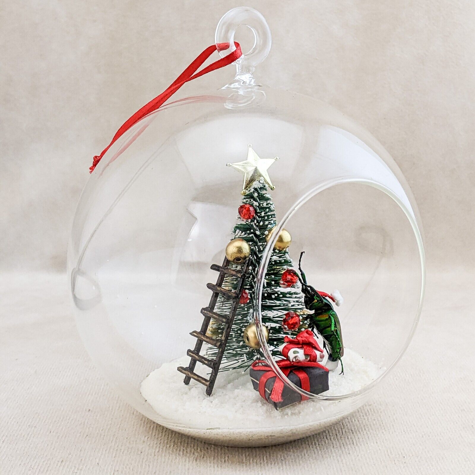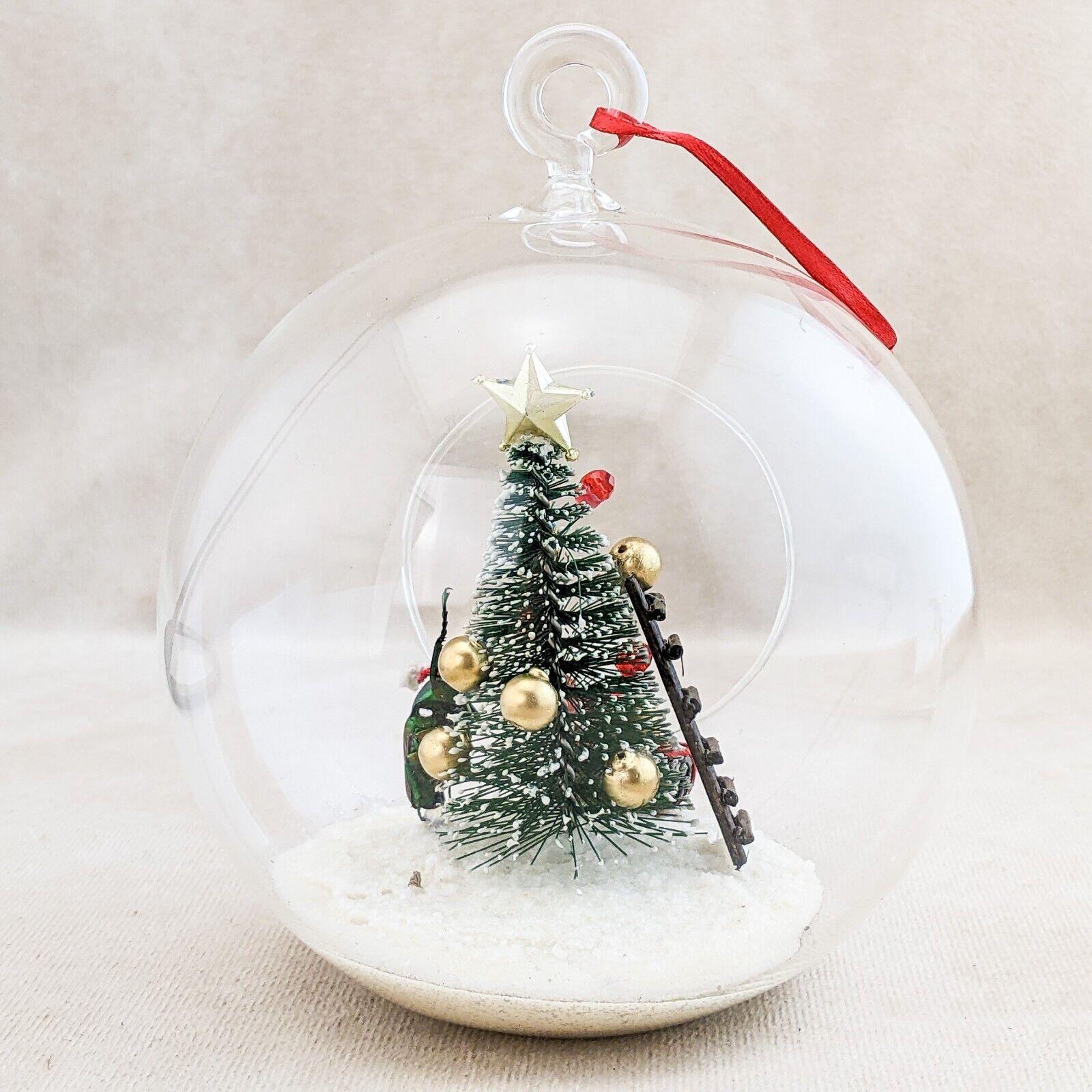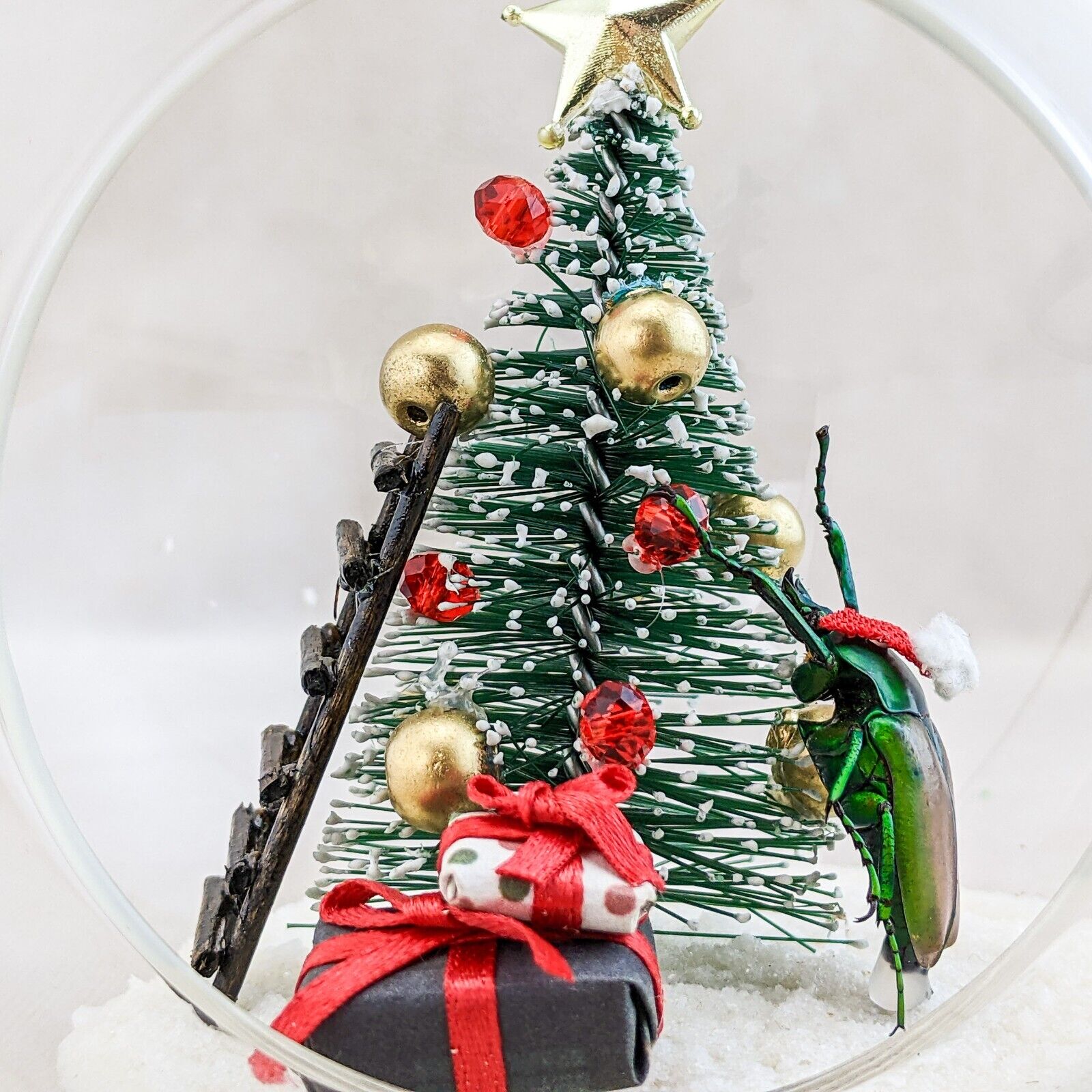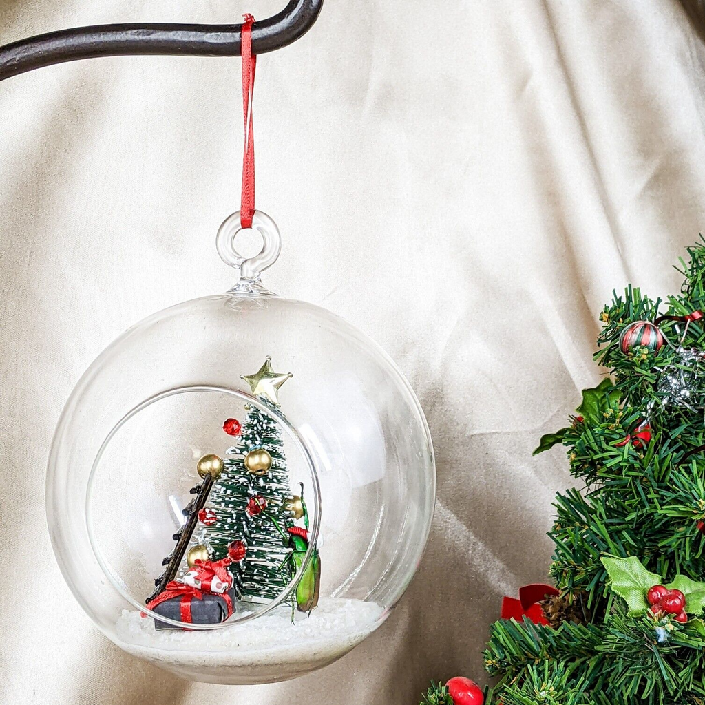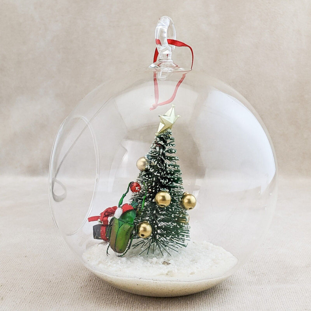 A57B # 8 Bring a touch of whimsy to your holiday decor with this enchanting flower beetle glass bulb tree decoration! Inside the clear glass, a charming winter scene unfolds: a delicate snow-like base cradles a festive Christmas tree adorned with vibrant red and gold ornaments, topped with a sparkling gold star. Our beetle, poised beside the tree, adds a playful element as he appears to hang an ornament, while a quaint brown ladder leans against the tree, inviting imagination. Two beautifully wrapped gifts sit beneath, completing this delightful winter wonderland. Perfect for brightening your workspace or adding a unique accent to your holiday displays! Approx 4" x 5 1/2"