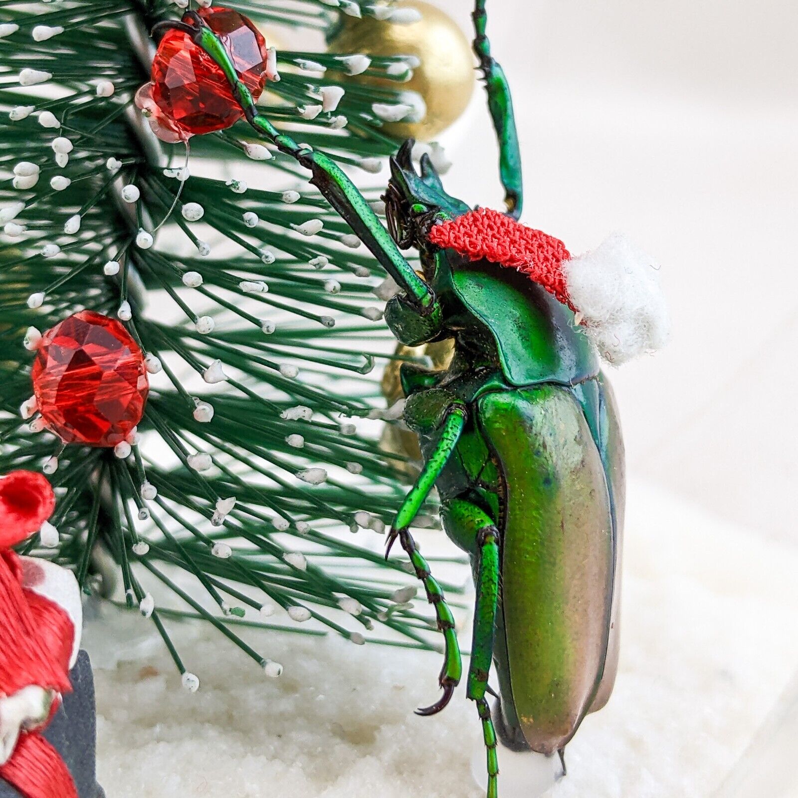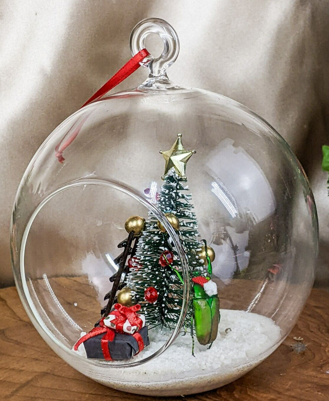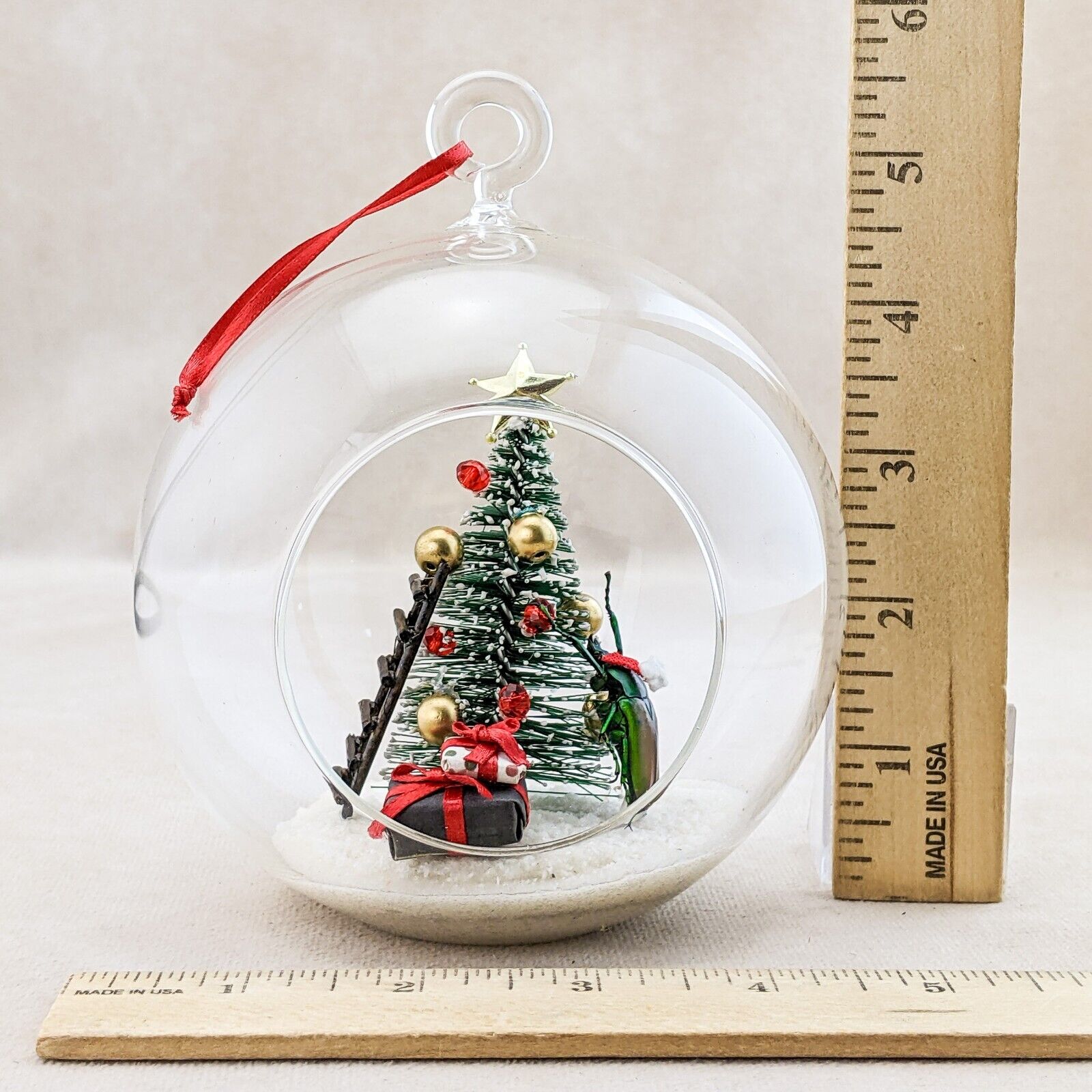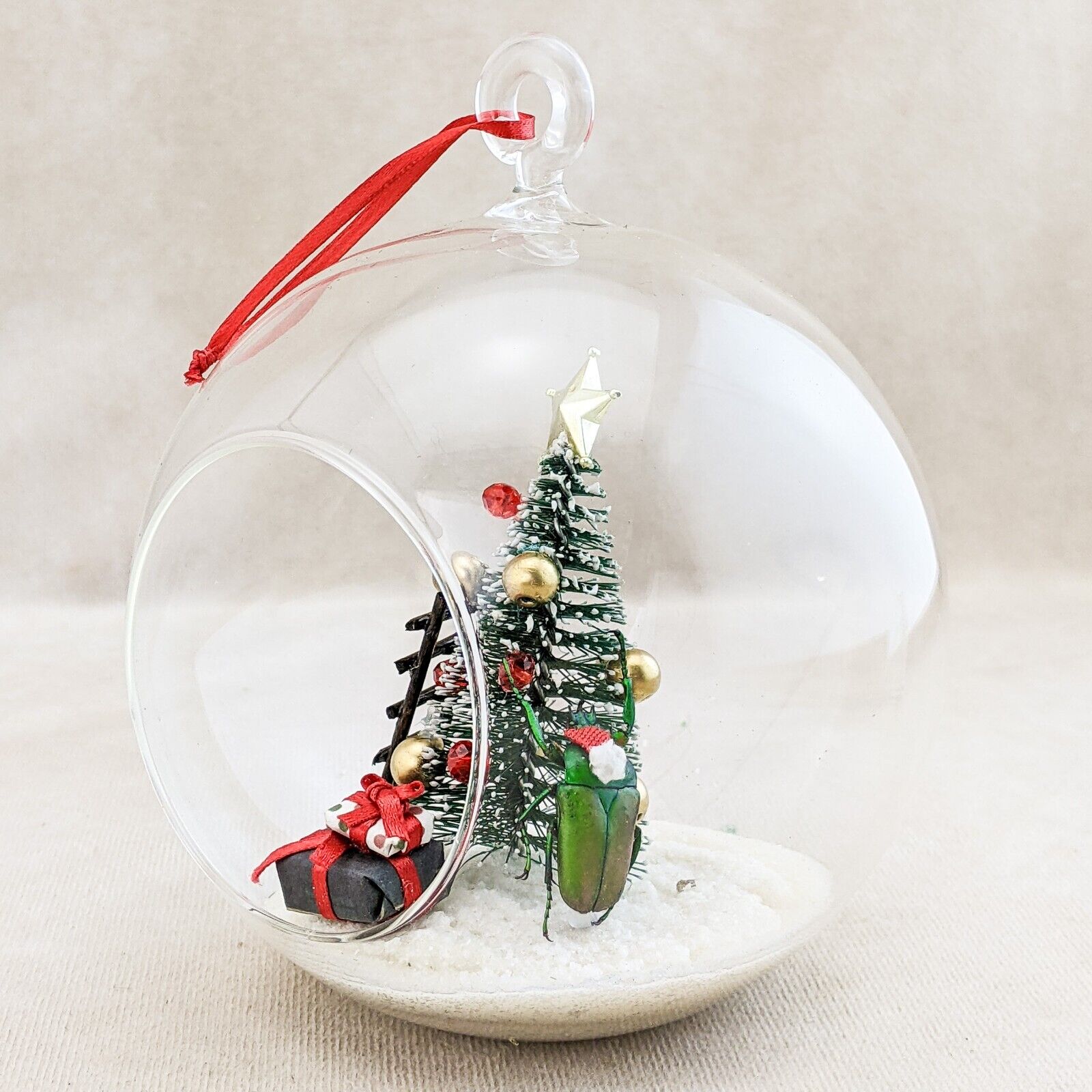 A57B # 8 Bring a touch of whimsy to your holiday decor with this enchanting flower beetle glass bulb tree decoration! Inside the clear glass, a charming winter scene unfolds: a delicate snow-like base cradles a festive Christmas tree adorned with vibrant red and gold ornaments, topped with a sparkling gold star. Our beetle, poised beside the tree, adds a playful element as he appears to hang an ornament, while a quaint brown ladder leans against the tree, inviting imagination. Two beautifully wrapped gifts sit beneath, completing this delightful winter wonderland. Perfect for brightening your workspace or adding a unique accent to your holiday displays! Approx 4" x 5 1/2"