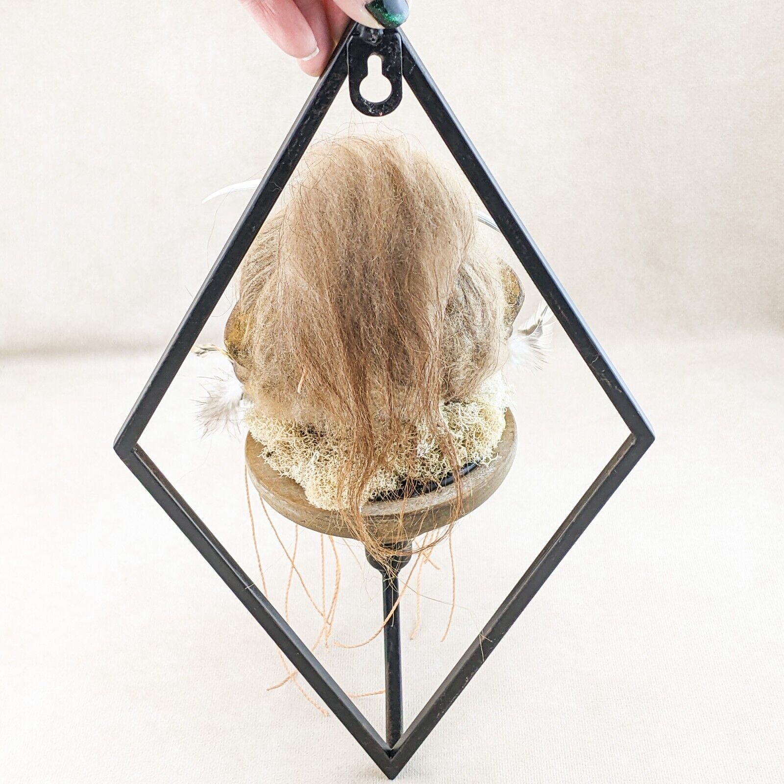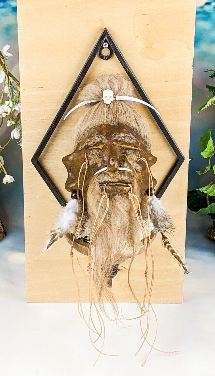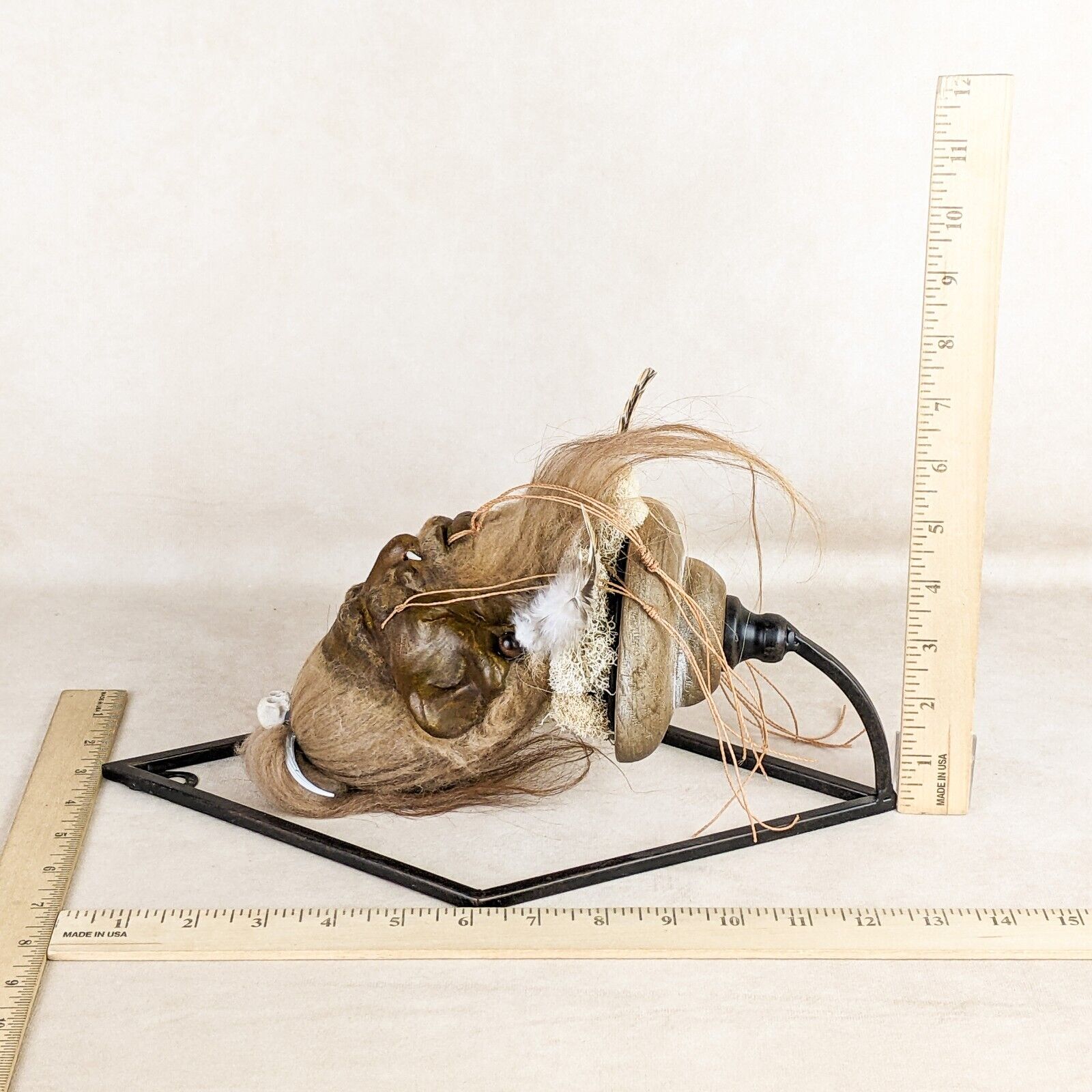 So much for just hanging around, you can lose your head! Sure to creep even the stoutest of hearts! He has been made by local tribesmen with indigenous features. He has very long hair and facial hair. Each head offered has been individually crafted. The tribesmen use domestic goats (species: farmed domestic goats) for the hide and hair. The also use the tribe methods used to make the original shrunken heads. The head was individually crafted from goat hide and hair in Ecuador by a talented artisan using methods comparable to original tsantsa (head shrinking). String is also used to sew the mouth and eyes shut on these guys. This guy is a hanging display that features real preserved moss, 4 real tusk shells, moss, a small faux skull and real feather earrings! approx. size 13 x 7 x 6 1/2", see ruler in last picture.