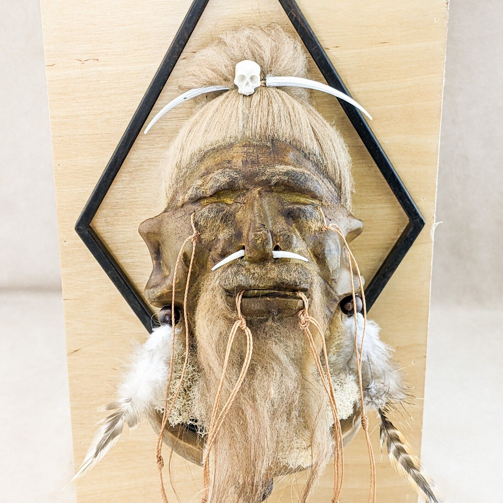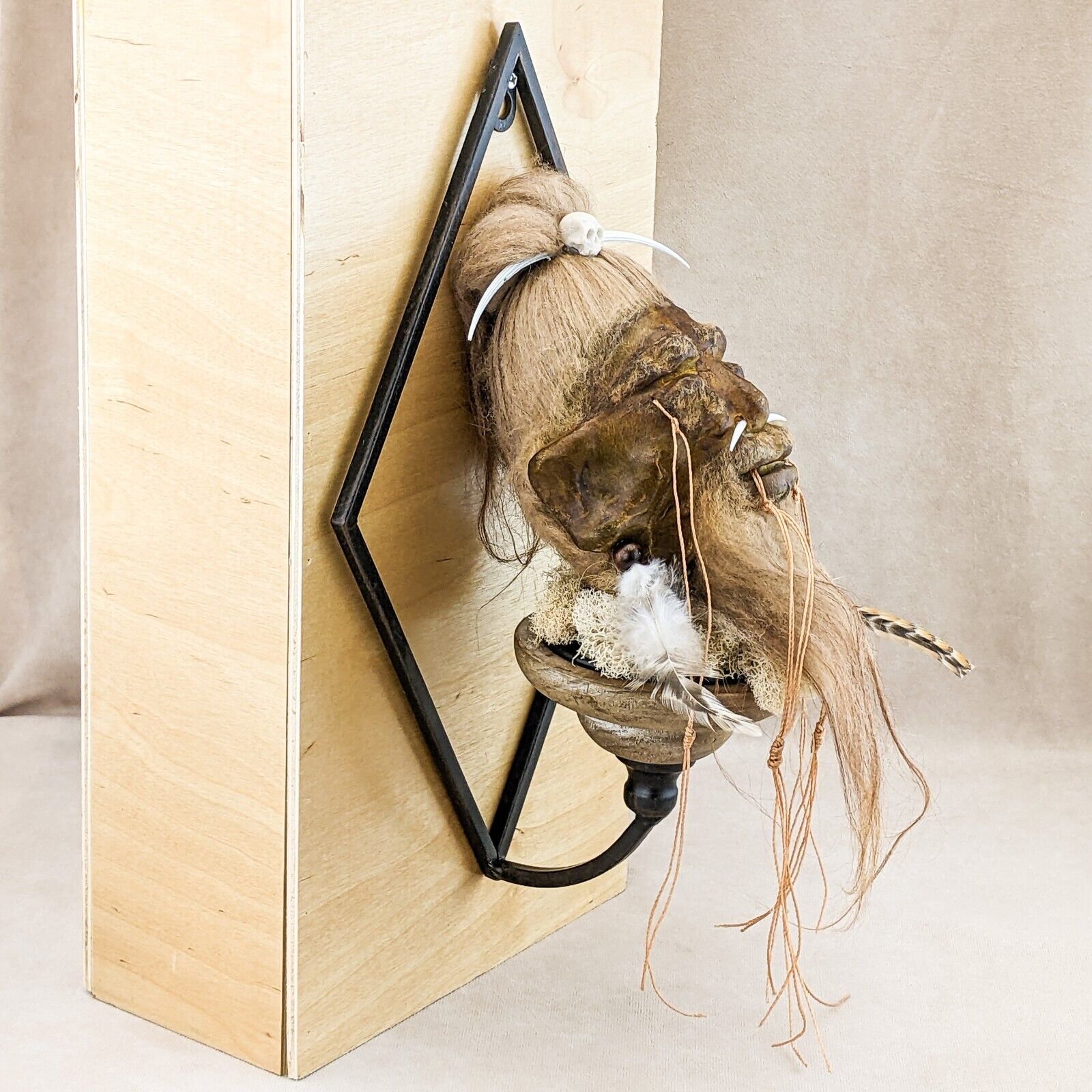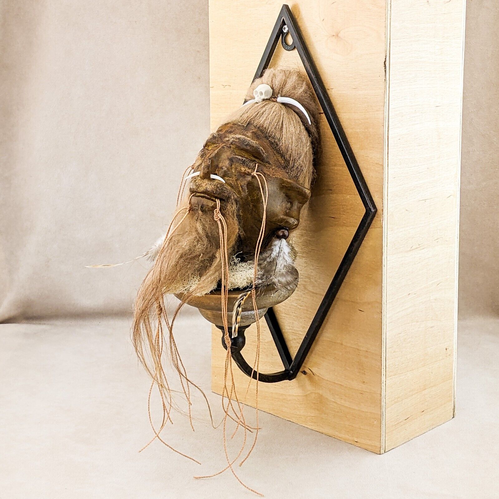 So much for just hanging around, you can lose your head! Sure to creep even the stoutest of hearts! He has been made by local tribesmen with indigenous features. He has very long hair and facial hair. Each head offered has been individually crafted. The tribesmen use domestic goats (species: farmed domestic goats) for the hide and hair. The also use the tribe methods used to make the original shrunken heads. The head was individually crafted from goat hide and hair in Ecuador by a talented artisan using methods comparable to original tsantsa (head shrinking). String is also used to sew the mouth and eyes shut on these guys. This guy is a hanging display that features real preserved moss, 4 real tusk shells, moss, a small faux skull and real feather earrings! approx. size 13 x 7 x 6 1/2", see ruler in last picture.