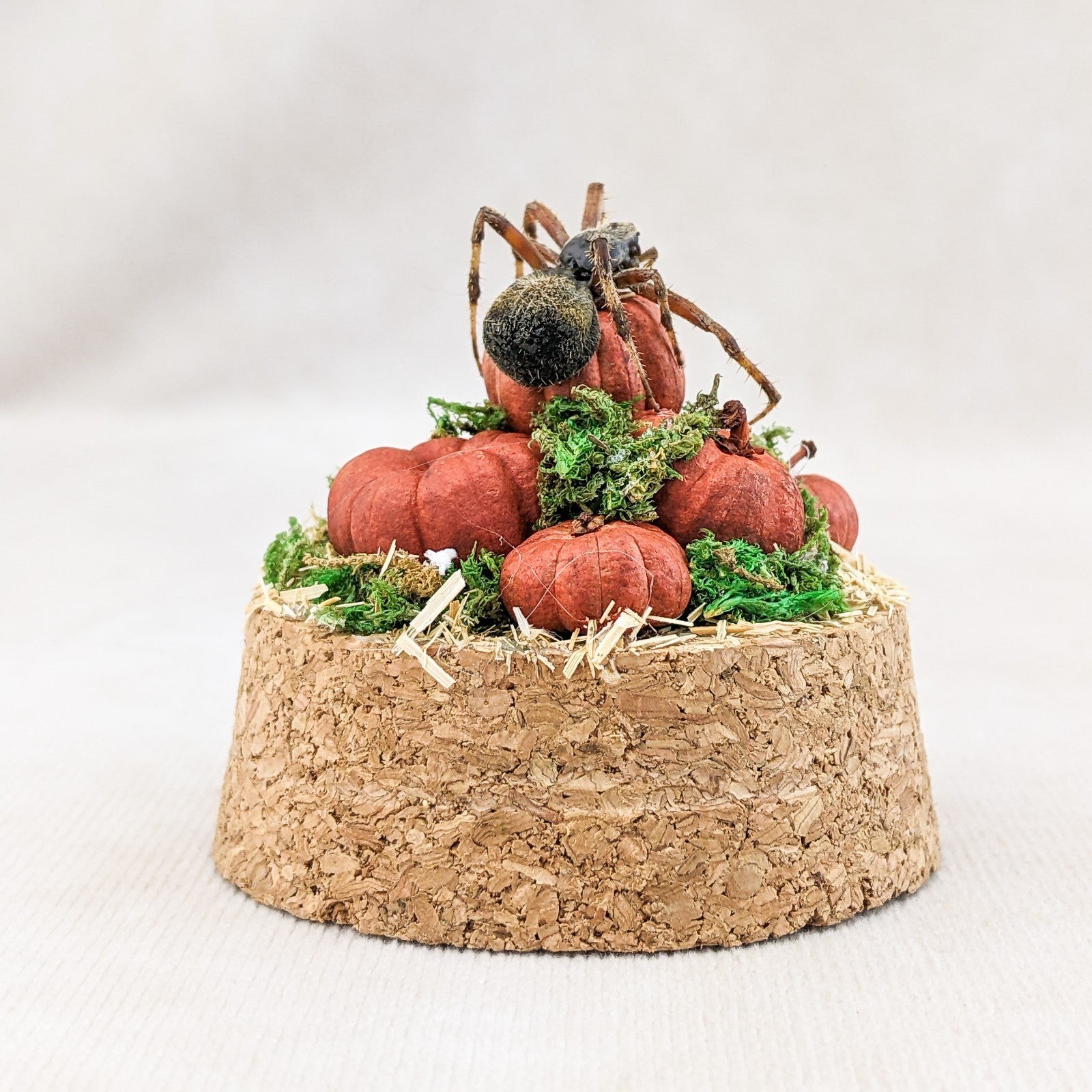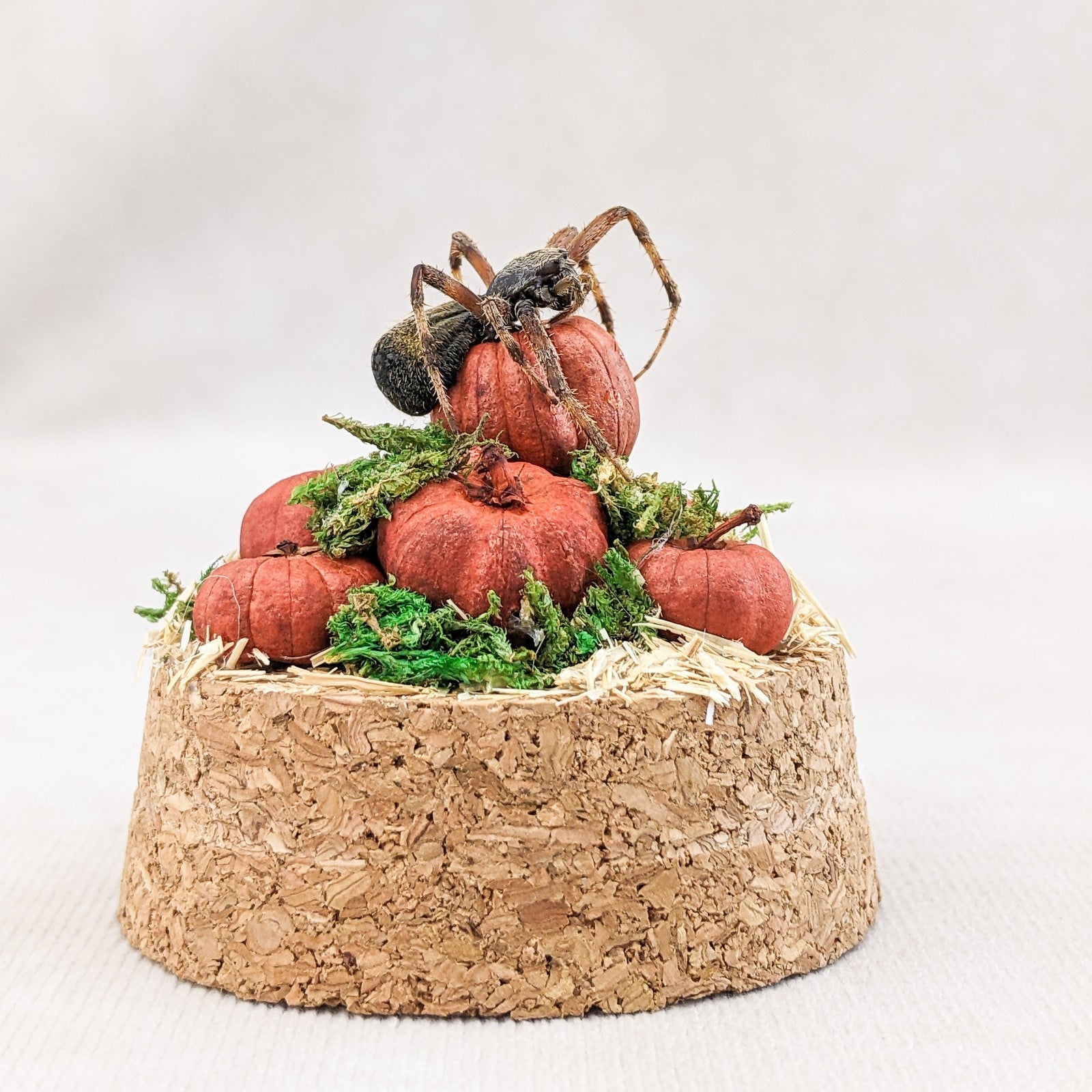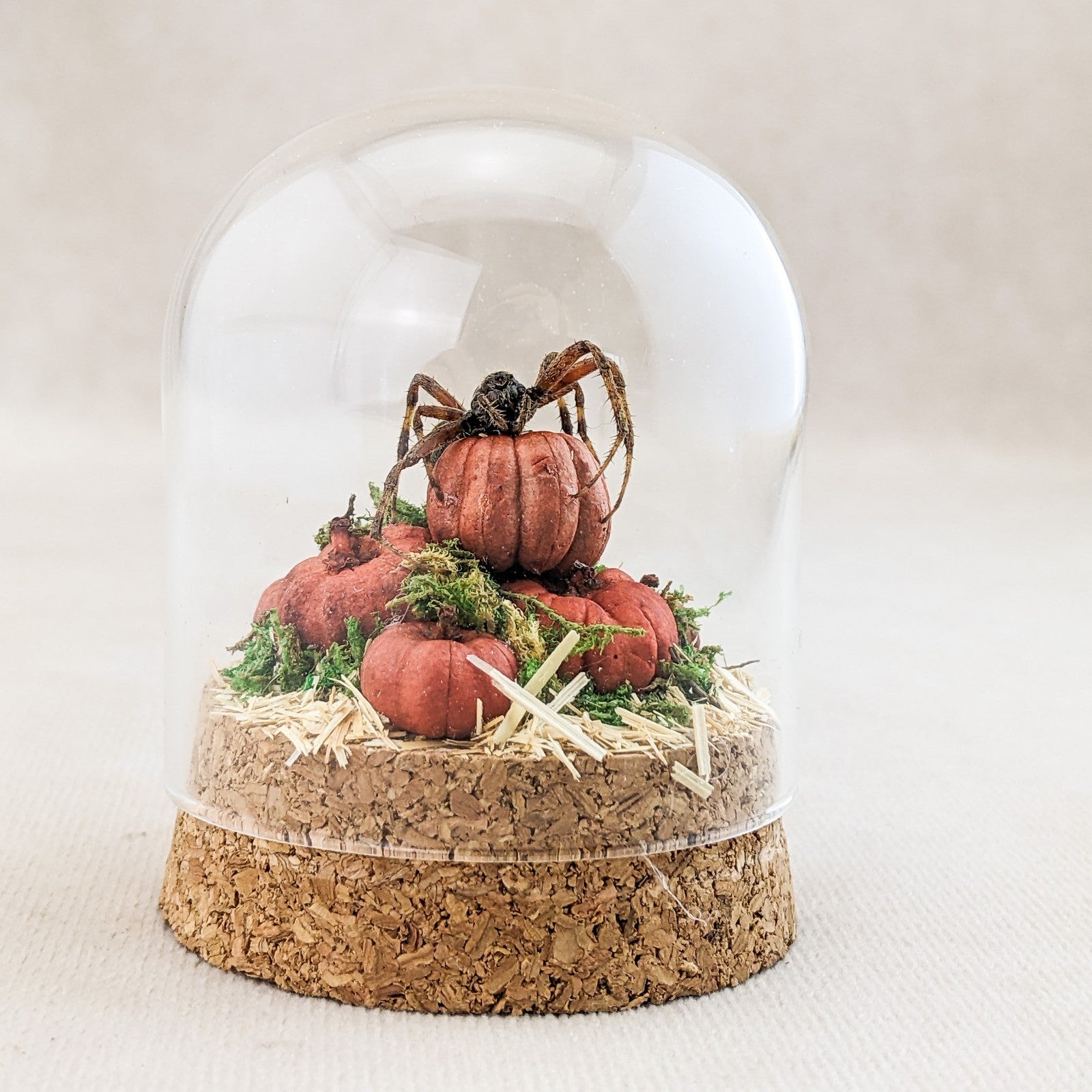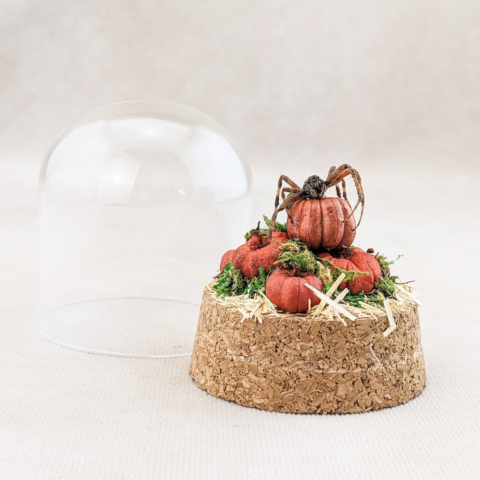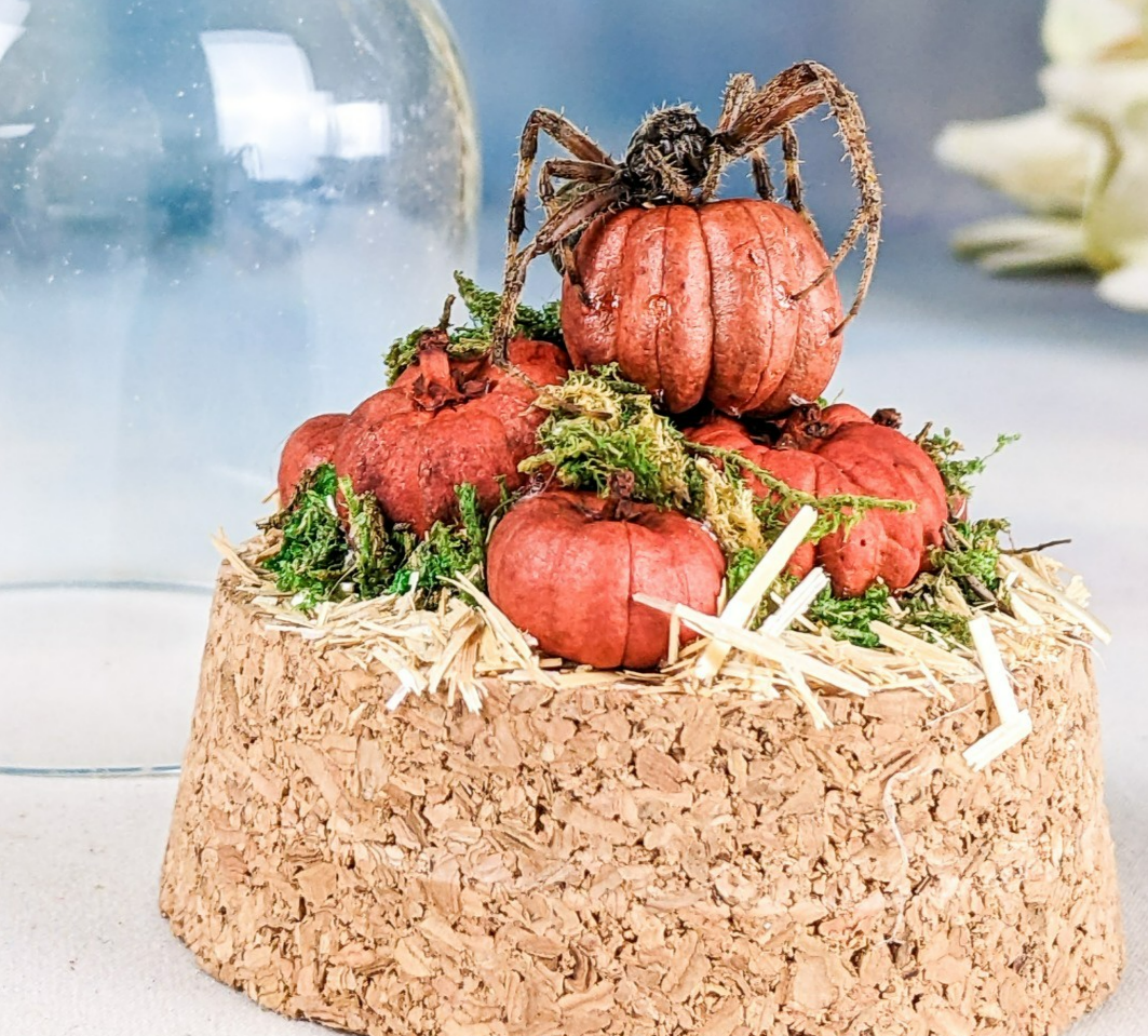 This one-of-a-kind miniature dome features a real spotted orb weaver spider displayed with an autumn harvest theme. The spider is perched elegantly atop a cluster of tiny hand-crafted pumpkins, creeping gracefully as if ready to weave its web. The scene rests on a rustic cork base, with natural moss tucked into the cracks between pumpkins for an added touch of woodland charm. A layer of hay flooring completes the seasonal atmosphere, giving the piece a warm and slightly eerie fall aesthetic.