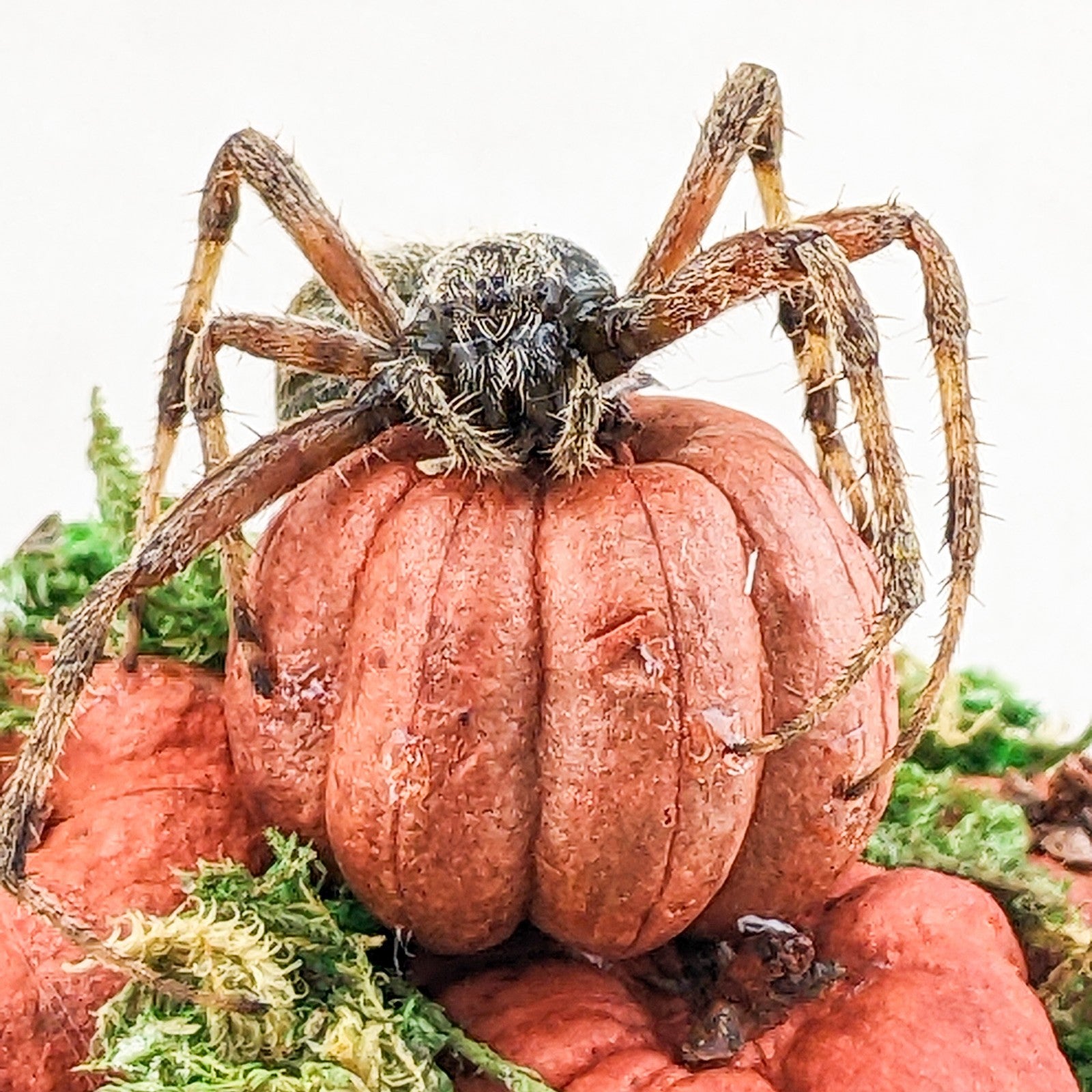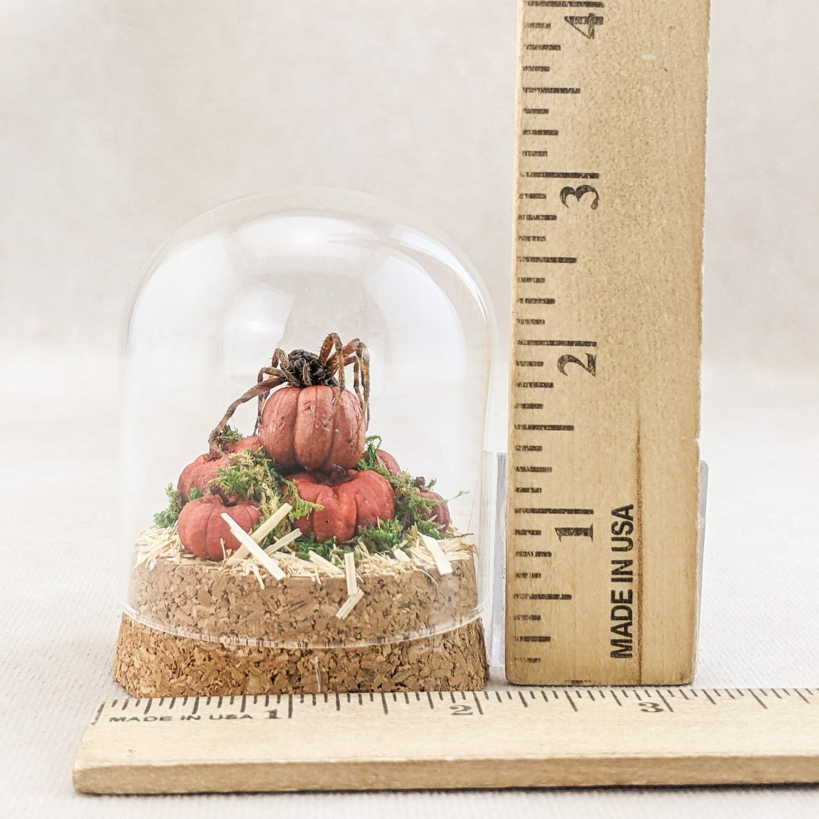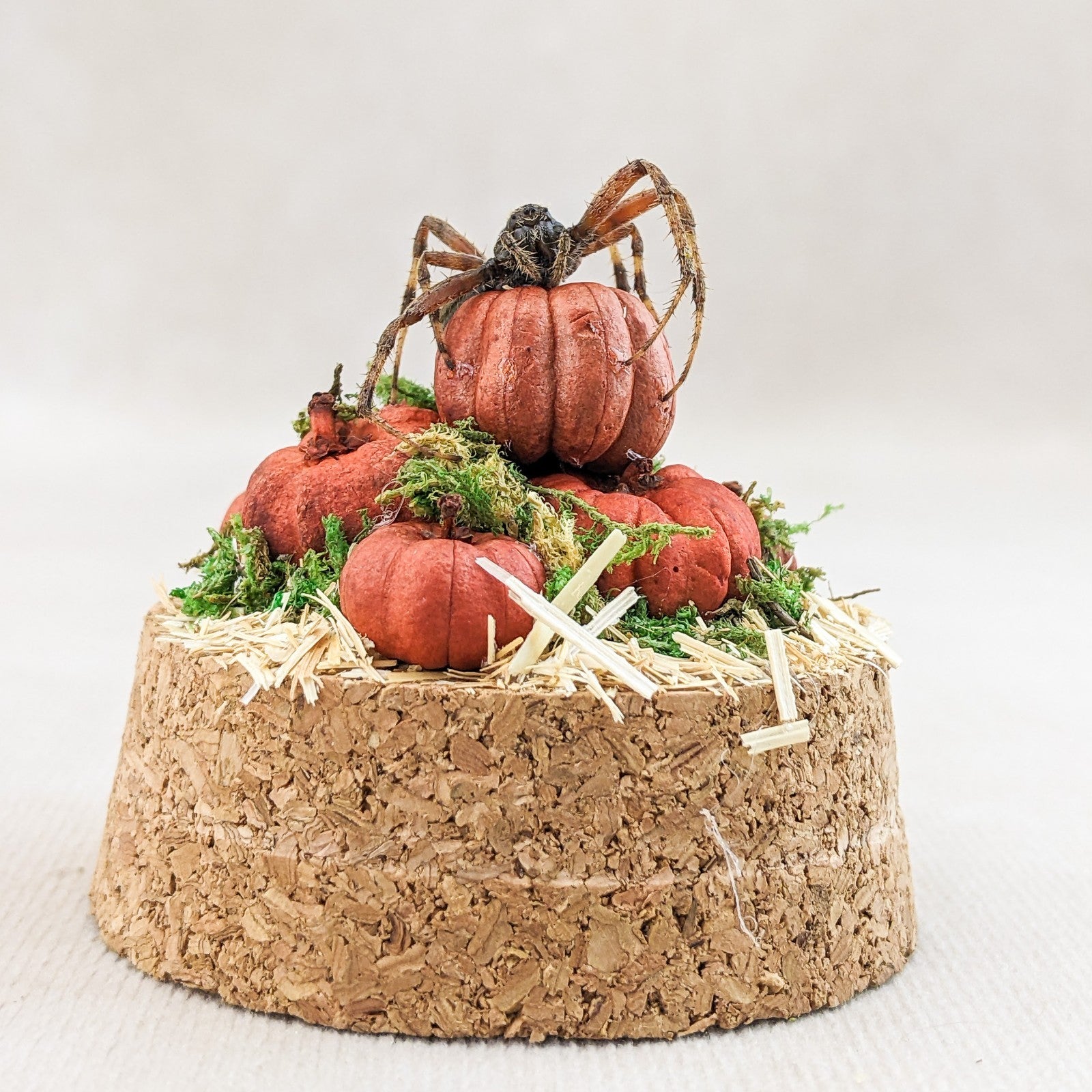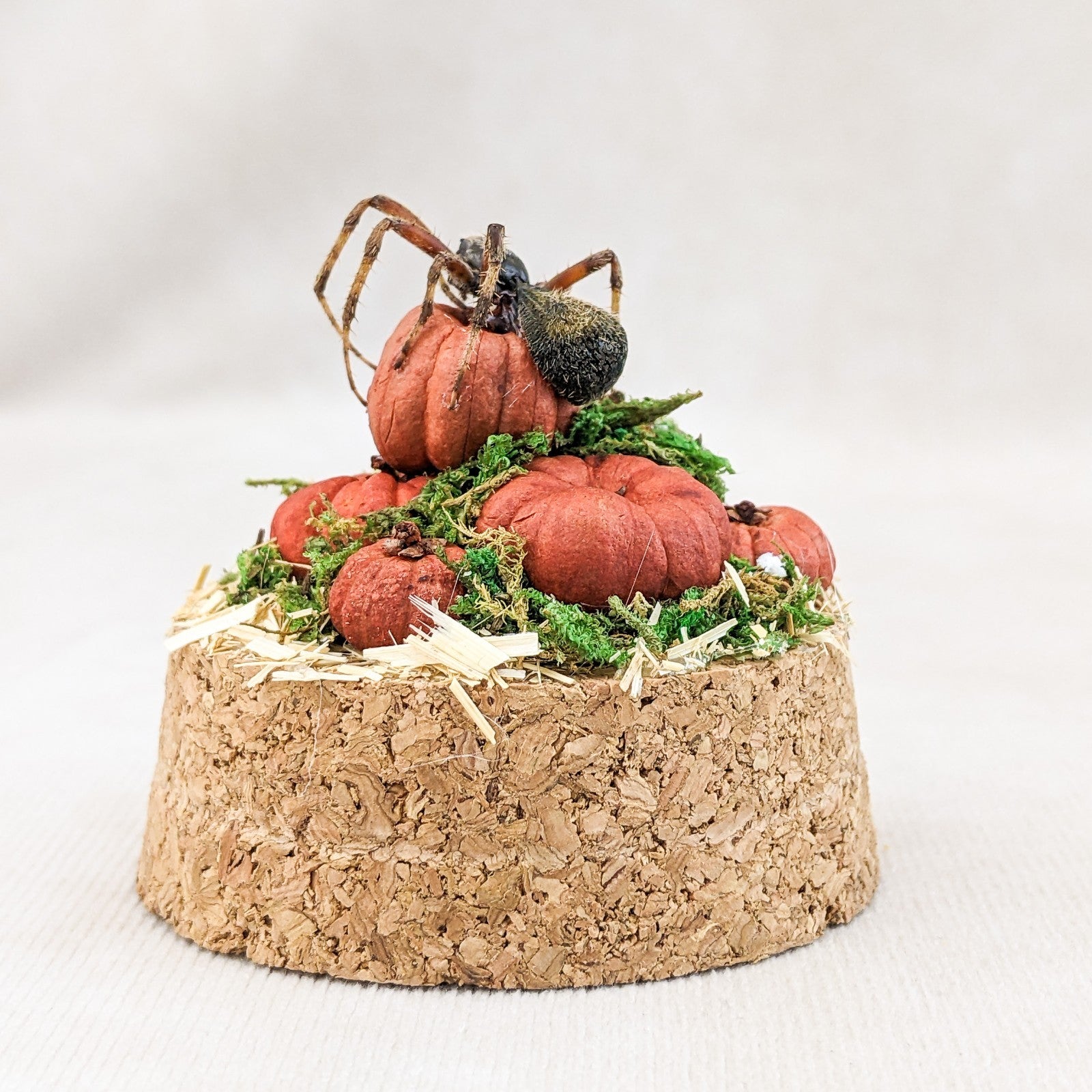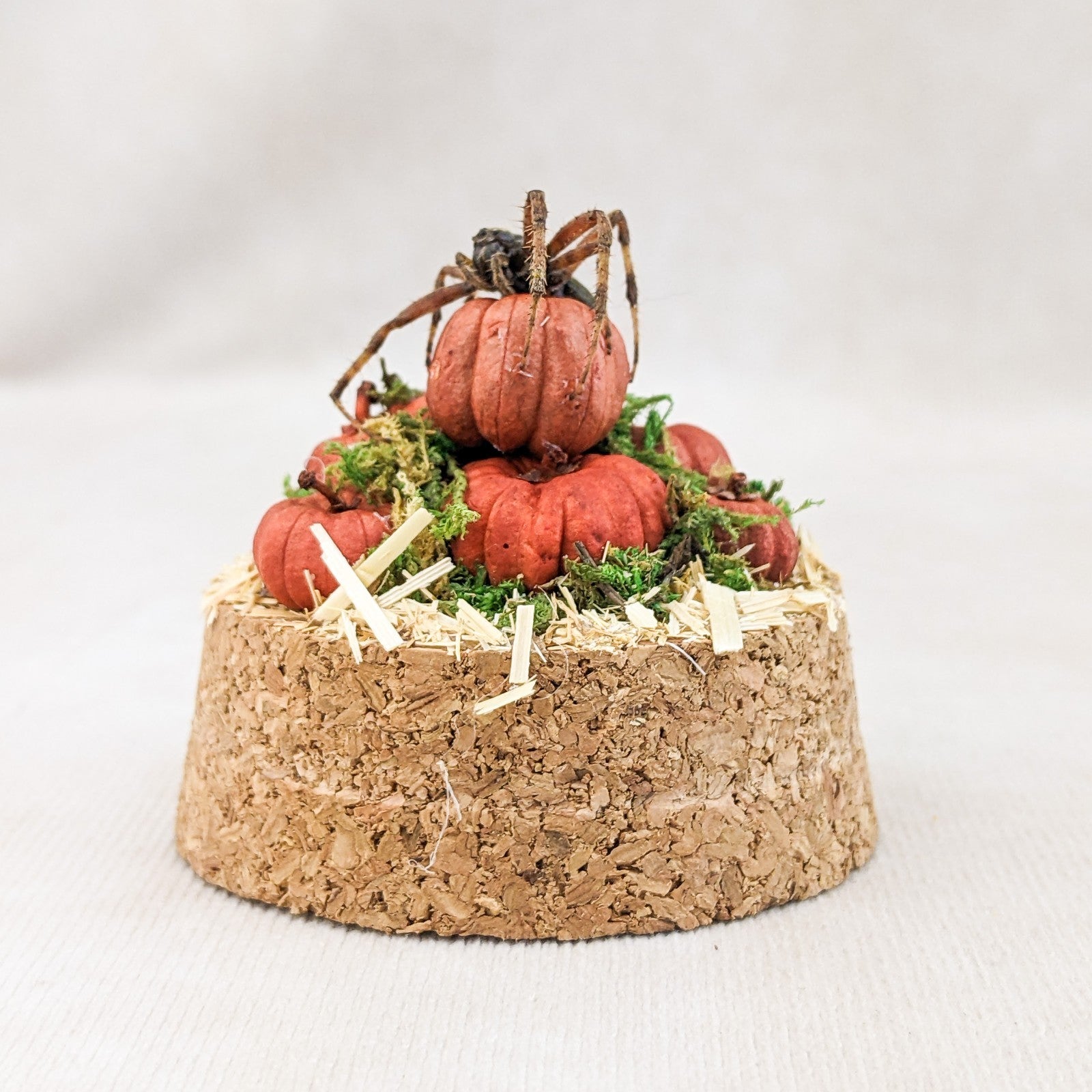 This one-of-a-kind miniature dome features a real spotted orb weaver spider displayed with an autumn harvest theme. The spider is perched elegantly atop a cluster of tiny hand-crafted pumpkins, creeping gracefully as if ready to weave its web. The scene rests on a rustic cork base, with natural moss tucked into the cracks between pumpkins for an added touch of woodland charm. A layer of hay flooring completes the seasonal atmosphere, giving the piece a warm and slightly eerie fall aesthetic.