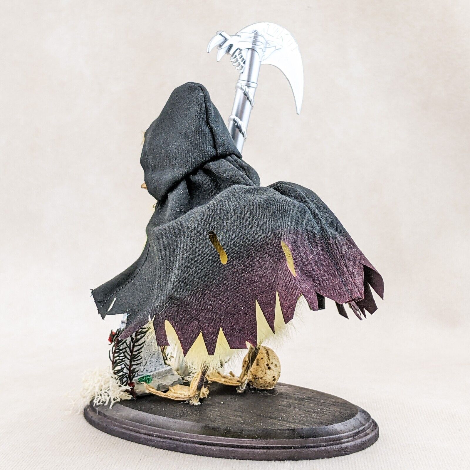 Beware the Grim Squeaker! He is looming over a gravestone, skull, and red real preserved flowers with his deadly scythe while his black robes billow behind...his fluffy fluffy butt. All displayed on a black wood base! The Grim Reaper comes for us all but the Grim Squeaker is only going to go home with one special person who acts fast. Take him home tonight! Display approx: 6 x 6 x 5"