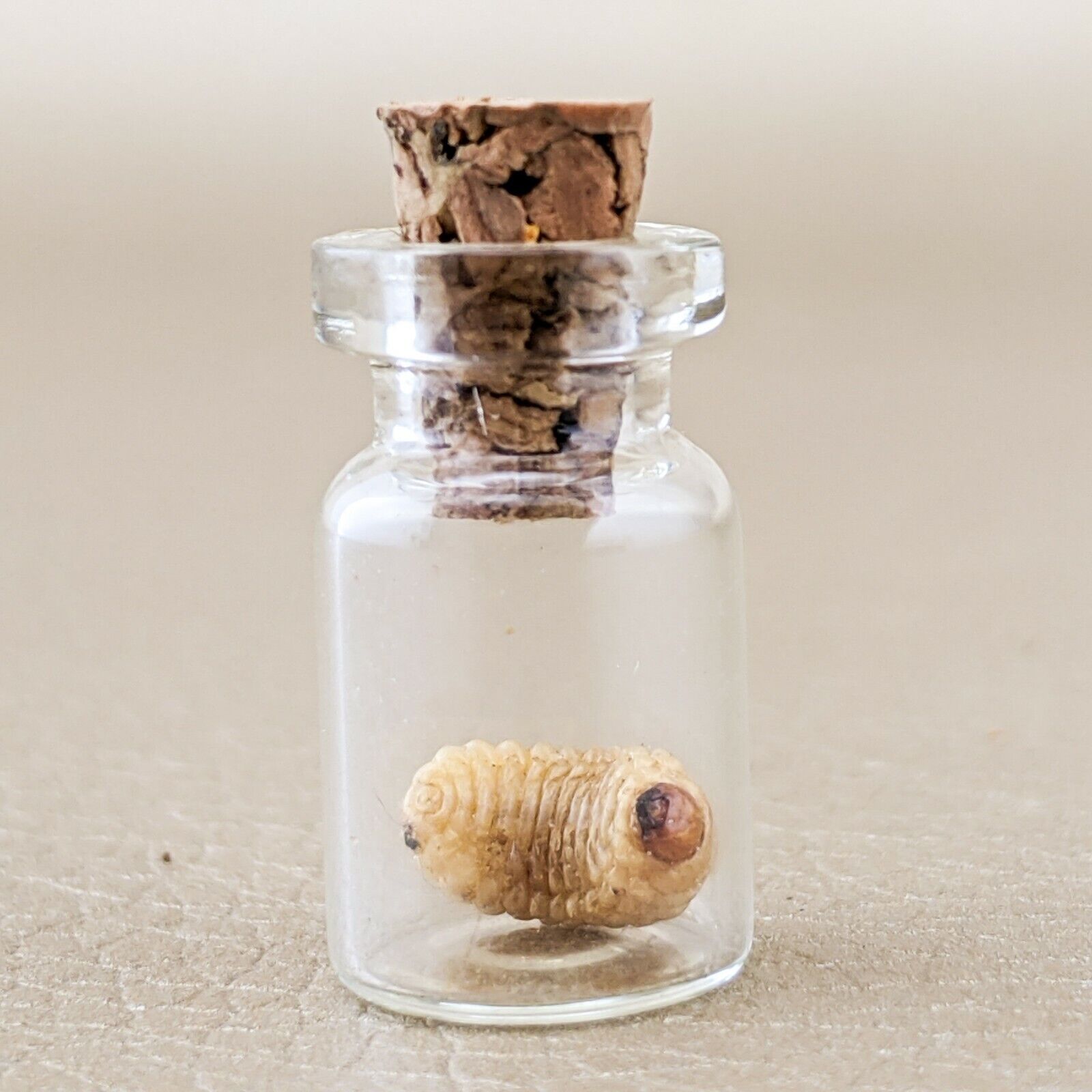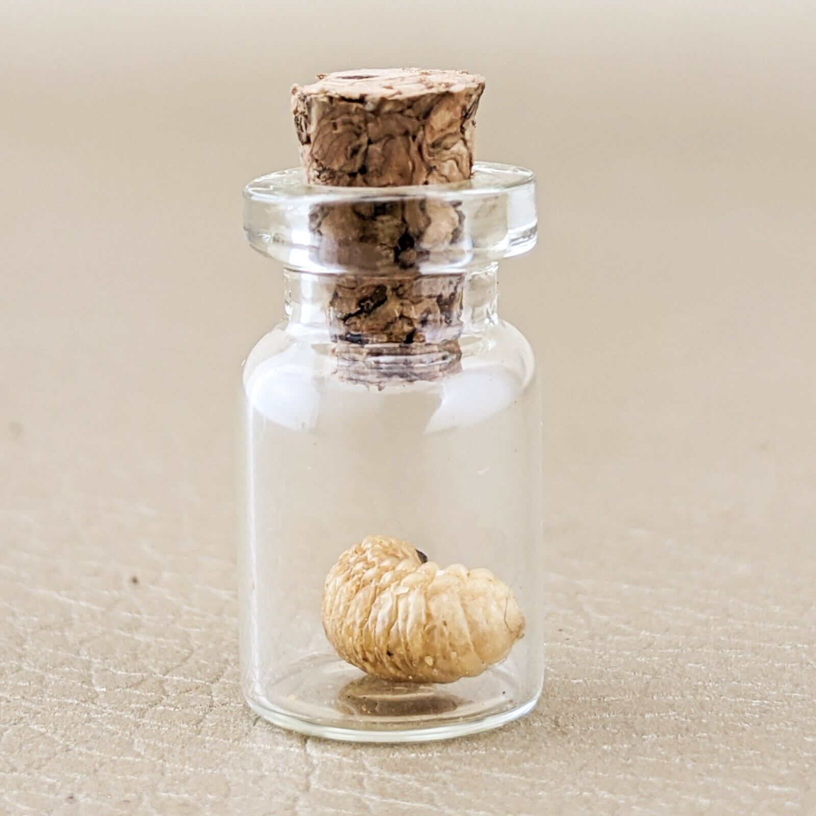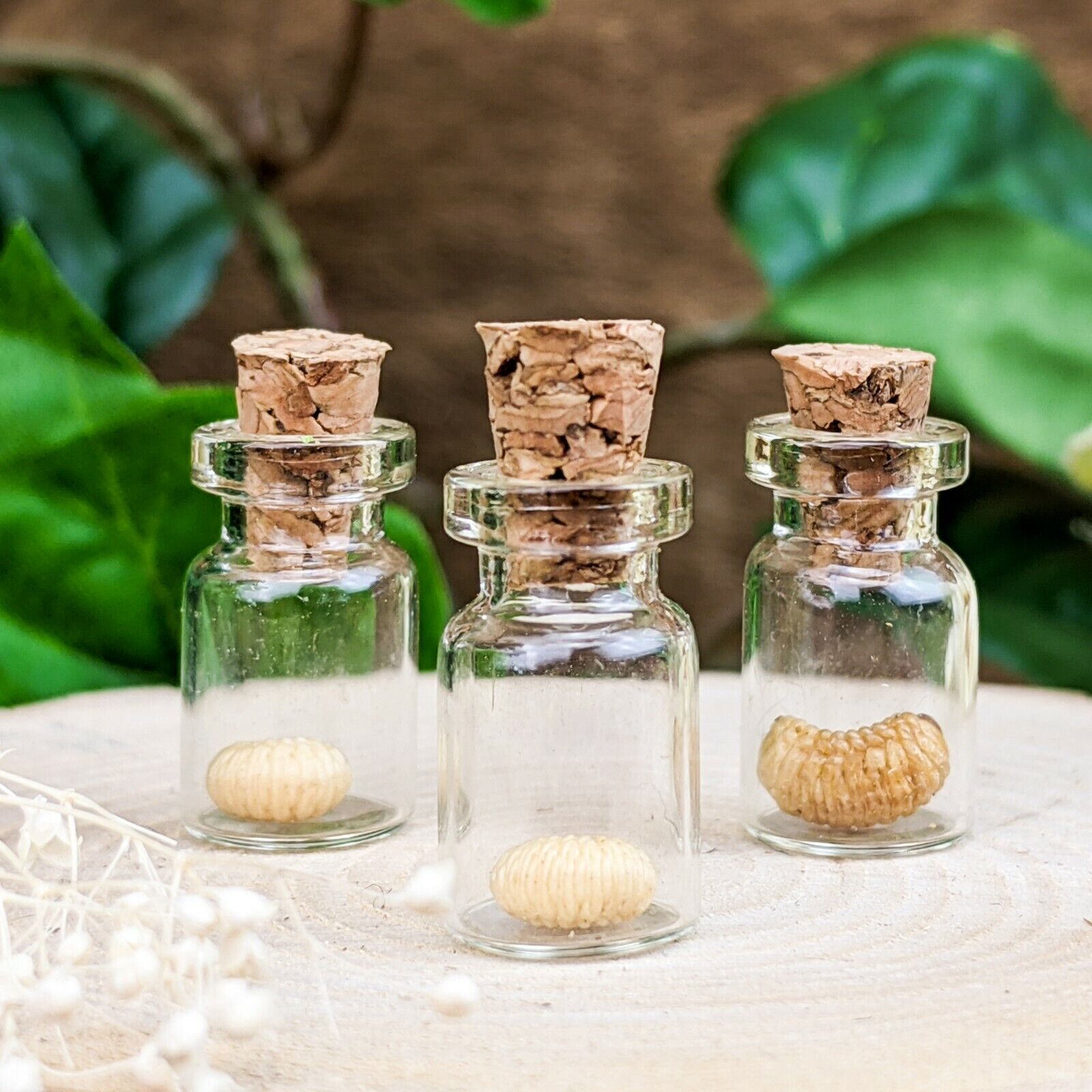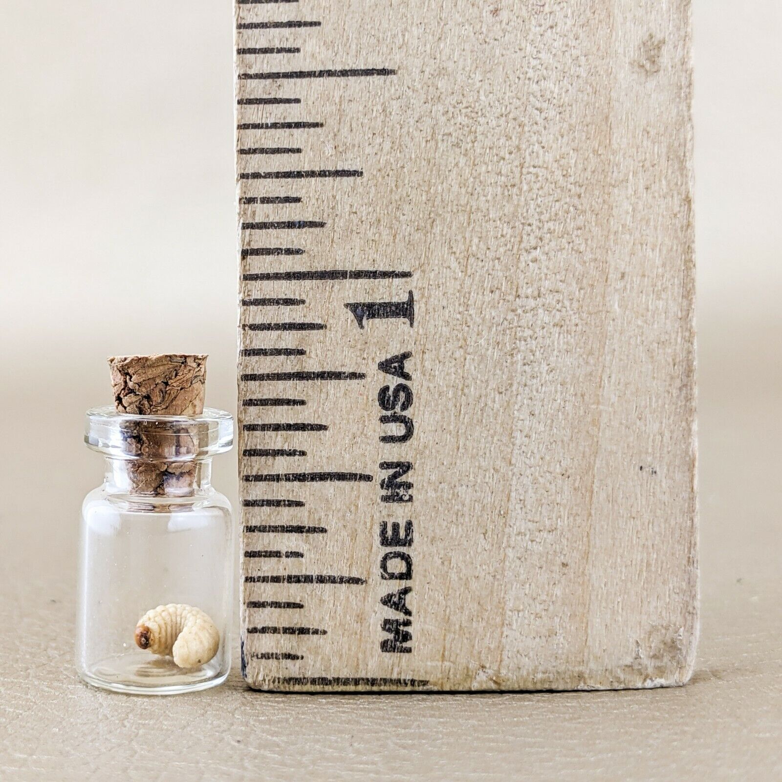 b11 These little guys are precious! Little acorn beetle larvae in a glass specimen jar. Nice start to a collection and great for educational purposes. The display is approx. 3/4 x 1/2" with a cork top that opens so your specimen can be examined.
