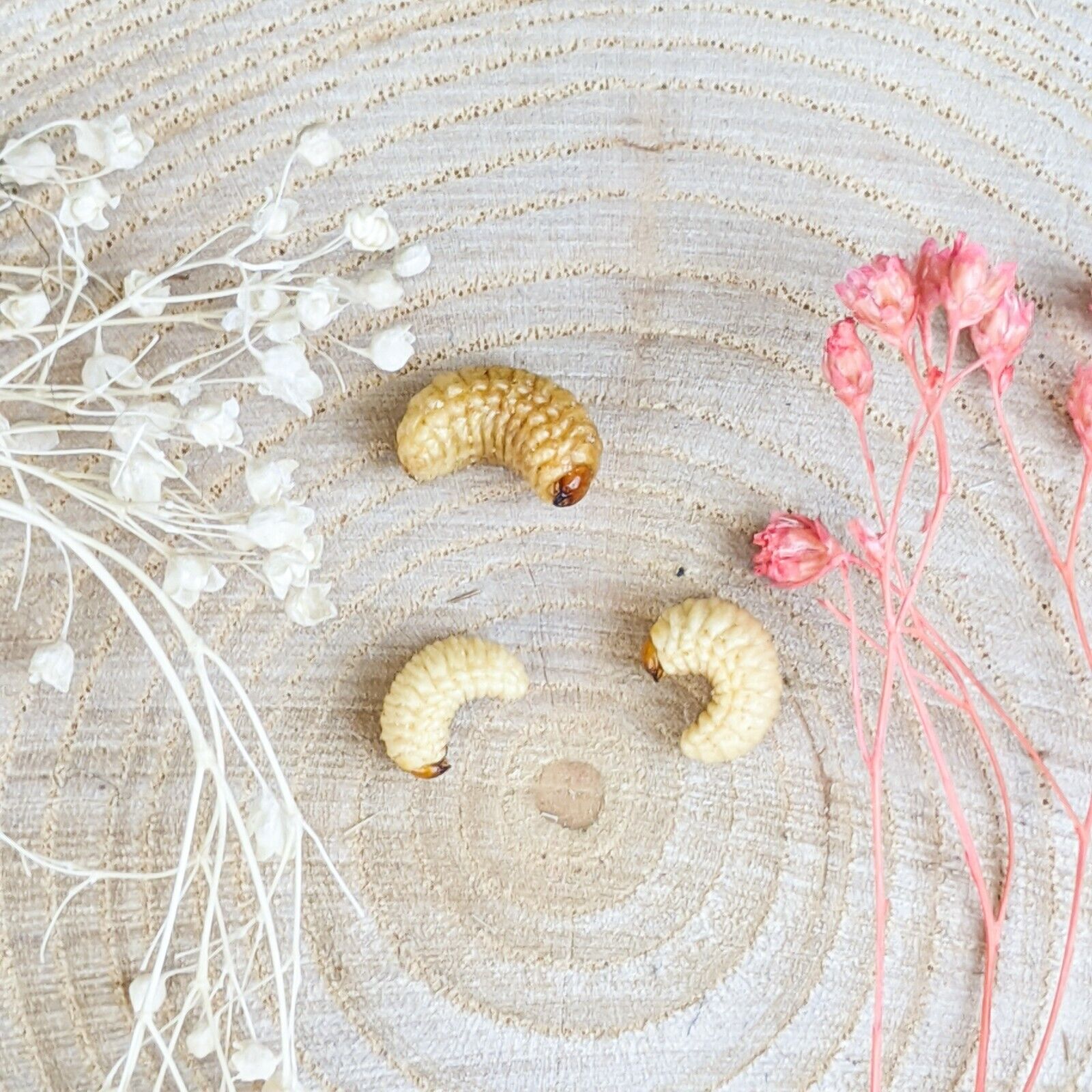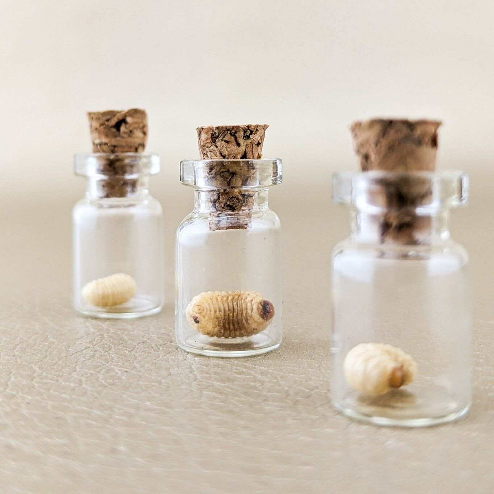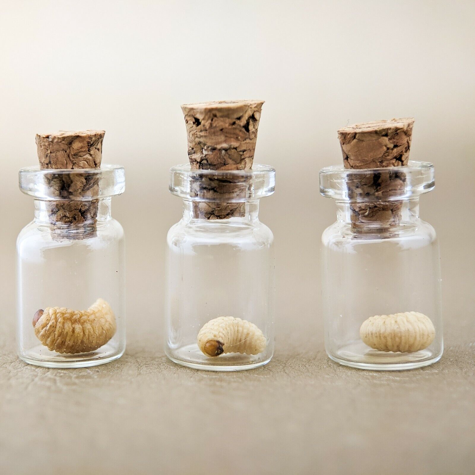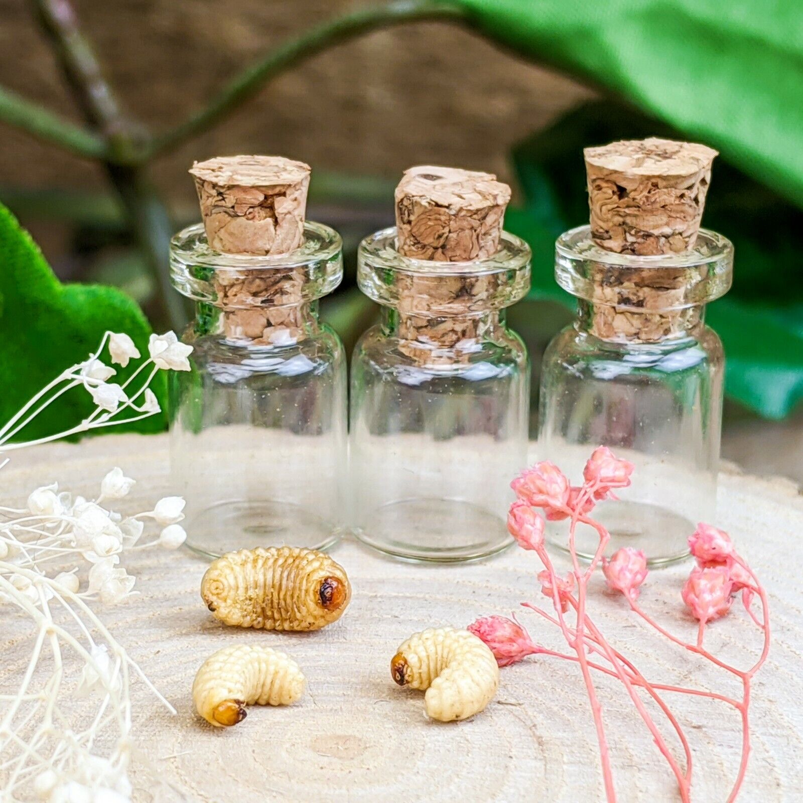 b11 These little guys are precious! Little acorn beetle larvae in a glass specimen jar. Nice start to a collection and great for educational purposes. The display is approx. 3/4 x 1/2" with a cork top that opens so your specimen can be examined.