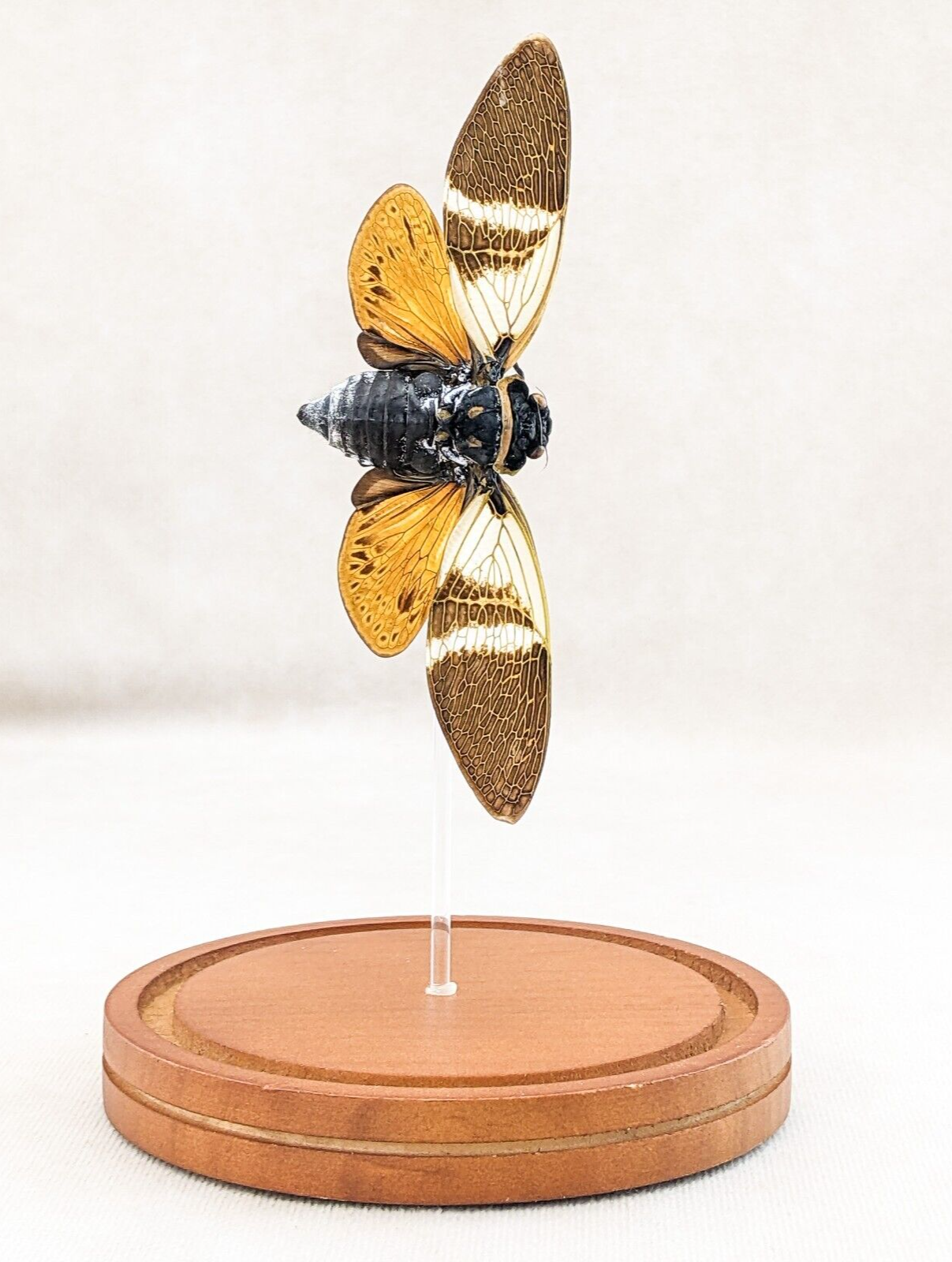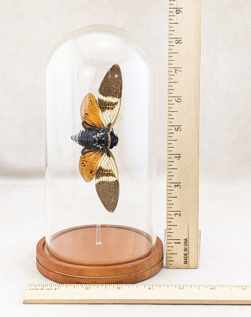 h32b #1.8 This is a beautiful Beautiful Cicada showcased in a large glass dome with wood bottom. These guys are just wonderful and make a gorgeous statement where ever they sit! The dome display is approx. 8 1/2 x 4 1/2" and would look great in any collection or for educational purposes. Your specimen will stay clean and safe for years to come!