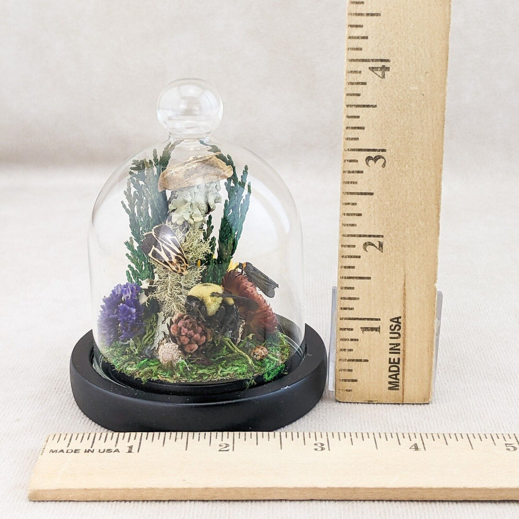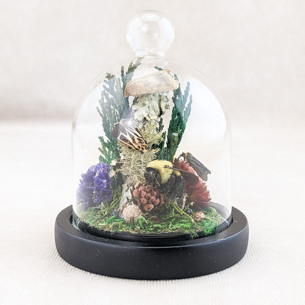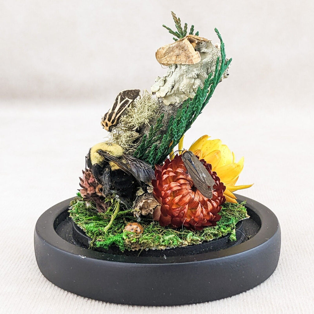 These displays are beautiful! This is a glass dome display showcasing a beautiful collection of moths along with a bumble bee!