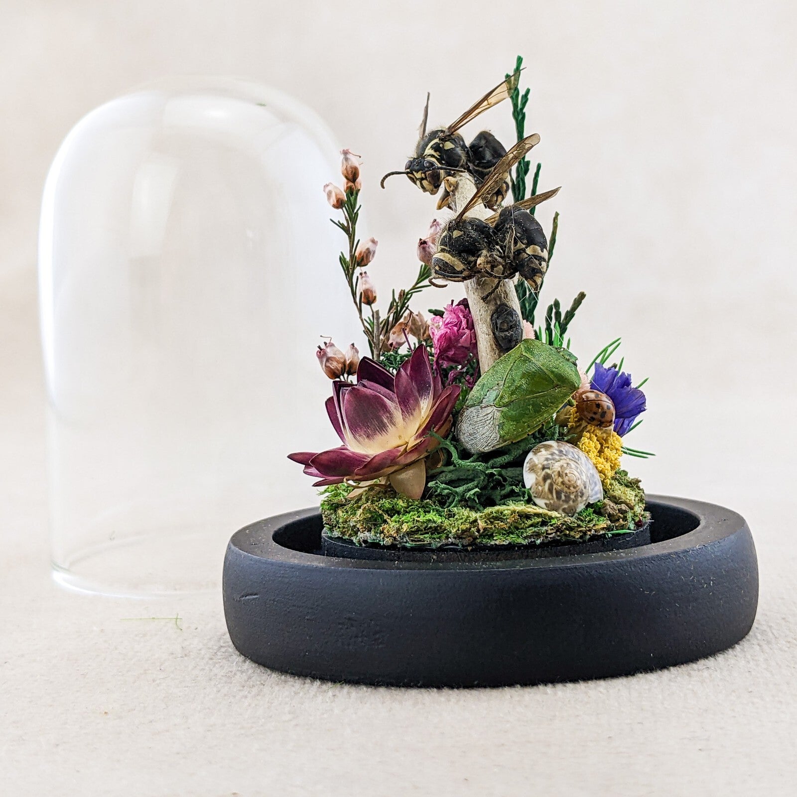 x59x  #4  These displays are beautiful!  This is a great little glass dome display showcasing two Bald Faced Hornets and a Green stink bug ! It is done in the fashion of the Victorian Era using only natural items.   This style enhances the beauty of the subject and presents it in a natural surrounding with all natural elements.  They are surrounded by real dried foliage, bark, flowers, moss, etc. and lichen with a real snail and ladybug.   This would make a great learning/teaching tool, and fit into any collection! These are great gifts and wonderful little displays!  Overall, this display is approximately 3 1/2 x 2 3/4".  Please check out the pictures as they are part of the description and this is the one you will be receiving.