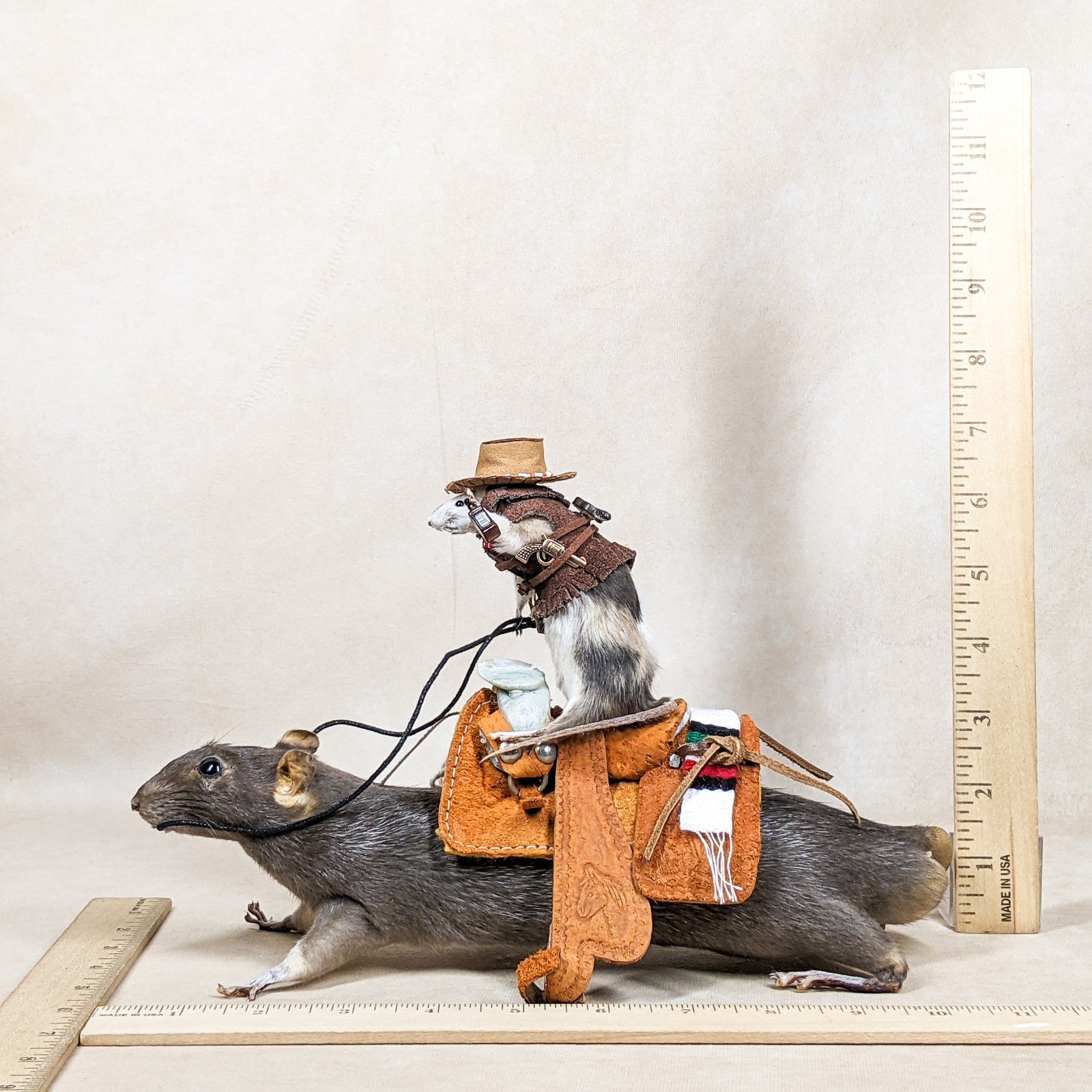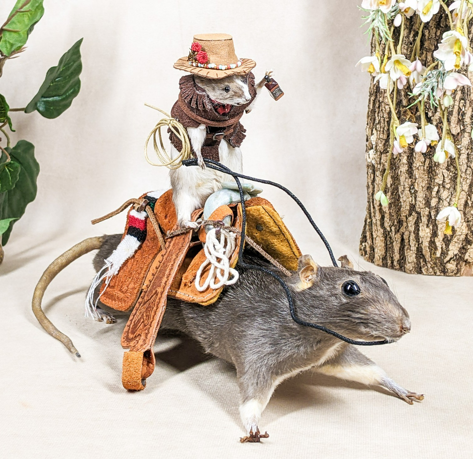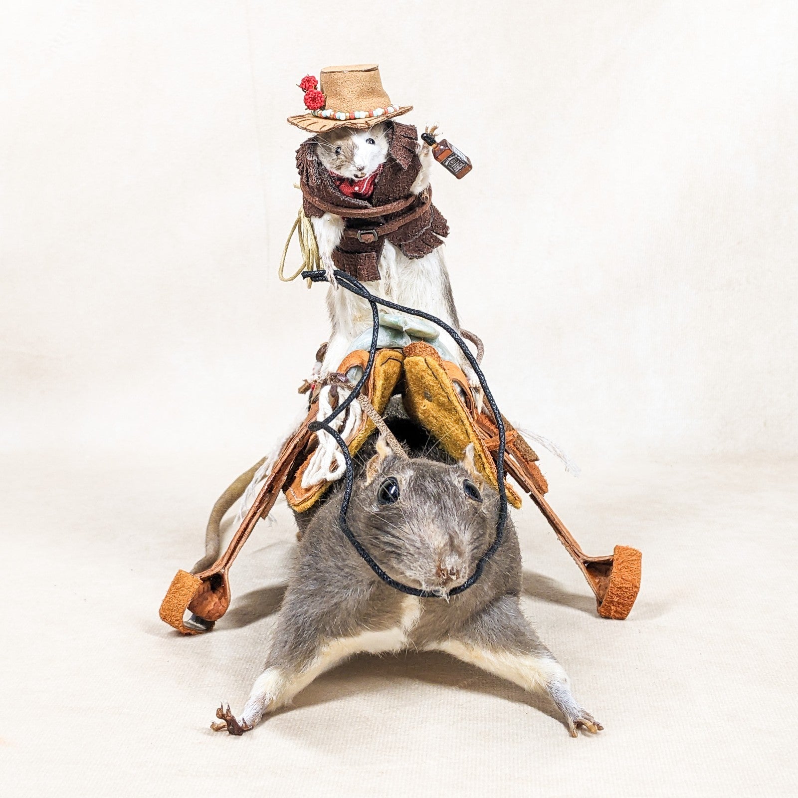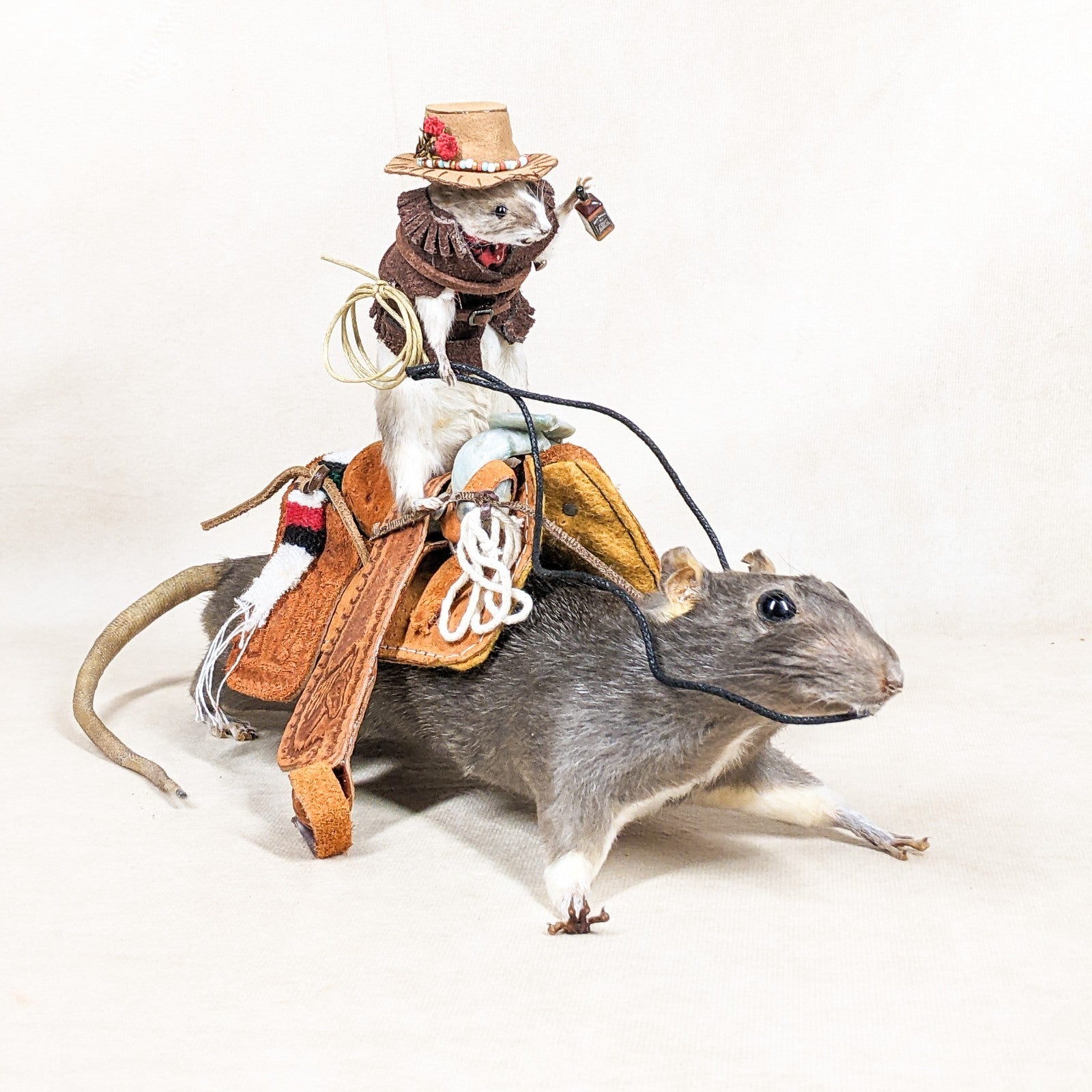 This little cowboy is SO CUTE! Ole Thomas McSwiss says, "YEEEEHAWWW!" and he'll fill ya full of holes. He's sporting his cowboy hat, lasso, bandana, guitar, whiskey, western saddle, gun and gunbelt and of course his trusty steed, Cheddar the large rat! Better take him home before this boot moseys on back to the ranch! Display is approx. " 11 x 7 x 6".