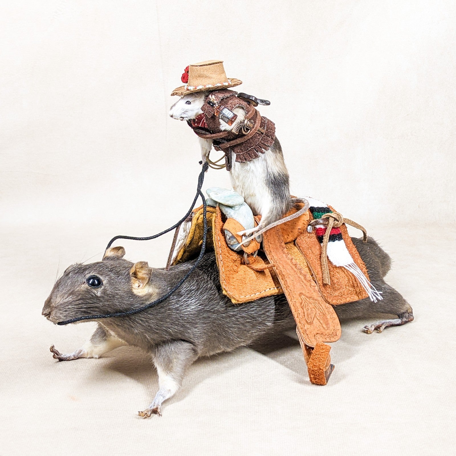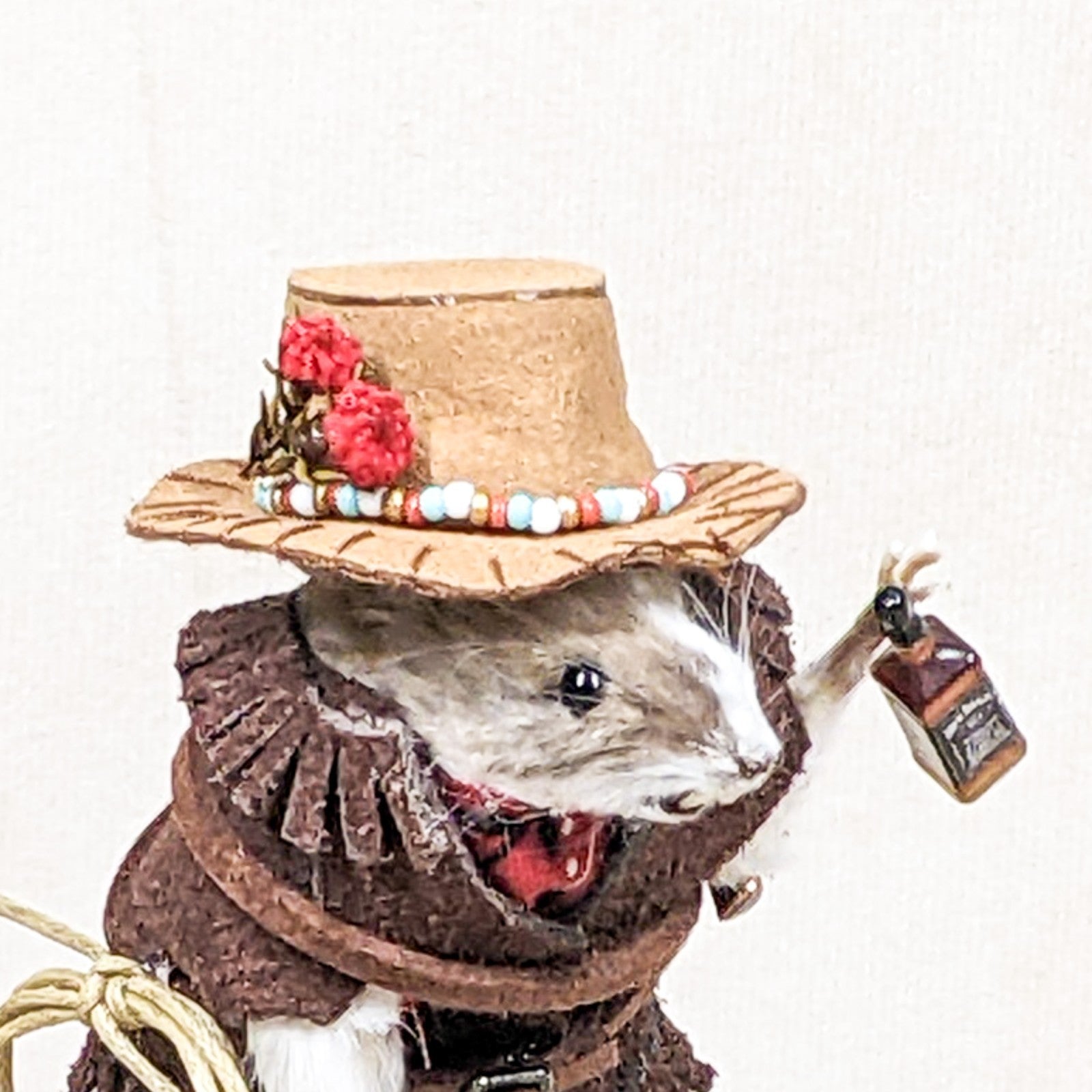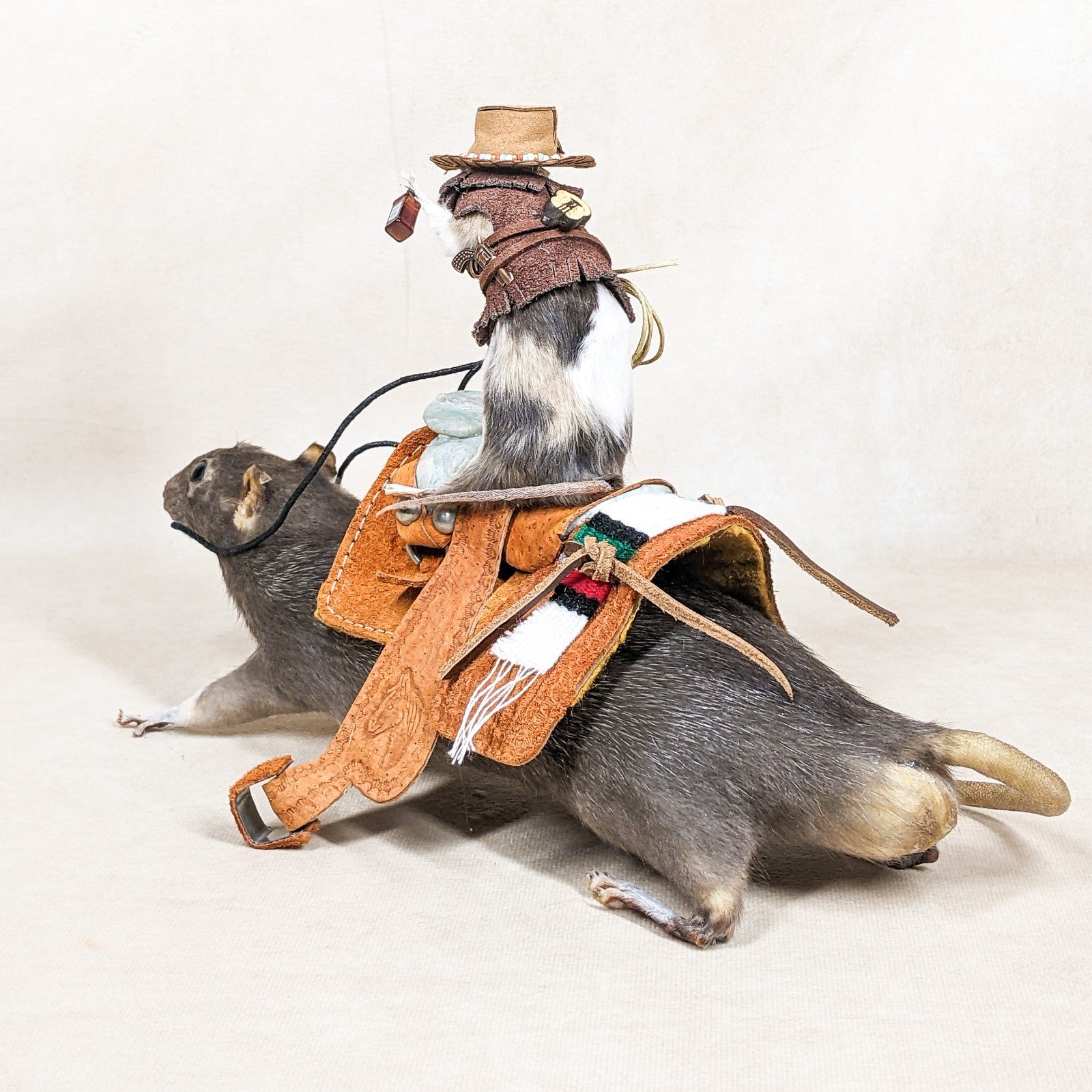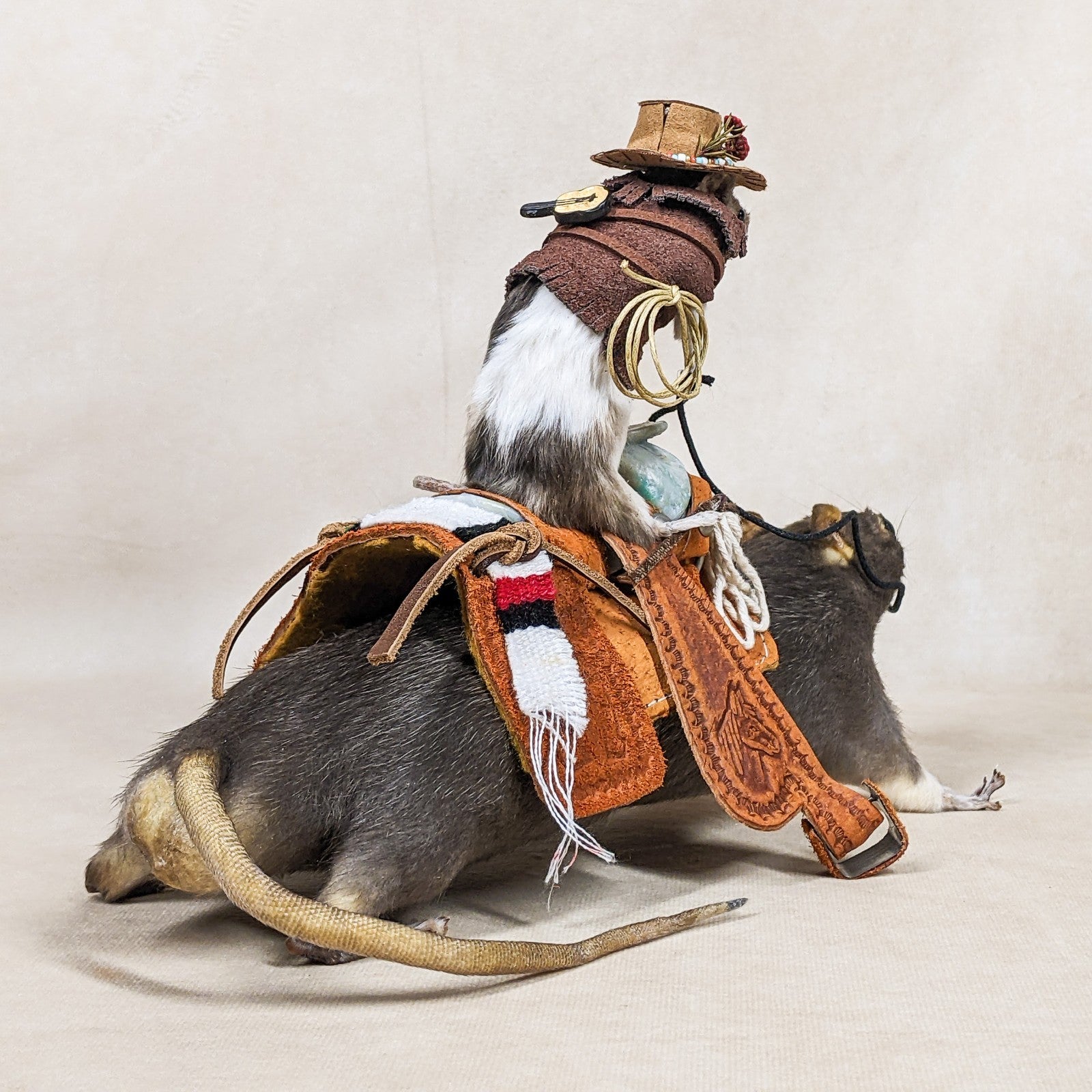 This little cowboy is SO CUTE! Ole Thomas McSwiss says, "YEEEEHAWWW!" and he'll fill ya full of holes. He's sporting his cowboy hat, lasso, bandana, guitar, whiskey, western saddle, gun and gunbelt and of course his trusty steed, Cheddar the large rat! Better take him home before this boot moseys on back to the ranch! Display is approx. " 11 x 7 x 6".