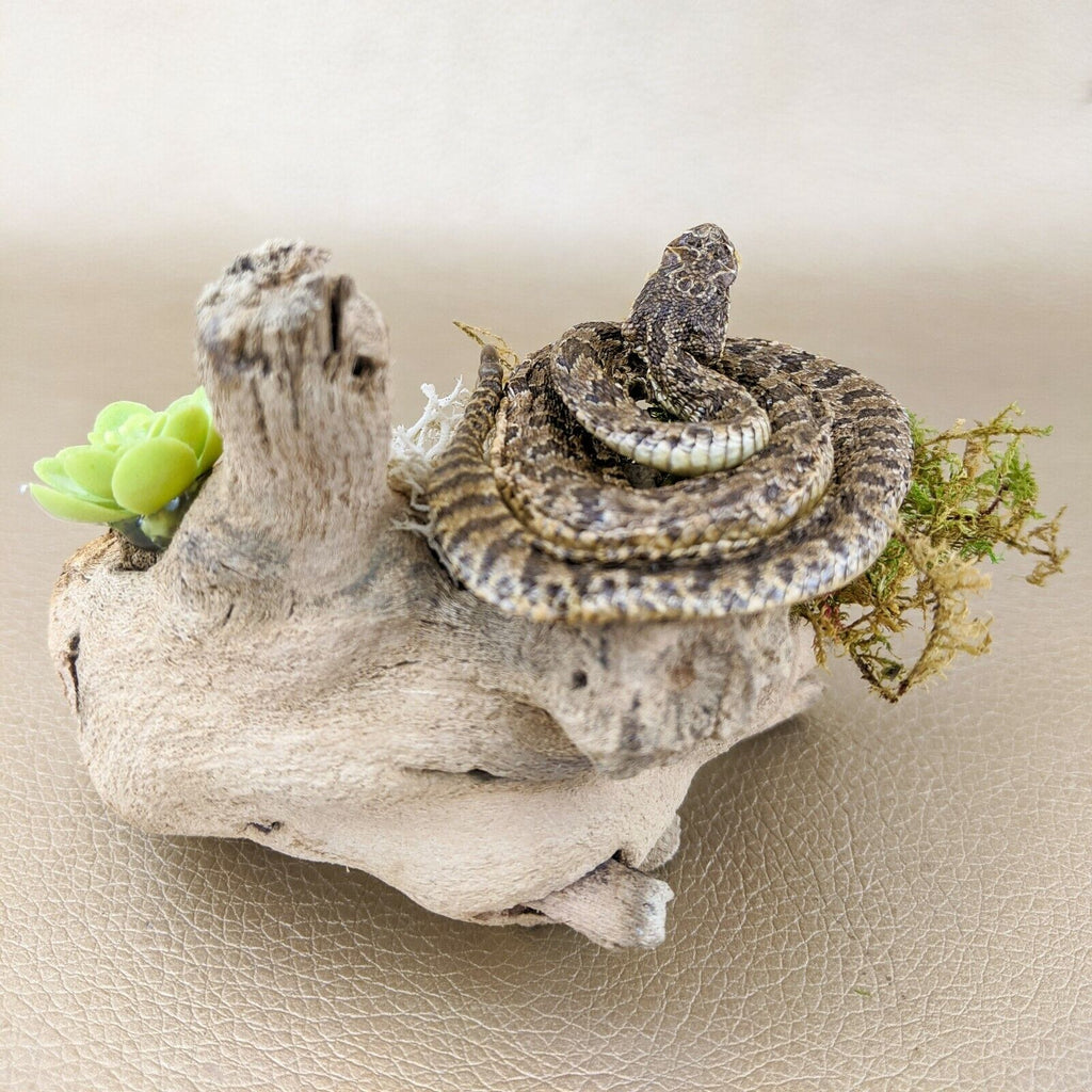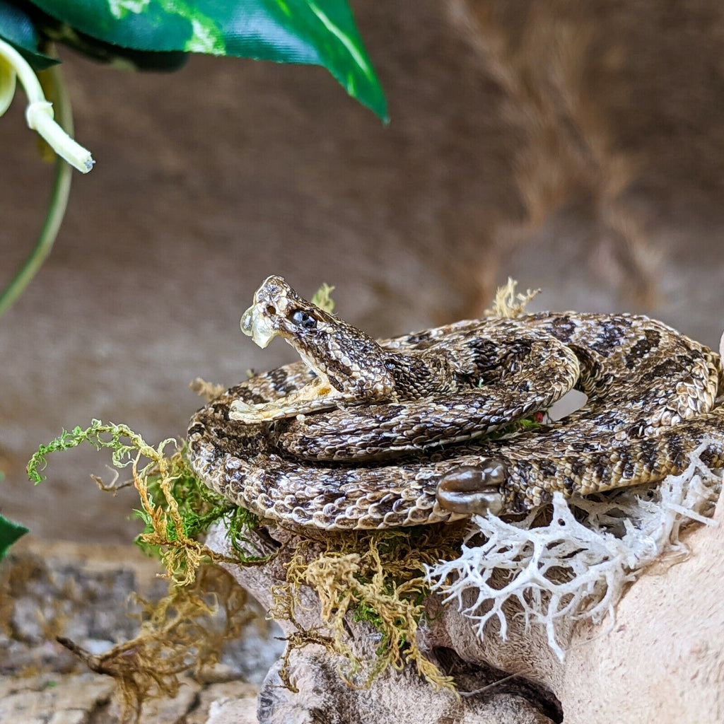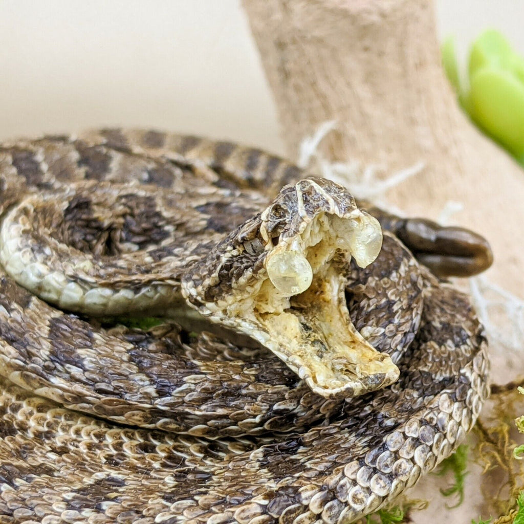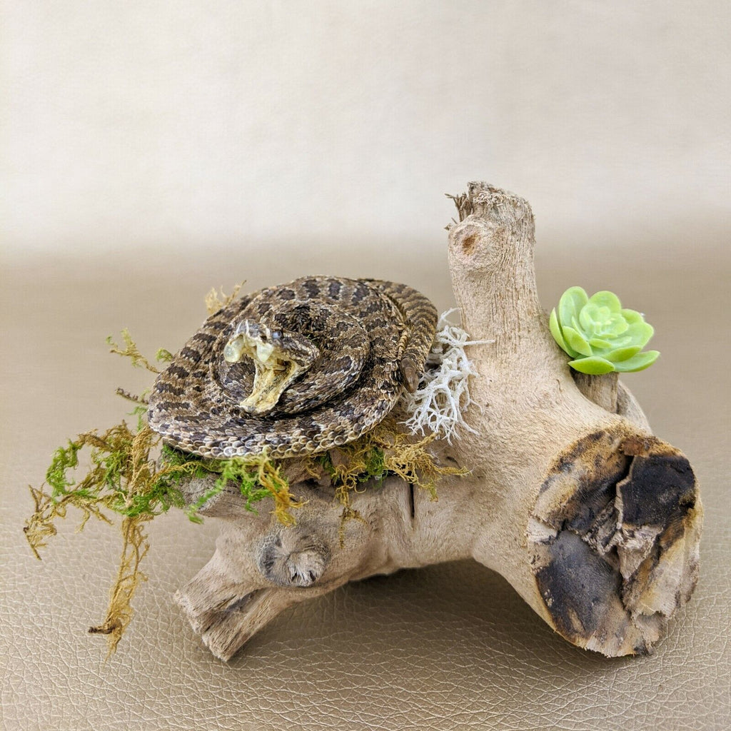 Check out this beautiful lil' rattlesnake display! The snake is curled up with his fangs showing and perched on a piece of wood! The dome is removable as is the display itself.
