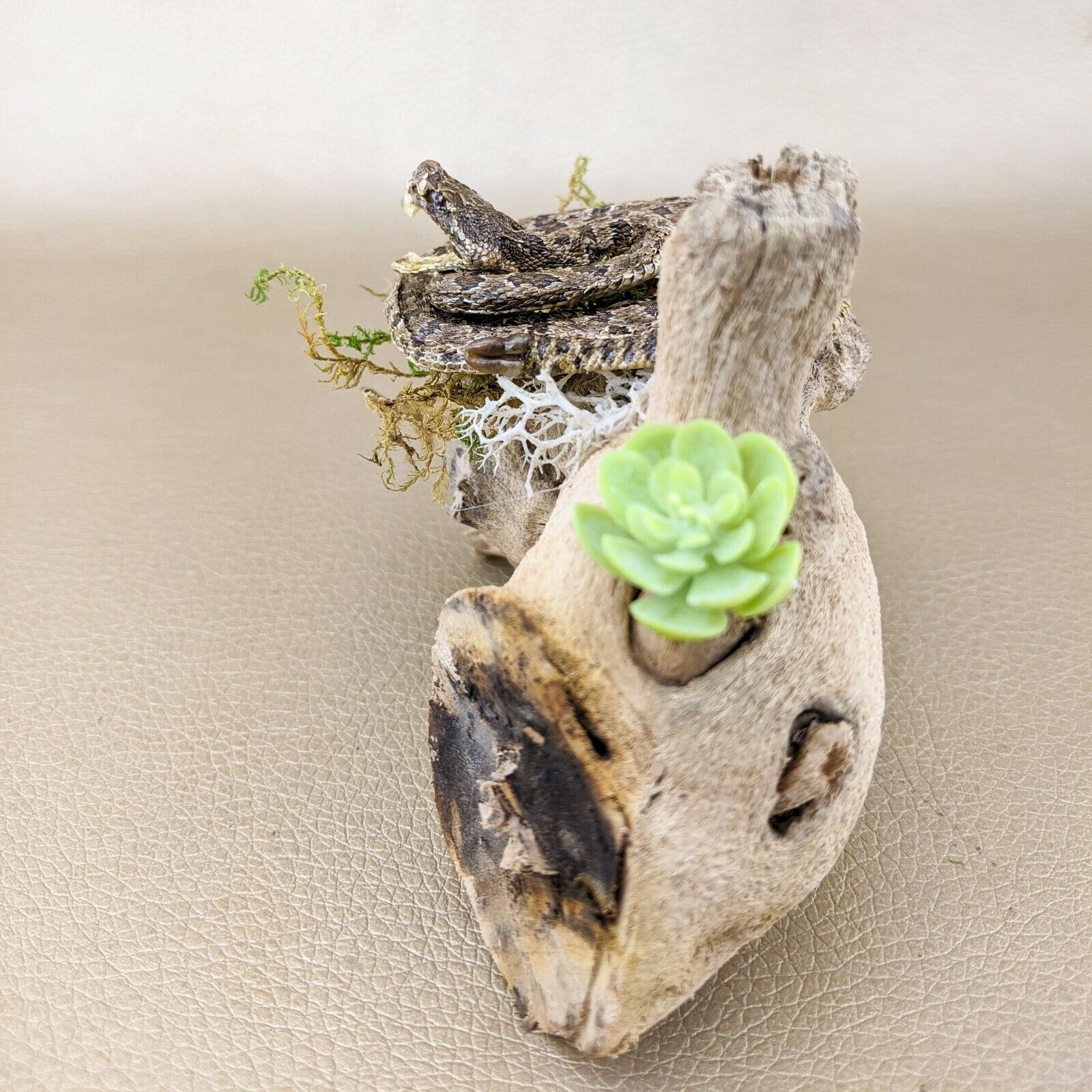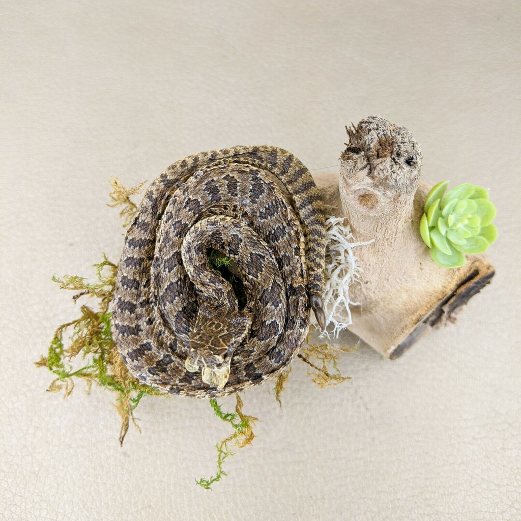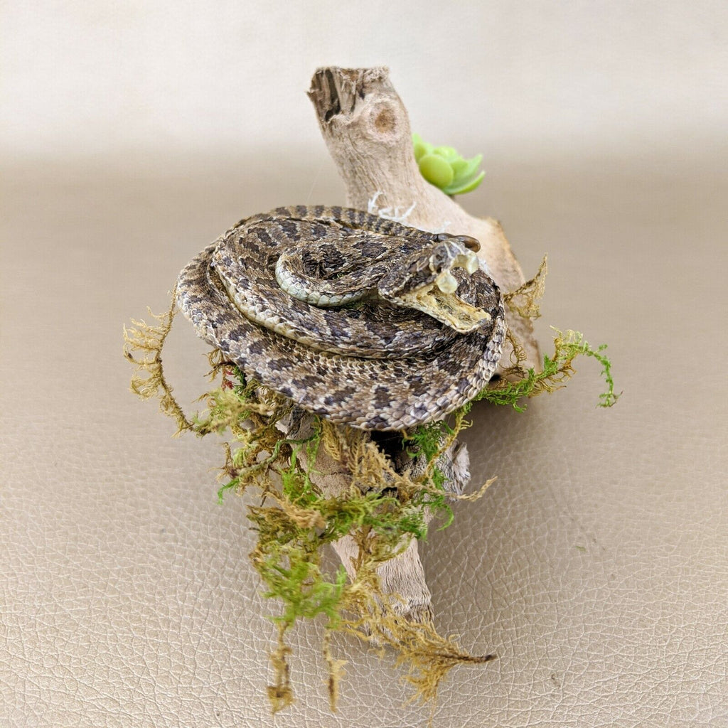 Check out this beautiful lil' rattlesnake display! The snake is curled up with his fangs showing and perched on a piece of wood! The dome is removable as is the display itself.