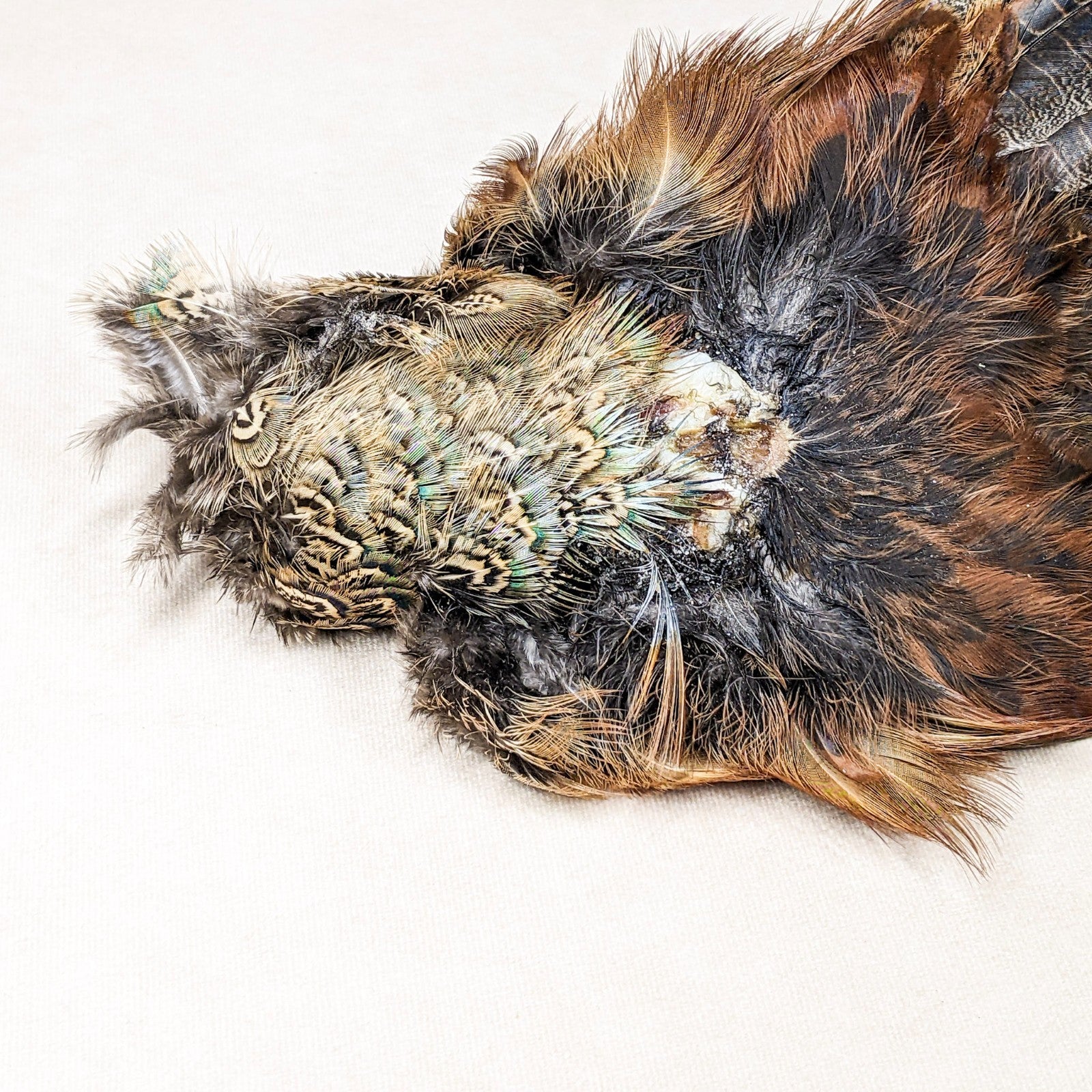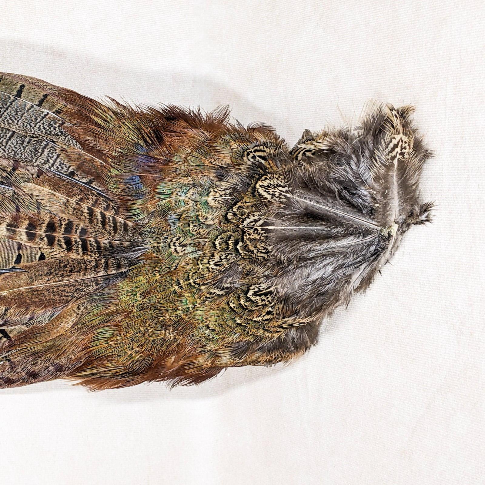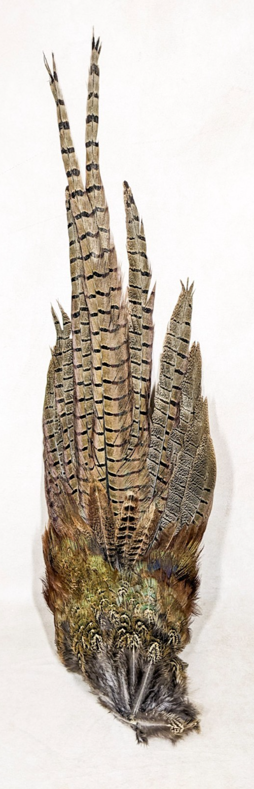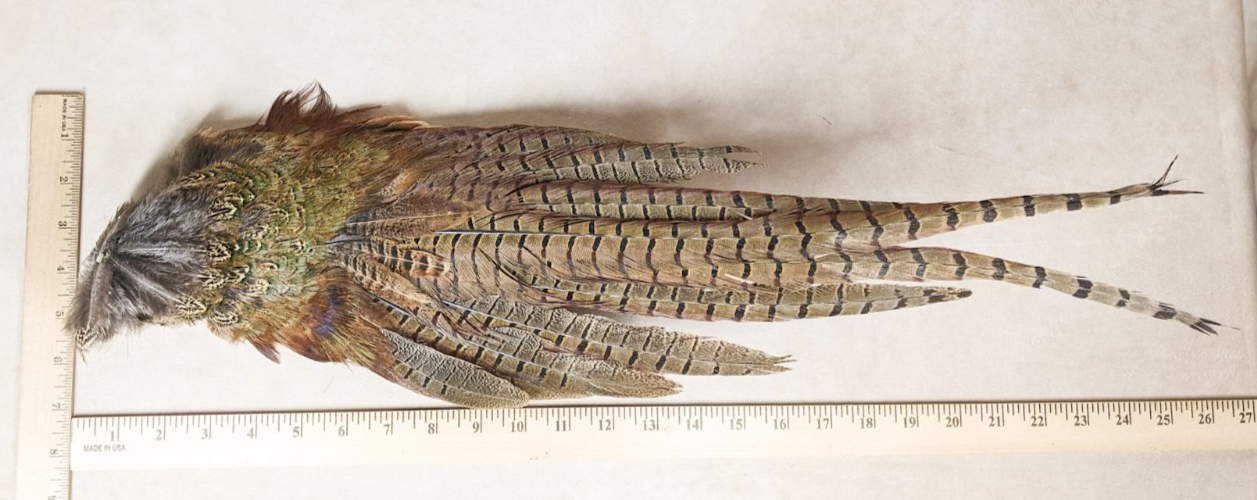 This 28" Ringneck Pheasant Tail clump is sourced from a ringneck pheasant, in the United States. It is commonly used for bird crafts, taxidermy repair, art projects, theater,  and other curious oddities. The item is  also ideal for those interested looking to add a unique piece to their collection of oddities and curiosities. This tail feathers offer a visually striking and authentic addition to various crafting projects.