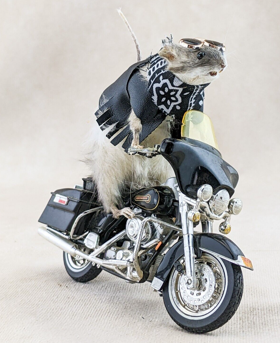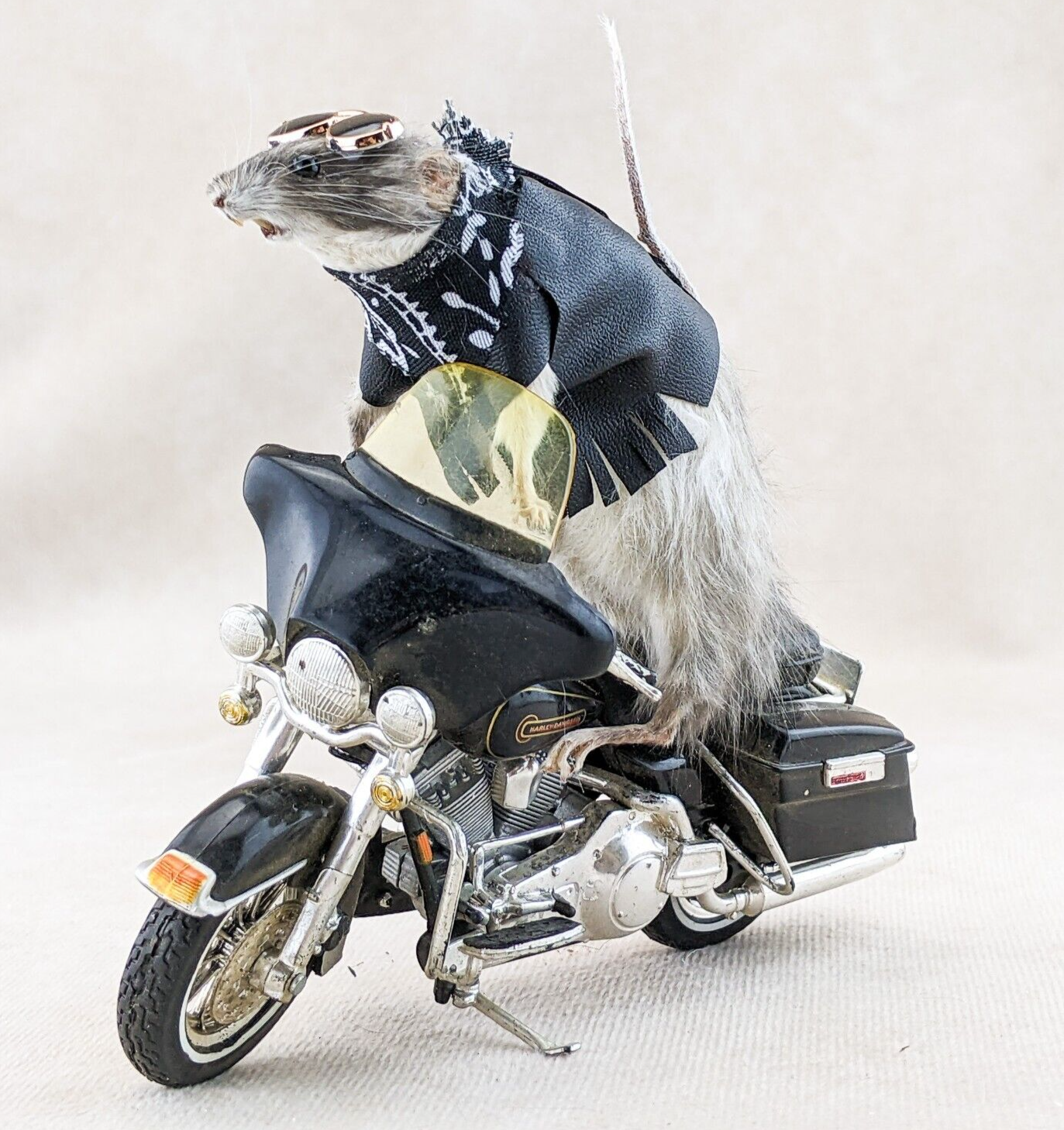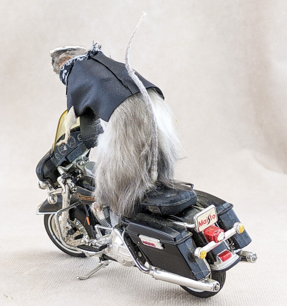 A37c #6 Taxidermy Mouse Motorcycle Rider! "Max" is ready for action! He is on his bike and ready to go. He is riding his black cycle and has his black bandanna and shades. He is in Illinois so there is no helmet law! He measures is approximately 5" x 4 1/2" x 2" and sits up using the bike's kickstand. This makes a great gift for the local motorcycle club or the rider in your family!