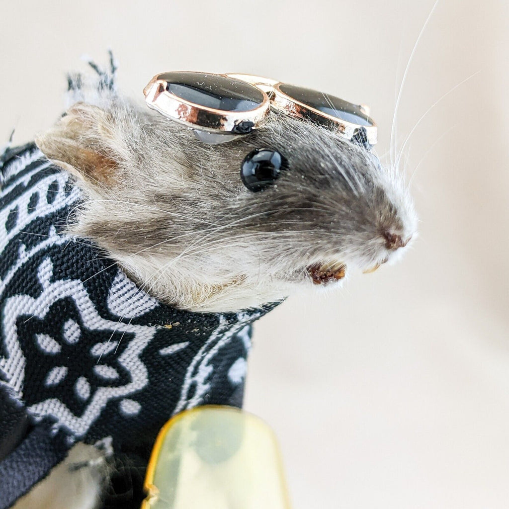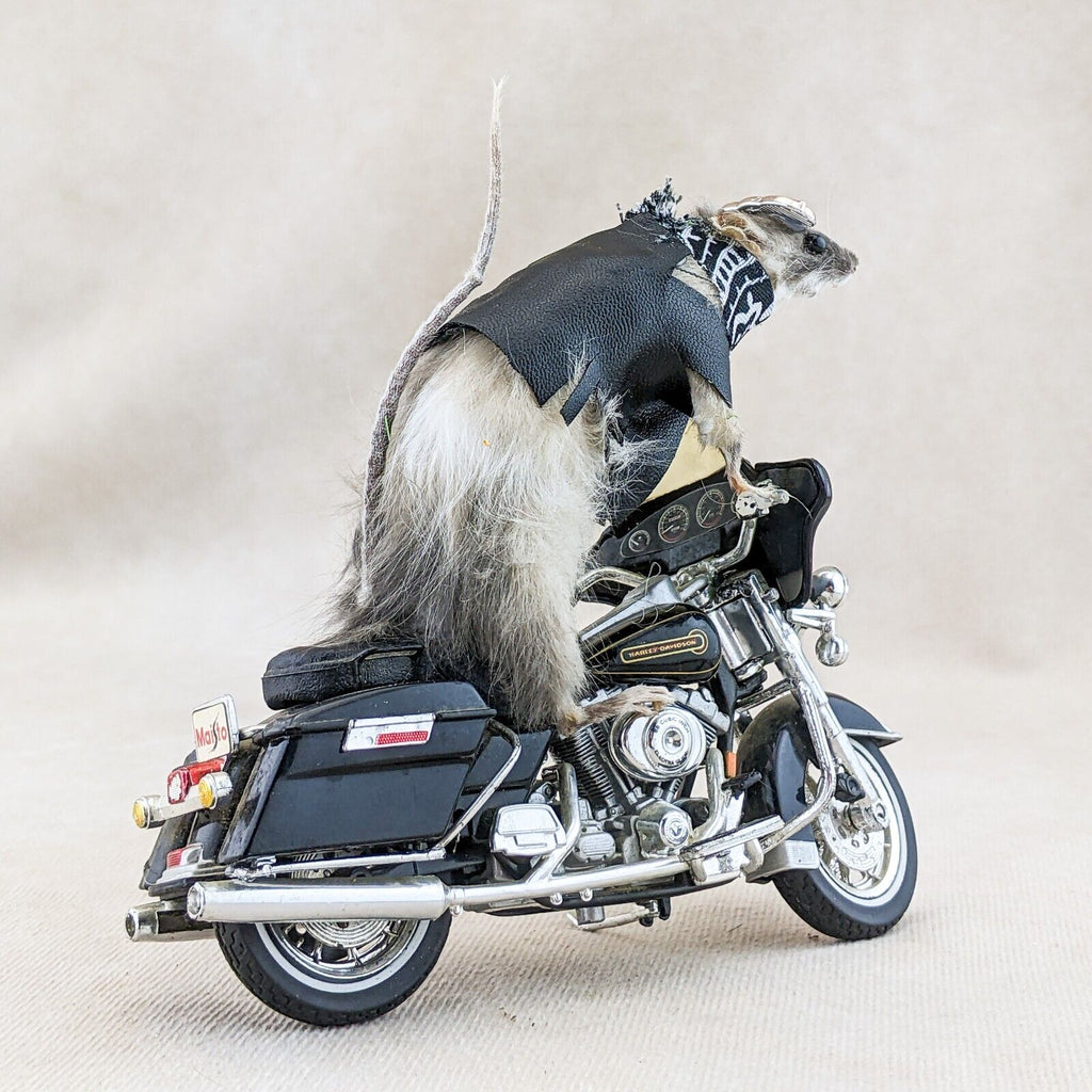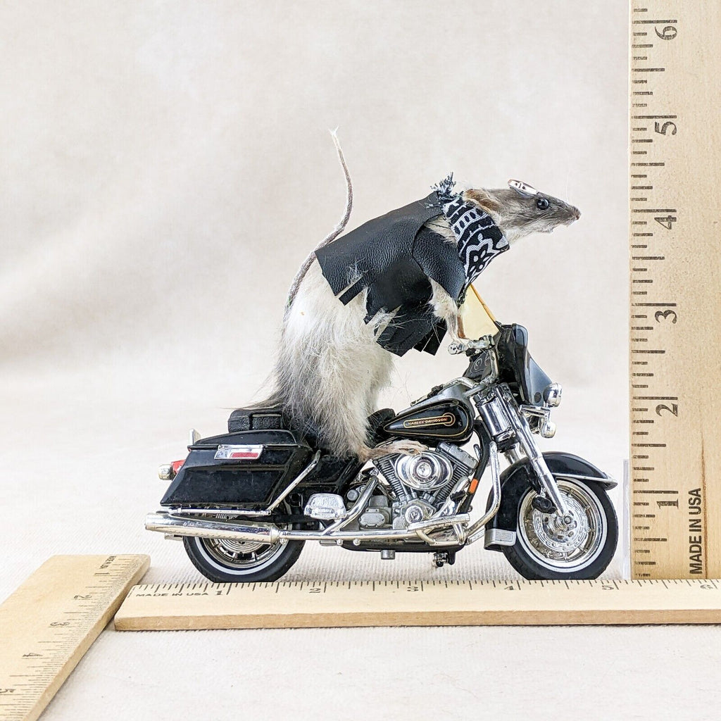 A37c #6 Taxidermy Mouse Motorcycle Rider! "Max" is ready for action! He is on his bike and ready to go. He is riding his black cycle and has his black bandanna and shades. He is in Illinois so there is no helmet law! He measures is approximately 5" x 4 1/2" x 2" and sits up using the bike's kickstand. This makes a great gift for the local motorcycle club or the rider in your family!