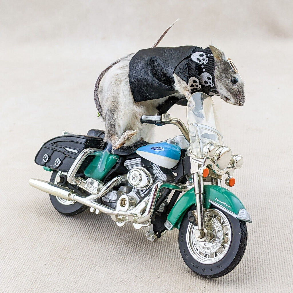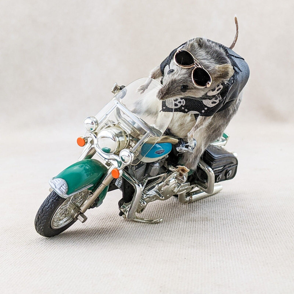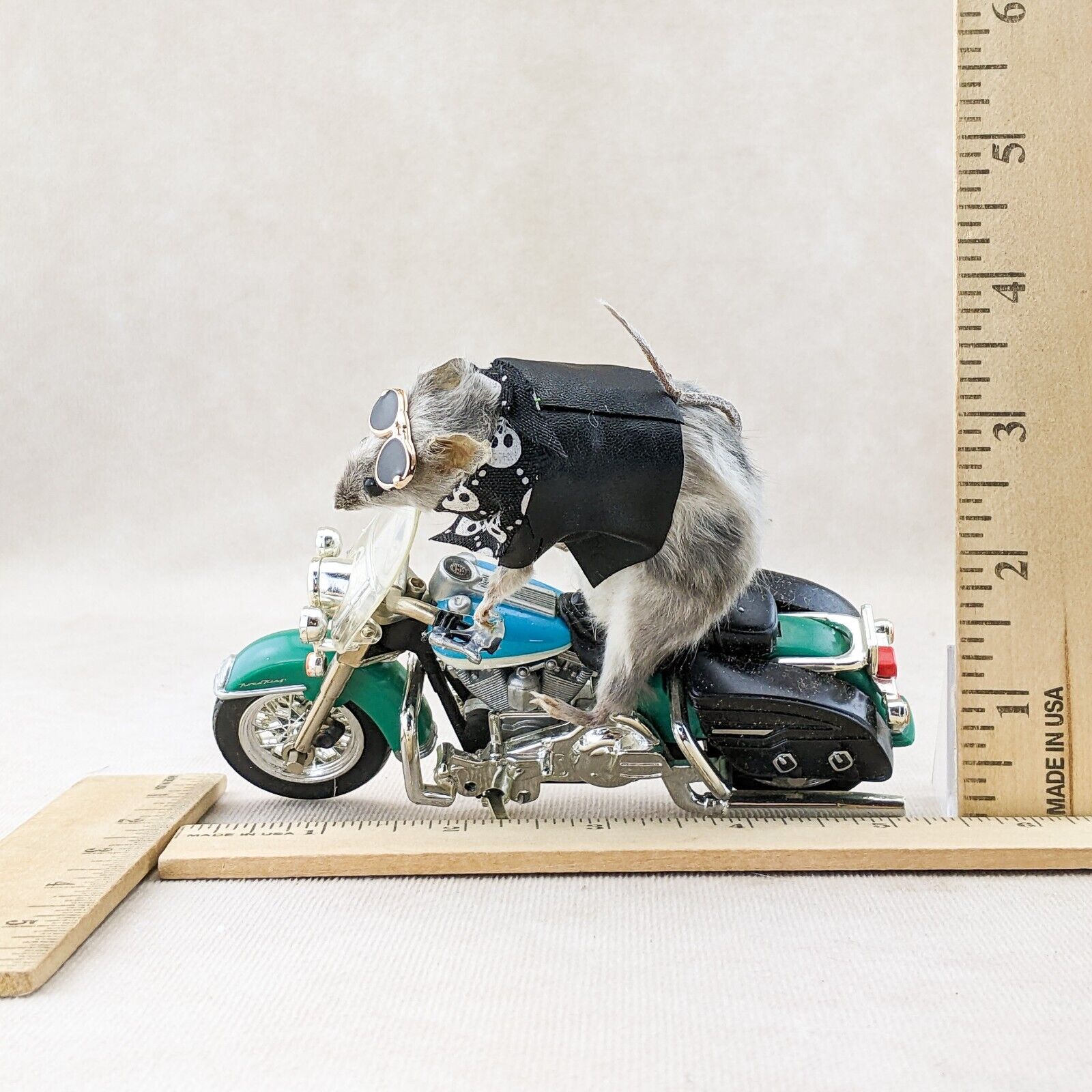 A37h #8 Taxidermy Mouse Motorcycle Rider!  "Max" is ready for action!  He is on his bike and ready to go.  He is riding his black/grey cycle, has his black skull bandanna, his black leather vest and his gold rimmed aviator shades for extra style!  He is in Illinois so there is no helmet law! He measures is approximately 4" x 5" x 2" and sits up using the bike's kickstand. This makes a great gift for the local motorcycle club or the rider in your family!