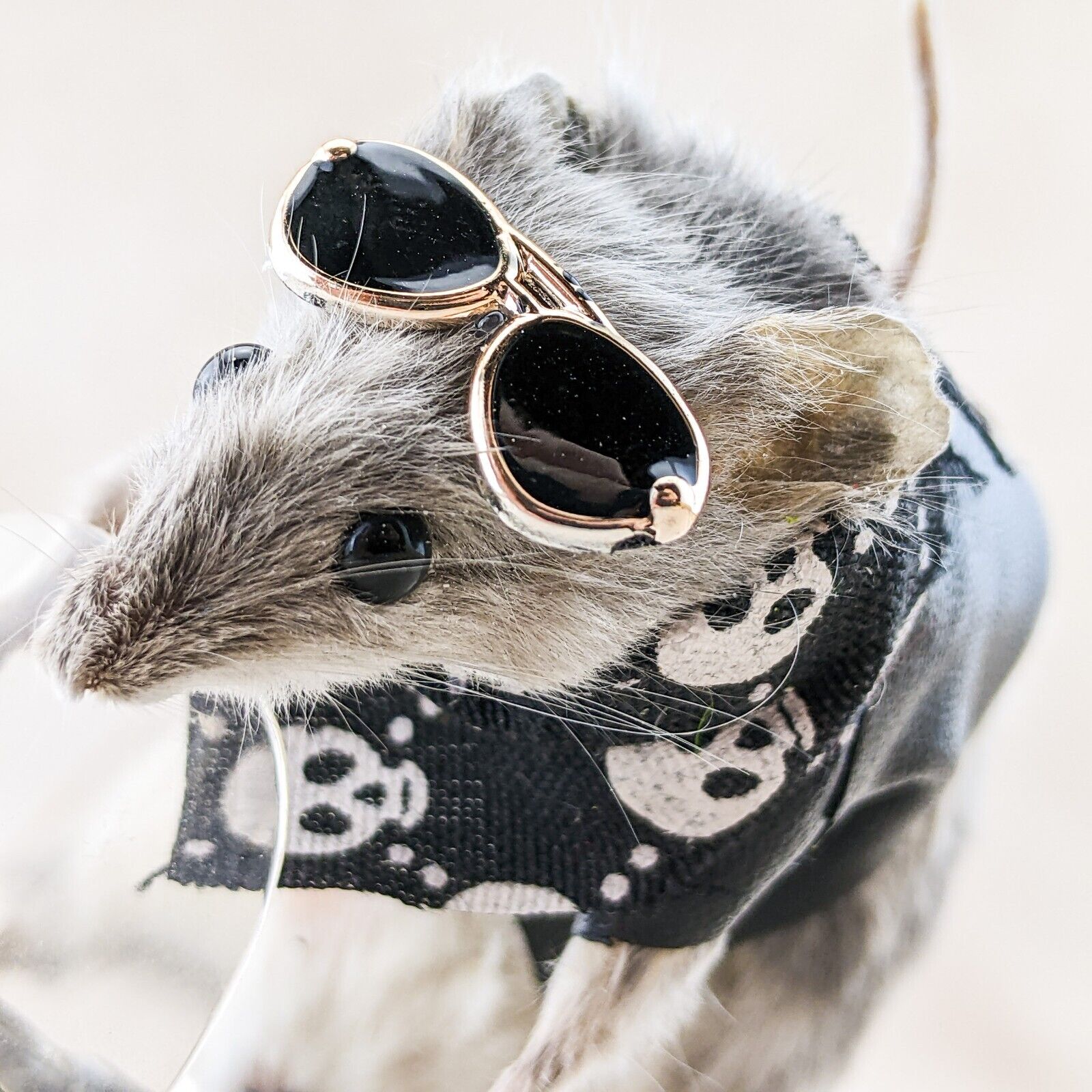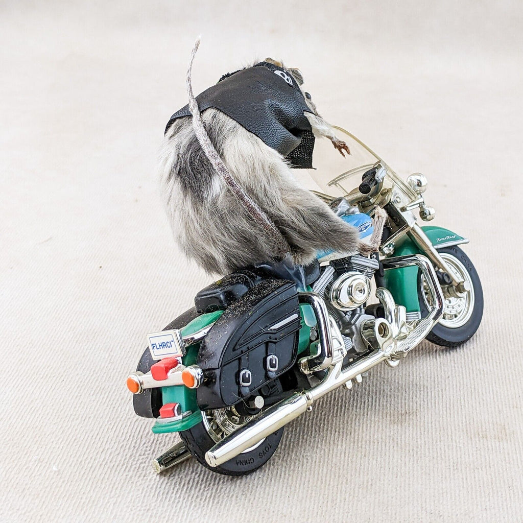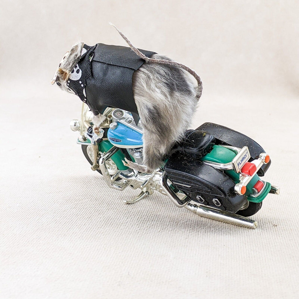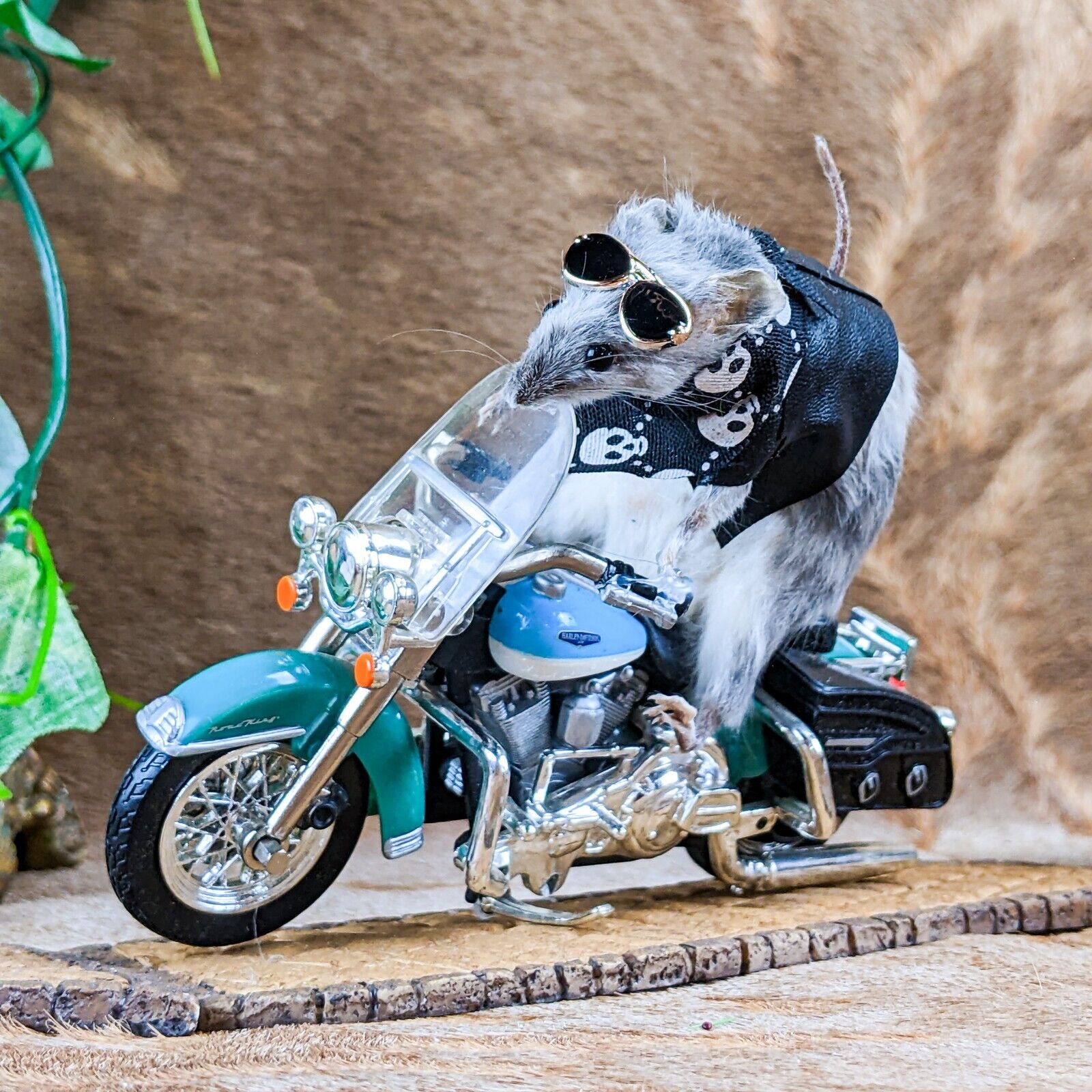 A37h #8 Taxidermy Mouse Motorcycle Rider!  "Max" is ready for action!  He is on his bike and ready to go.  He is riding his black/grey cycle, has his black skull bandanna, his black leather vest and his gold rimmed aviator shades for extra style!  He is in Illinois so there is no helmet law! He measures is approximately 4" x 5" x 2" and sits up using the bike's kickstand. This makes a great gift for the local motorcycle club or the rider in your family!